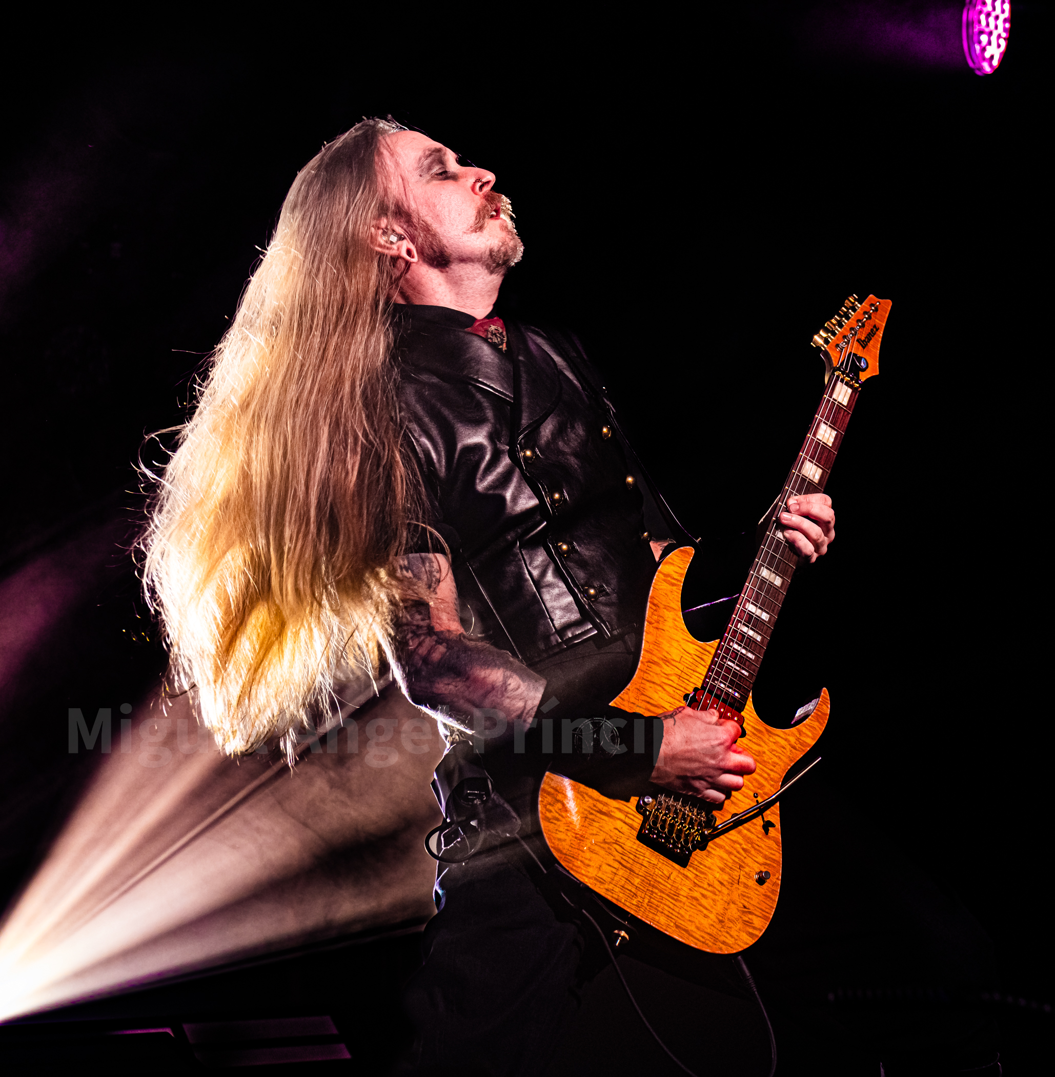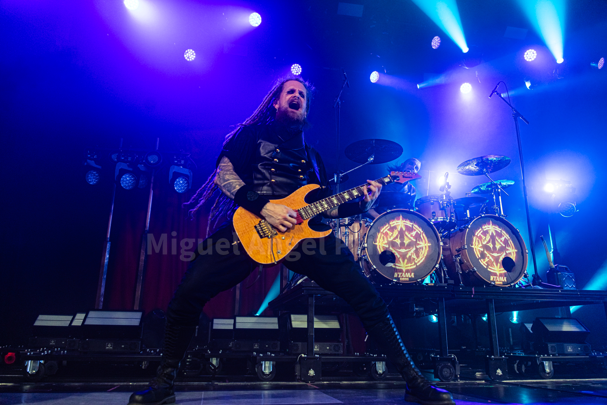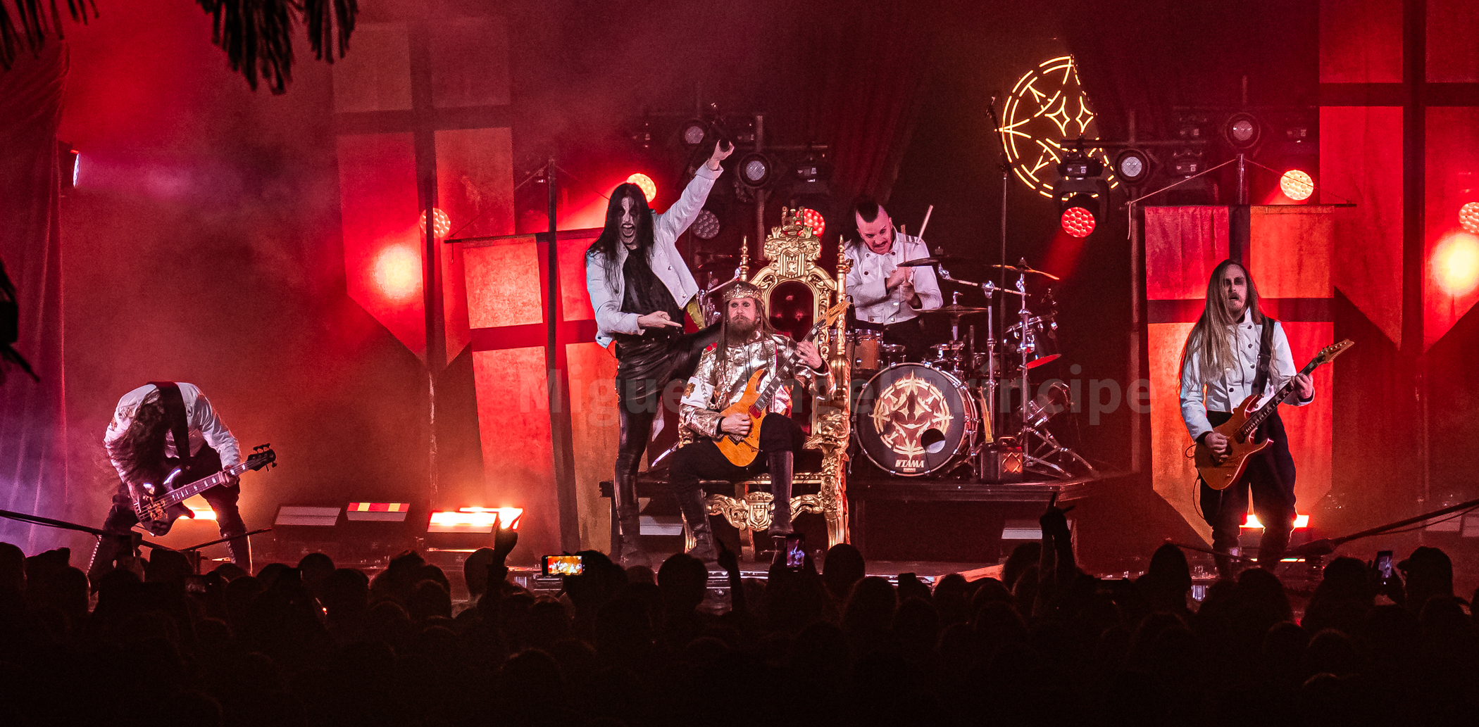 Nueva sorpresa al colocarse en uno de los laterales otra batería para tras un sonido de alarmas reconocerse «Colossus» donde el grupo cual desfile marcial y con John Alfredsson tocando de pie junto al resto de sus compañeros, hizo botar a toda la sala a la par que se marcaban tintes oscuros a lo Marilyn Manson para posteriormente llegarse con «Torn Apart» a una nueva pausa abriéndose otra vez la batería apareciendo ahora un piano en el centro donde Johannes tomó asiento y tras un discurso que francamente fue un poco largo, empezar a sonar la emotiva «Howling At The Waves» permitiéndonos tomar algo de aliento al disfrutar de unos sonidos muy limpios de guitarra. Tras la desaparición del piano sobre el escenario comenzó a escucharse la Intro de «Glory To Our King» mostrándose en esta ocasión encima de la plataforma un trono donde coronado como un rey, guitarra en mano y sentado durante todo el tema Jonas con una chaqueta blanca al igual en ese momento que el resto de sus compañeros comenzó a interpretar «Legend Of The King». Unos potentes riffs dieron paso a «Let It Burn» cerrándose tras ella el telón y quedando solamente John en la batería volviendo a las tablas toda la banda para acabar el show con «Tonight We Must Be Warriors» a las 21:45 horas.