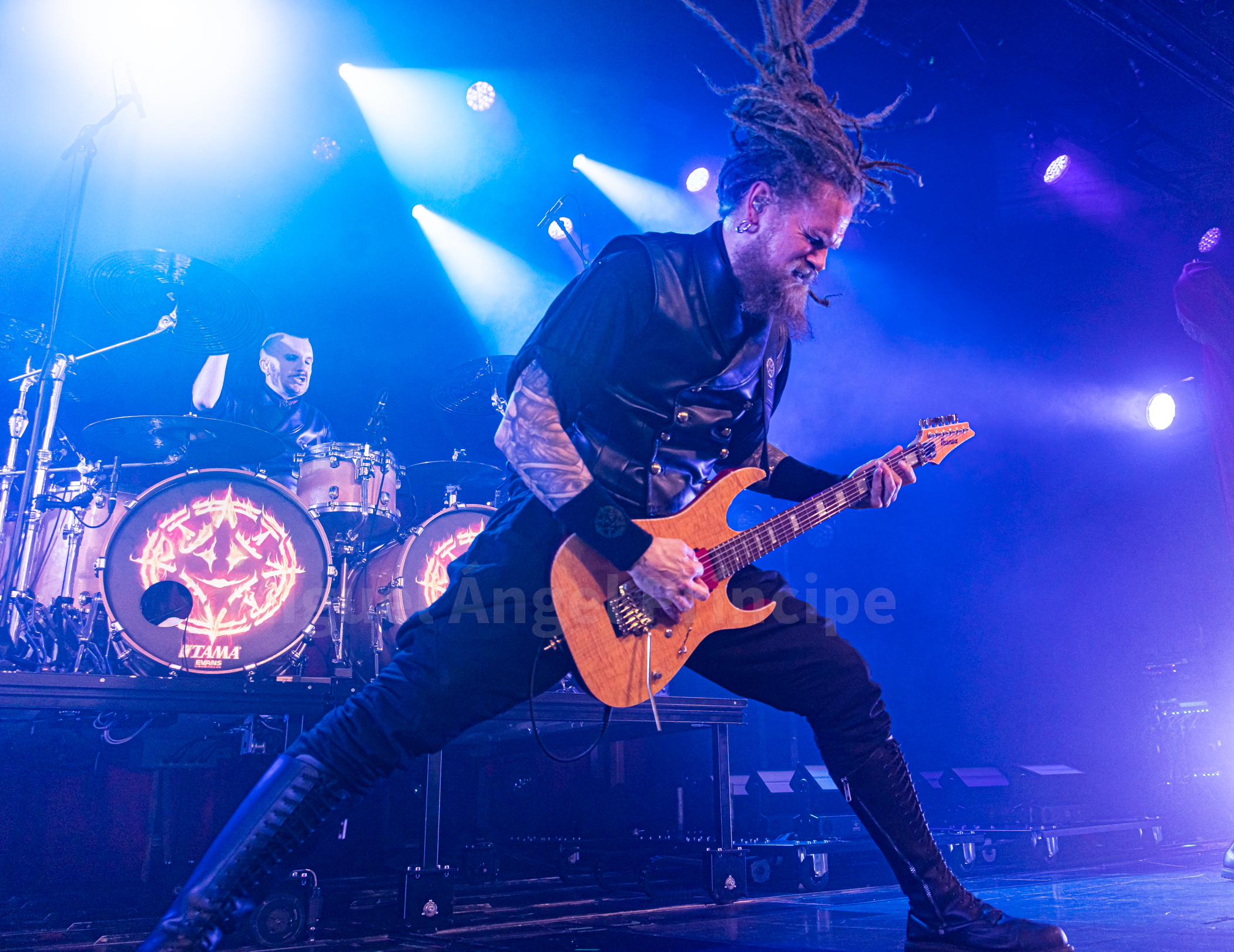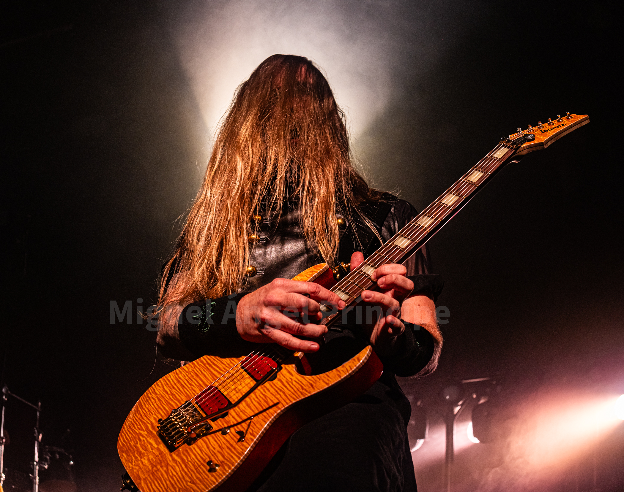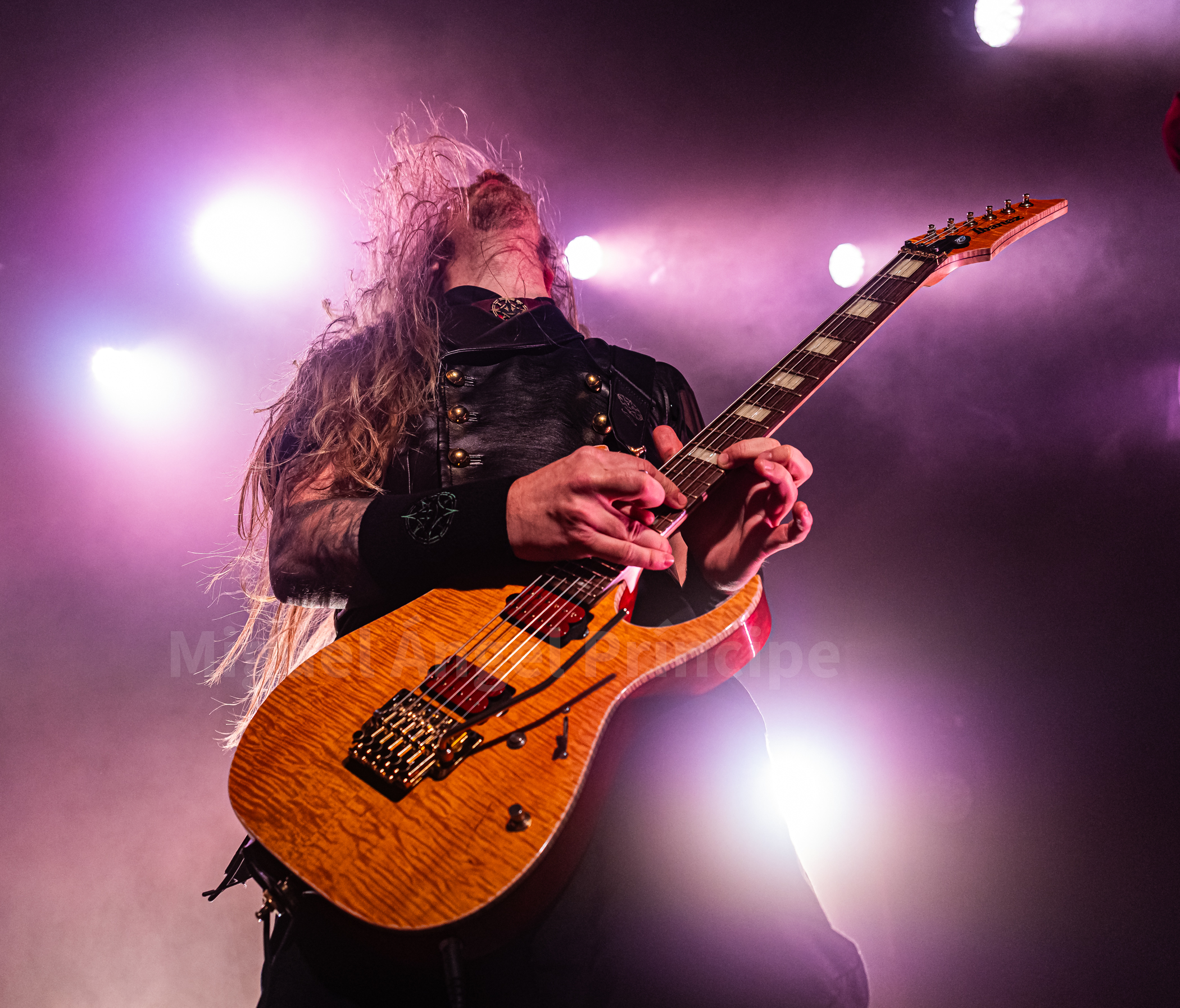 Nueva sorpresa al colocarse en uno de los laterales otra batería para tras un sonido de alarmas reconocerse «Colossus» donde el grupo cual desfile marcial y con John Alfredsson tocando de pie junto al resto de sus compañeros, hizo botar a toda la sala a la par que se marcaban tintes oscuros a lo Marilyn Manson para posteriormente llegarse con «Torn Apart» a una nueva pausa abriéndose otra vez la batería apareciendo ahora un piano en el centro donde Johannes tomó asiento y tras un discurso que francamente fue un poco largo, empezar a sonar la emotiva «Howling At The Waves» permitiéndonos tomar algo de aliento al disfrutar de unos sonidos muy limpios de guitarra. Tras la desaparición del piano sobre el escenario comenzó a escucharse la Intro de «Glory To Our King» mostrándose en esta ocasión encima de la plataforma un trono donde coronado como un rey, guitarra en mano y sentado durante todo el tema Jonas con una chaqueta blanca al igual en ese momento que el resto de sus compañeros comenzó a interpretar «Legend Of The King». Unos potentes riffs dieron paso a «Let It Burn» cerrándose tras ella el telón y quedando solamente John en la batería volviendo a las tablas toda la banda para acabar el show con «Tonight We Must Be Warriors» a las 21:45 horas.