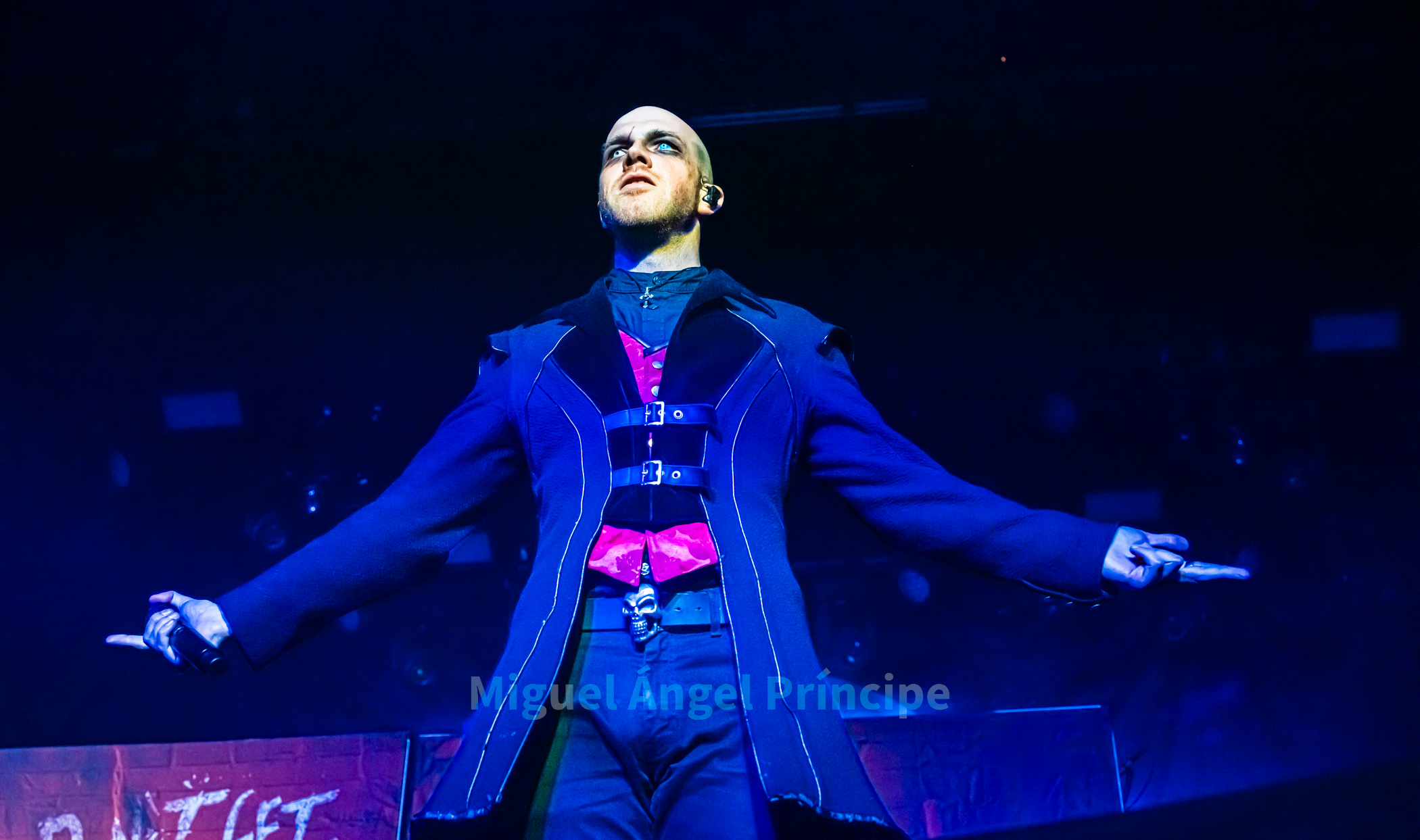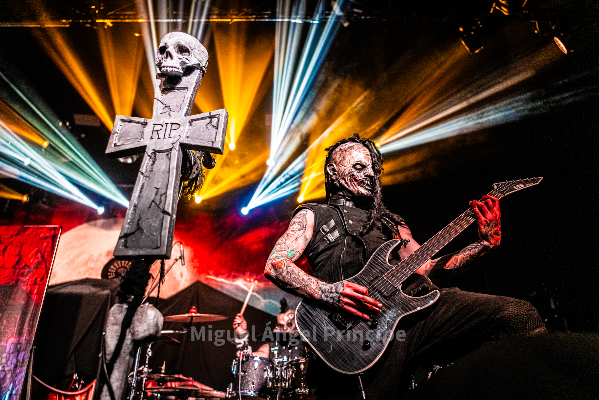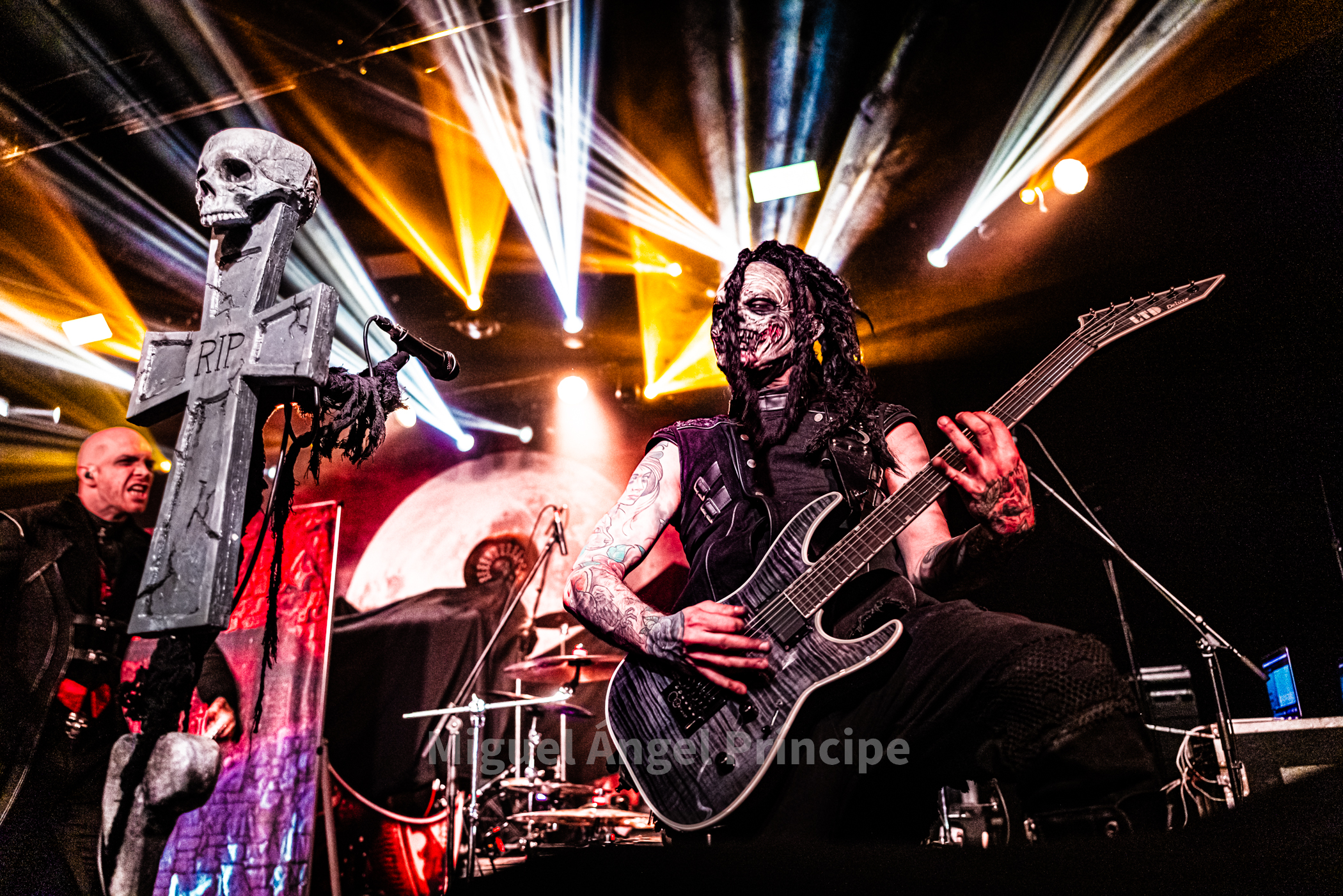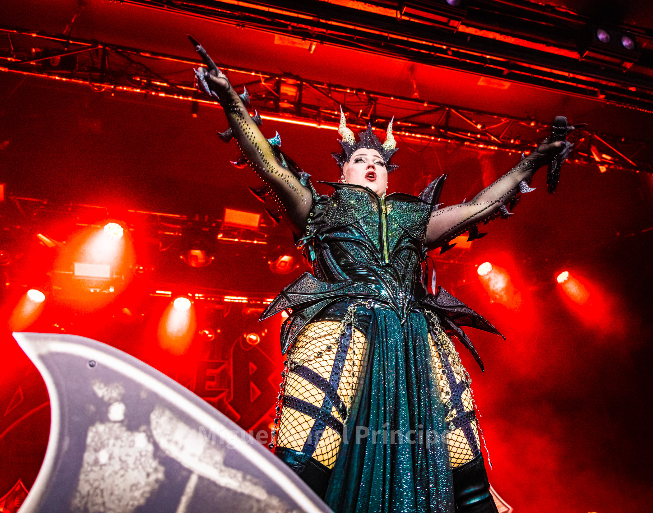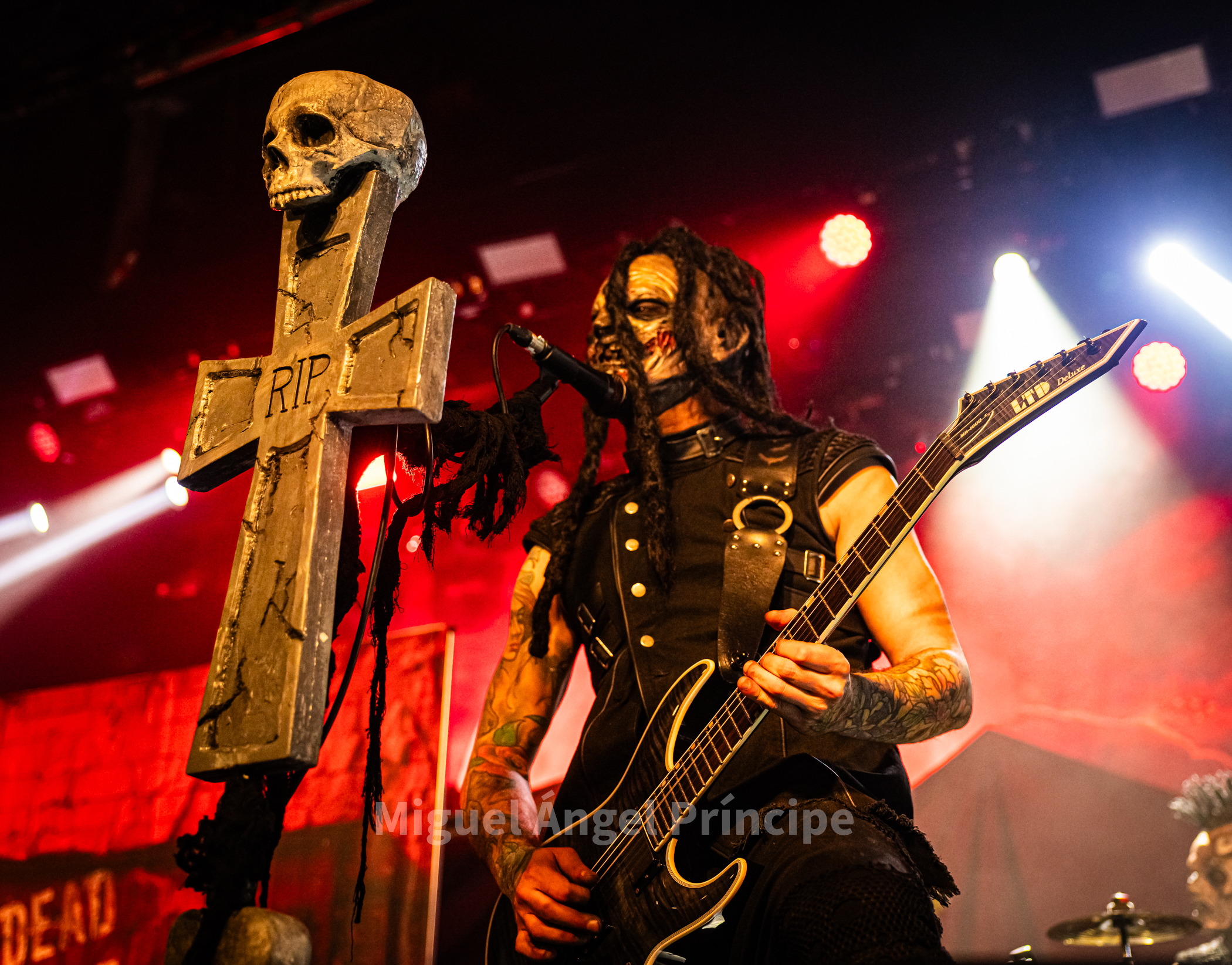 19:45 horas y DOMINUM sobre la tarima precedido por la oscuridad, las sombras e intensificada su aparición por haces de luz roja en una teatralidad zombie propia de esta joven formación creada en el 2022 encabezada por Felix Heldt que desde Alemania y acompañado por Patient Zero al bajo, Tommy Kemp a la guitarra junto con Victor Hiltop a la batería defendió como cuarteto no sólo una imagen arrolladora sino un directo cargado de ritualismo dirigido por la magnética voz de Heldt en su papel de creíble científico loco Dr. Dead, imprimiendo éste intensidad a los temas con unos constantes brazos abiertos a modo de invocación.