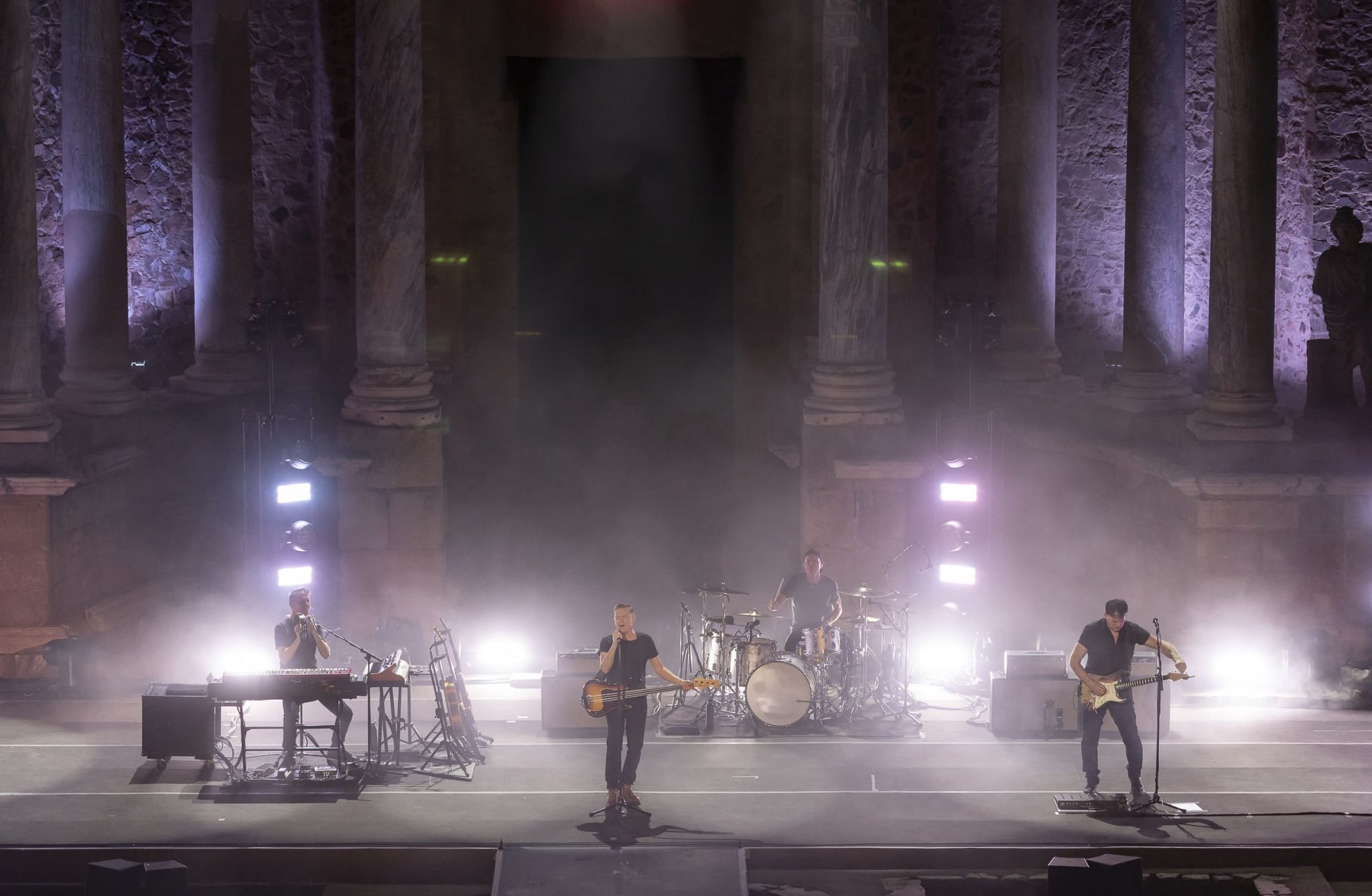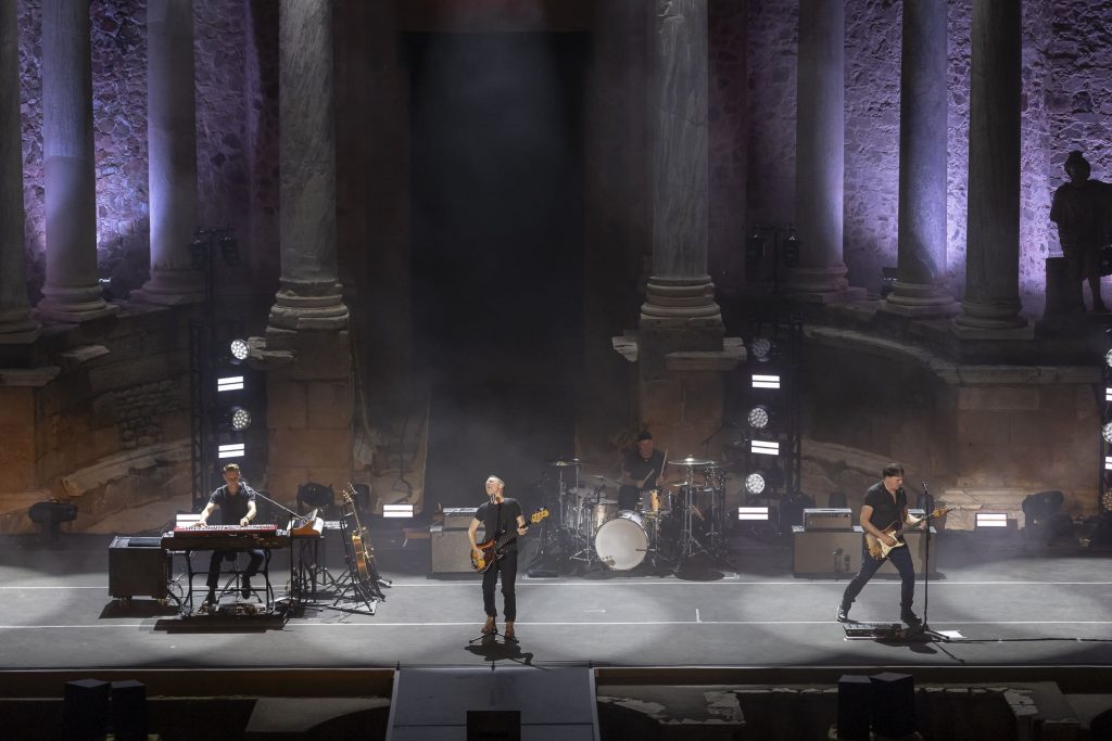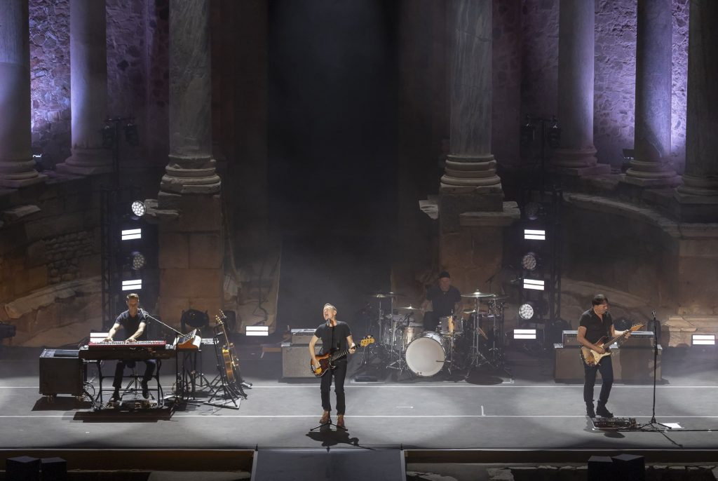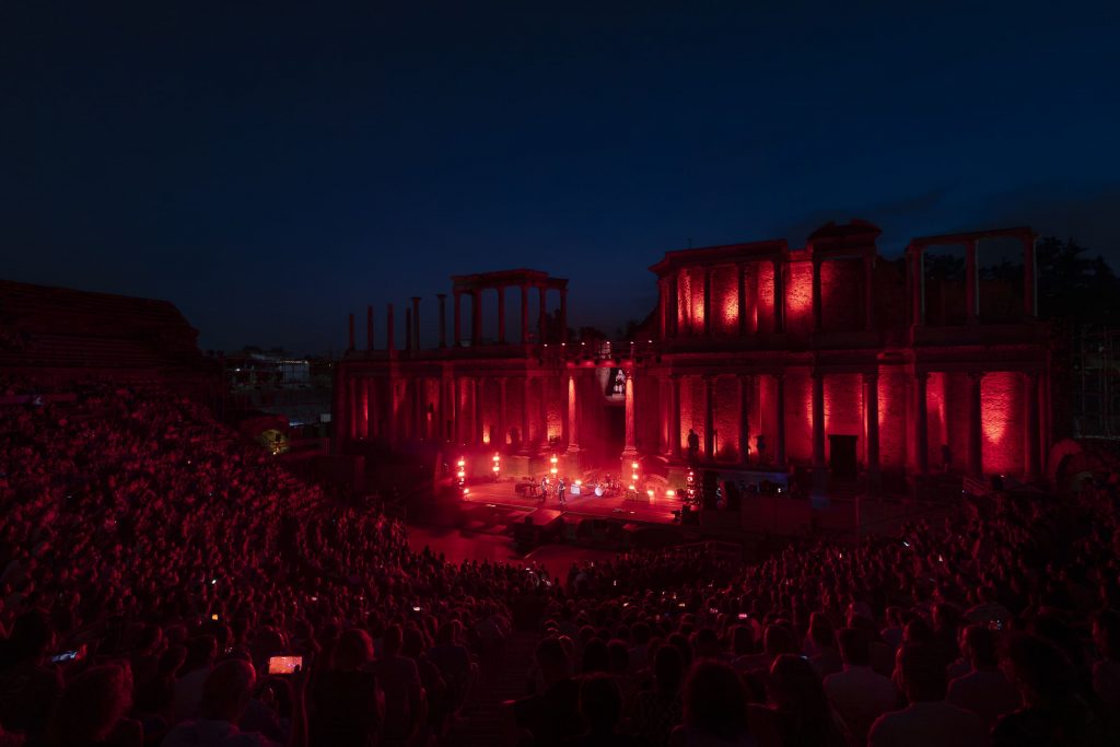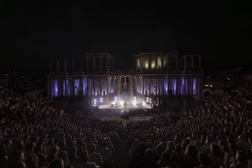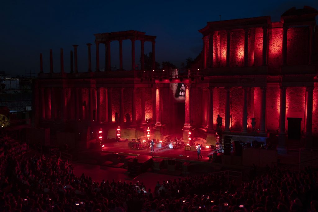 Un par de horas después, podíamos comprobar la singularidad de la cita con un simple vistazo a los elementos dispuestos para el show una vez dentro del Teatro, donde un escenario enmarcado bajo la majestuosidad de las columnas clásicas del recinto, con un sencillo y discreto juego de luces, y un backline también mucho más reducido de lo que habitualmente estamos acostumbrados a presenciar en citas musicales de este calibre, acaparaban las miradas curiosas del graderío semicircular donde los asistentes iban tomando sus asientos para presenciar el espectáculo. Un público que finalmente prácticamente tomaría la totalidad del recinto, pese a que los huecos minutos antes de dar inicio a la actuación no hacían precisamente presagiar el casi lleno final.
