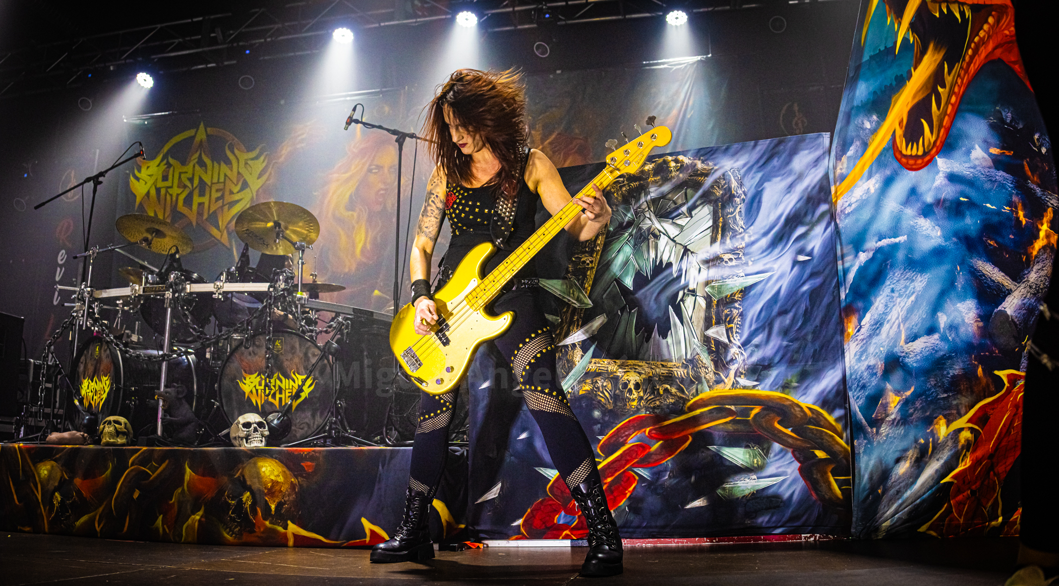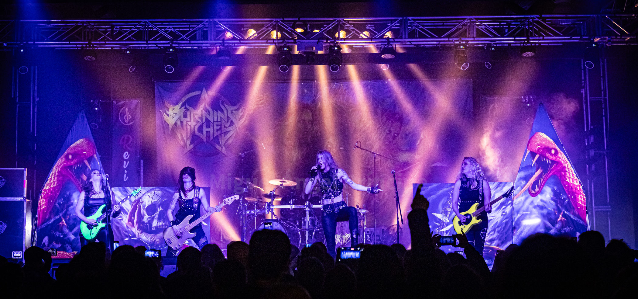 Un cambio de backline de unos veinticinco minutos nos hizo pasar rápidamente del mundo del martillo al de la oscuridad de la brujería gracias a la propuesta de las suizas BURNING WITCHES que viven un momento dulce y lo han estado demostrando a lo largo de toda la gira, un tour donde además el quinteto actualmente compuesto por una de las fundadoras de la banda Romana Kalkuhl a las seis cuerdas acompañada ésta por la estadounidense también guitarrista Courtney Cox, Lala Frischknecht a la batería, Jeanine Grob al bajo y Laura Guldemond a la voz está presentando su último disco de nombre Inquisition dejando claro en su directo desde el principio y sin tregua ganas de triunfo sobre las tablas que sin duda se logró con una actuación sobresaliente.
