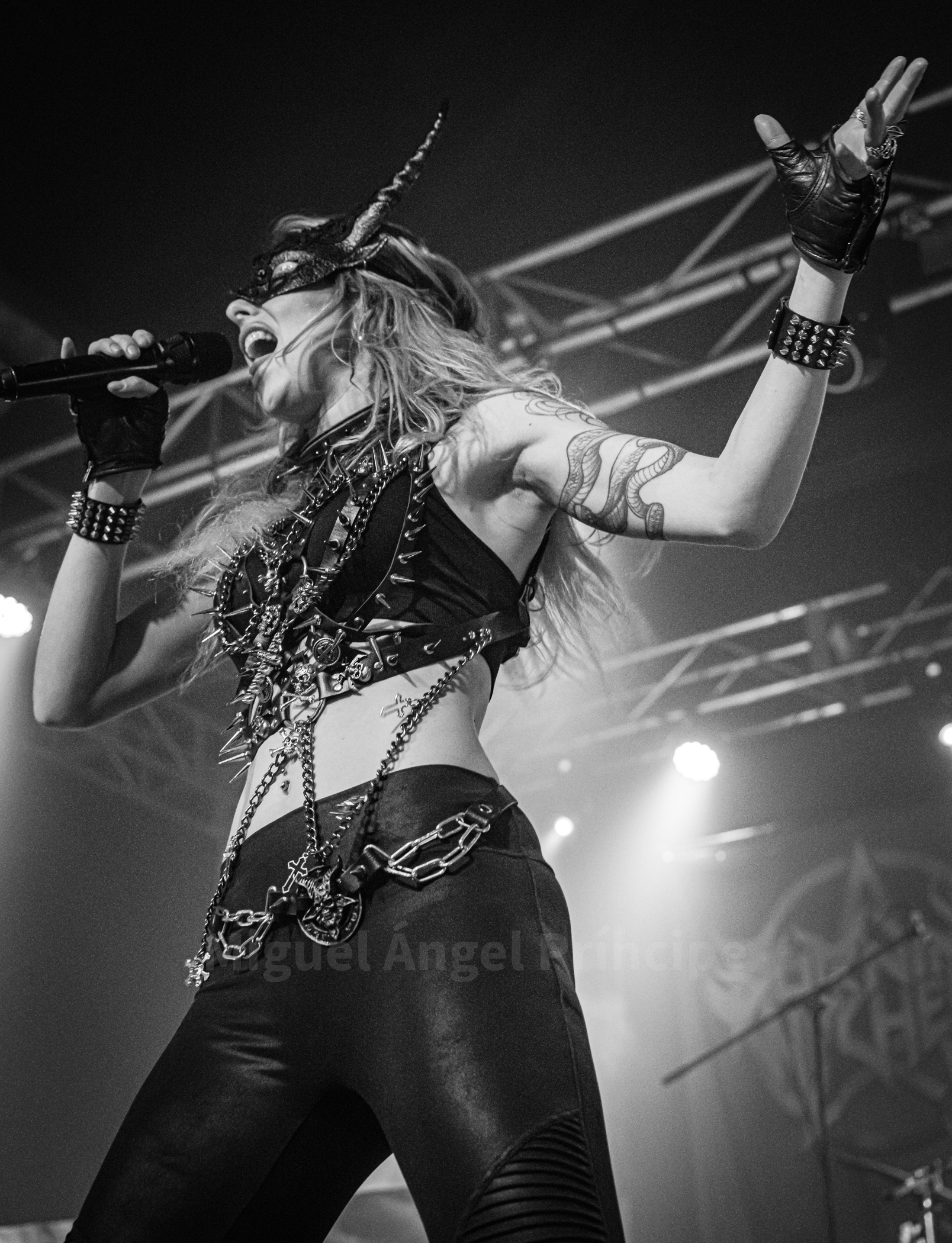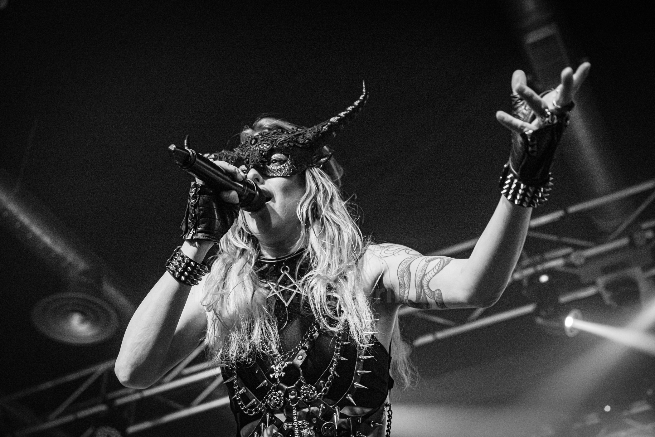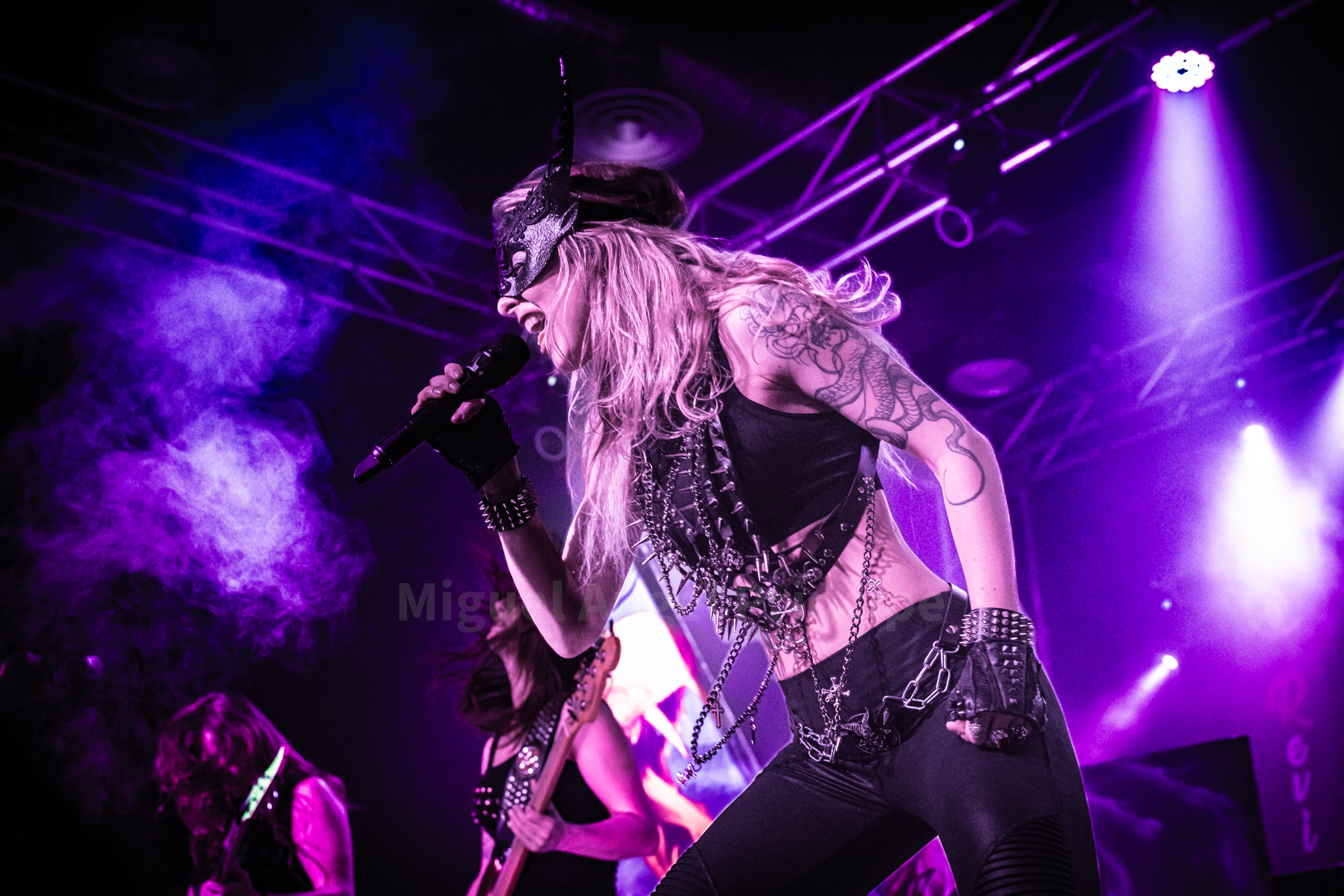 Momento de descanso, emotividad, bajar el ritmo, encender las linternas y disfrutar con «Release Me» donde la vocalista pidió a todos los allí presentes mover los brazos de un lado a otro como así se hizo para acompañarlas en esta pista, tomando acto seguido todos aire antes de invadir el local la intensidad brutal de «Black Widow» tornándose con «Evil Witch» la sala en un rojo intenso con una generosa carga de humo para dar un ambiente mucho mas infernal del que ya habíamos podido vivir hasta el momento para en el siguiente tema «Lucid Nightmare» y para deleite de las primeras filas, bajarse la frontwoman al foro cantando en un gesto que fue tan coreado como aplaudido por toda la feligresía.