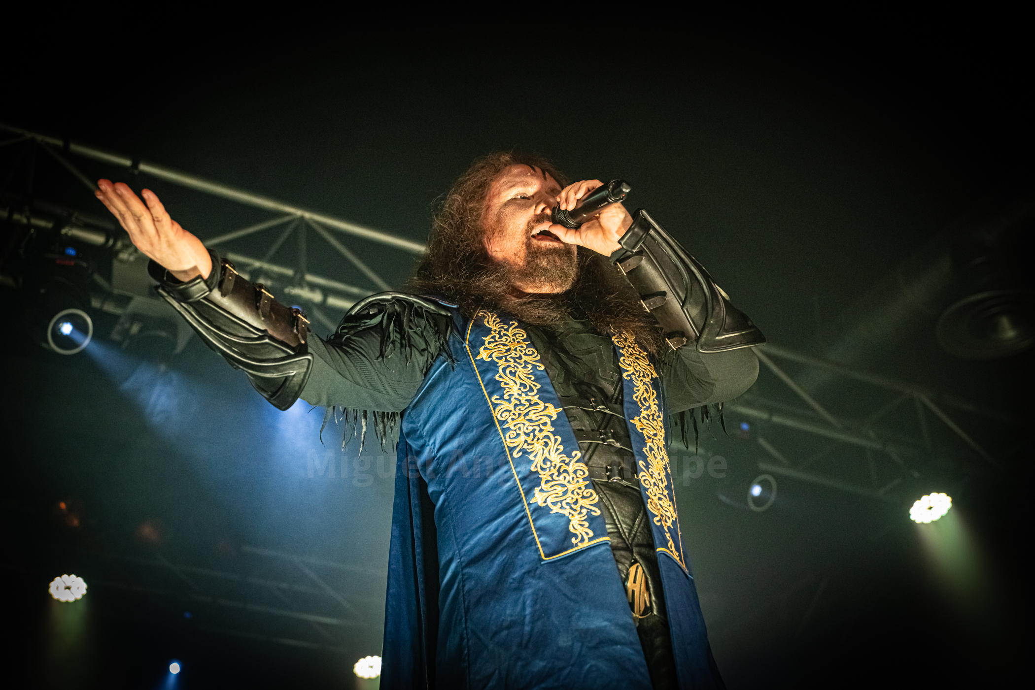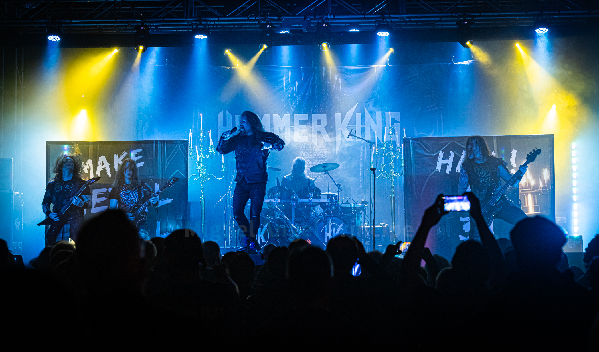 En una jornada tremendamente ventosa y lluviosa llegado el momento de la apertura de puertas ya pasadas las 19:00 horas, el público fue cogiendo posiciones para el inicio del show a las 20:00 cumpliéndose puntualmente el horario y apareciendo sobre la tarima un súbdito portando en ambas manos un gran martillo con las iniciales H.K. grabadas en éste para tras la pertinente Intro, aparecer uno tras otro sobre el escenario los miembros del quinteto teutón HAMMER KING formado por Titan Fox V (vocalista, líder y ex ROSS THE BOSS), Gino Wilde (guitarra), un jovencísimo además de virtuoso Marex Van Ferum (guitarra), Günt Von Schratenau (bajo) y Jens Gellner «Count Ivo Shandor Of Shandoriar» (batería) con siete álbumes en el mercado para decidir abrir la descarga con «King For A Day» y «Make Metal Royal Again» ambos incluidos en su último redondo, empezando el vocalista ya con la segunda pieza a animar al público saludando en castellano antes de «Kingdom Of Hammers And Kings» incluida ésta en su primer larga duración de título homónimo que vio la luz allá por el año 2015 incluyendo HAMMER KING en su ejecución nuevamente la performance del martillo, siendo el mismo portado en esta ocasión por una dama con atuendo de época al igual que el resto de la escuadra en pura inmersión dentro del mundo medieval.