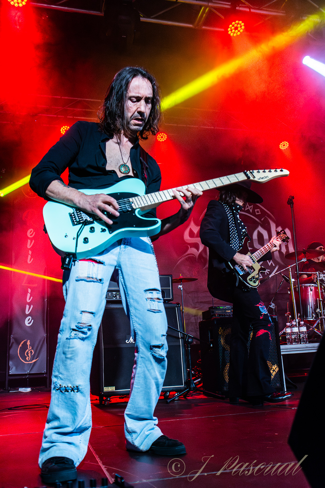 Suelo encontrarme a David T. Valera como público en multitud de ocasiones, apoyando a sus compañeros, un encuentro siempre grato, aunque siempre es mucho más enriquecedor cuando el que se encuentra sobre el escenario es el mismo, como en esta ocasión al frente de su último y personal proyecto DAVIL FANTASIES, con el que ya tuve la ocasión de verle el pasado mes de febrero, en la presentación en directo oficial de su primer trabajo Me, The Evil, acompañado prácticamente por la misma formación, es decir Javier Rubio y David Lasso a las guitarras, Raúl Ortega a la batería, José M toledano en los coros y José M. Pérez, que en esta ocasión fue sustituido en las cuatro cuerdas por Samuel Castillo, ya que él se encontraba cumpliendo otros compromisos profesionales con GUADAÑA. Tras una pequeña intro «Day Of Dead» era el tema elegido para arranque con toda la banda sobre el escenario mientras David hacia su aparición sobre el mismo derrochando potencia sonora desde el minuto uno. “The Hexenbiest” un tema en el que siempre que lo escucho, no dejo de encontrar ciertas similitudes entre la voz de David y la de Udo (Accept) en sus mejores momentos, «Quédate Hasta Que Me Duerma» tema cantado en castellano, incluido también es este primer trabajo, pero fruto de su etapa en Crienium, donde el dúo de hachas nos dejaba una buena muestra de su maestría a las seis cuerdas.