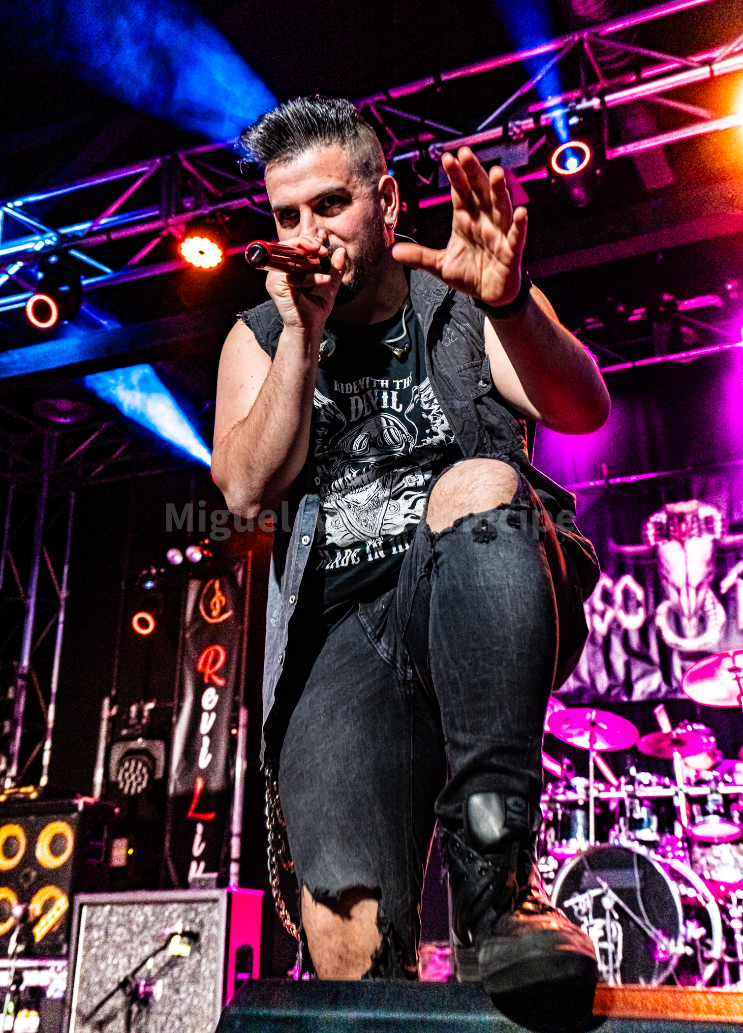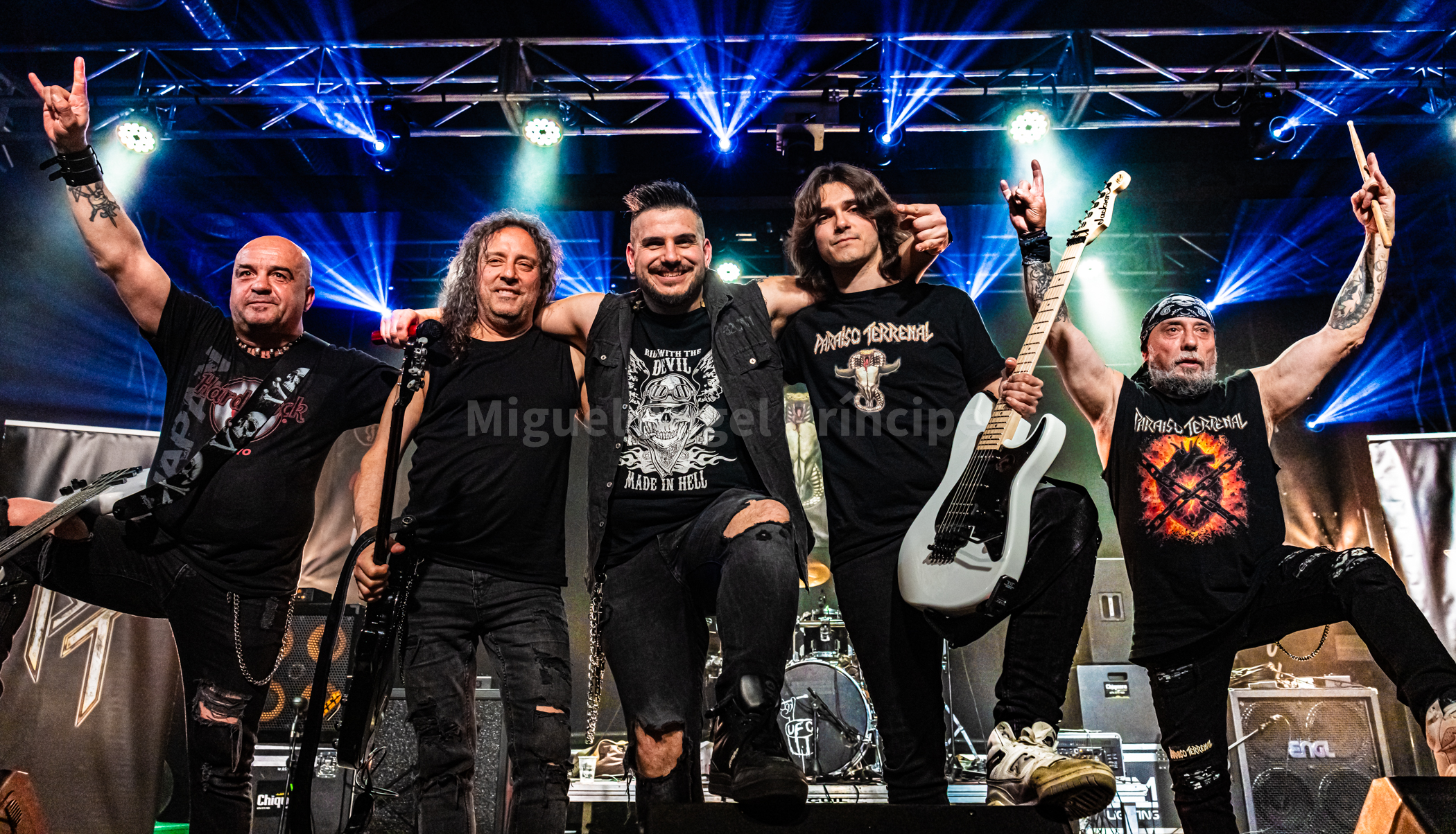 PARAÍSO TERRENAL no tardó mucho en hacer acto de presencia cogiendo el relevo ante un público ya sumergido en el ambiente de hermandad y amistad que llenaba el local, irrumpiendo sin piedad los vallisoletanos con «Inmortal» perteneciente a su primer disco del 2022 de nombre Fuego En Tu Interior el cual representó en su día toda una declaración de intenciones en cuanto a su adicción por el Heavy Metal & Hard Rock, desenfundando el quinteto en el mismo y en los directos toda una artillería de veleidades instrumentales que sin duda conformaron durante su concierto la tormenta perfecta gracias al vocalista Suko Sánchez tanto a la voz como defendiendo actitud escénica.