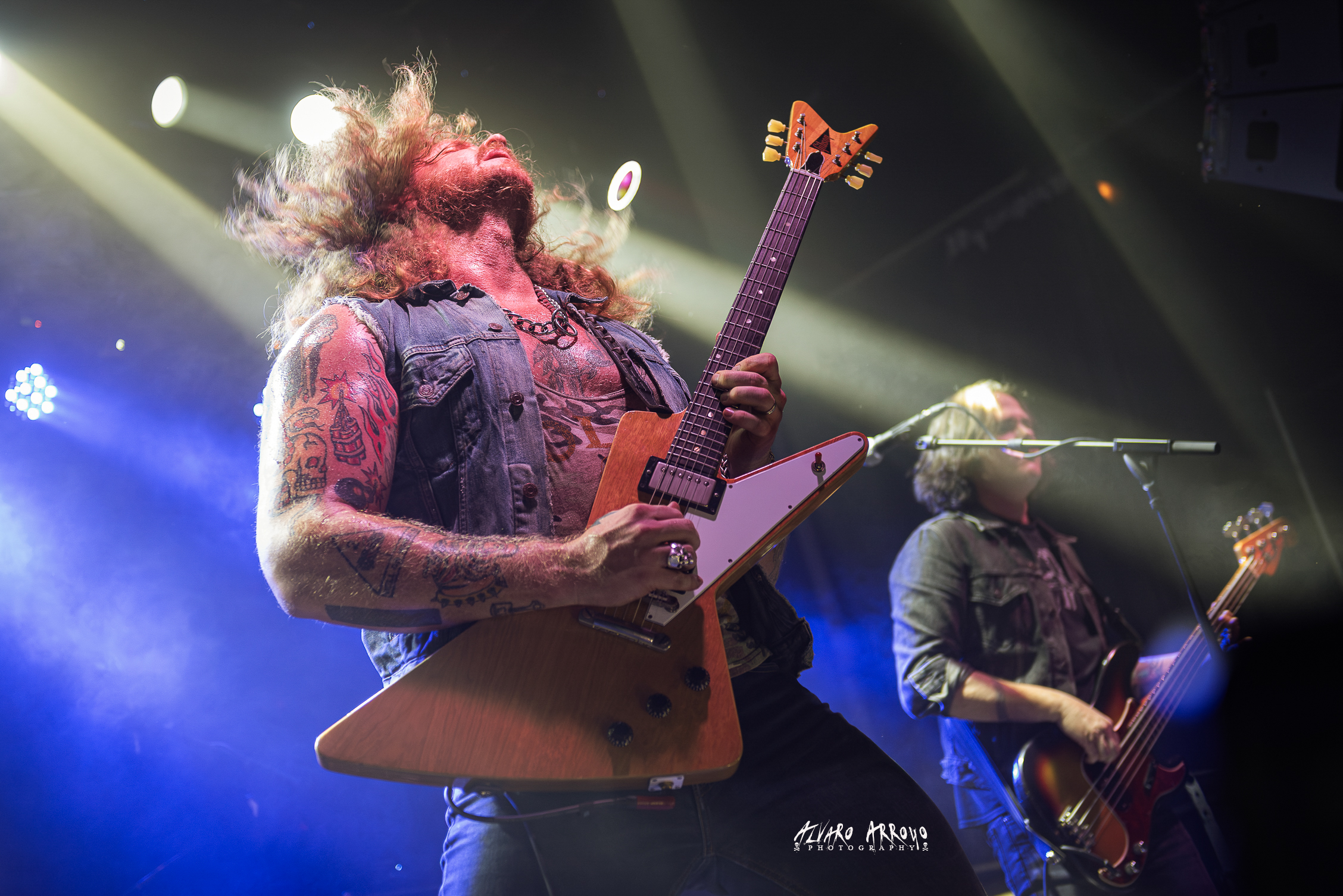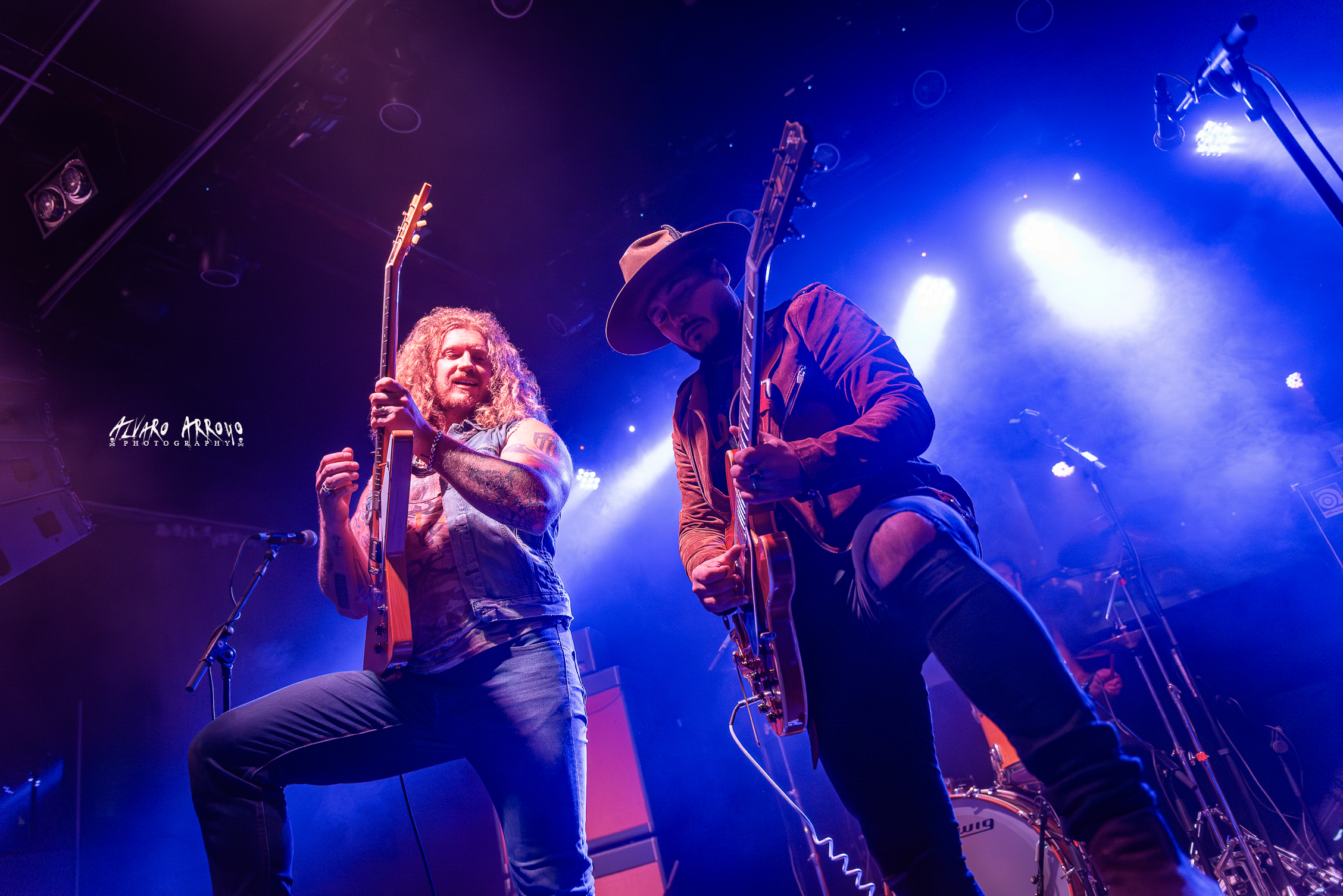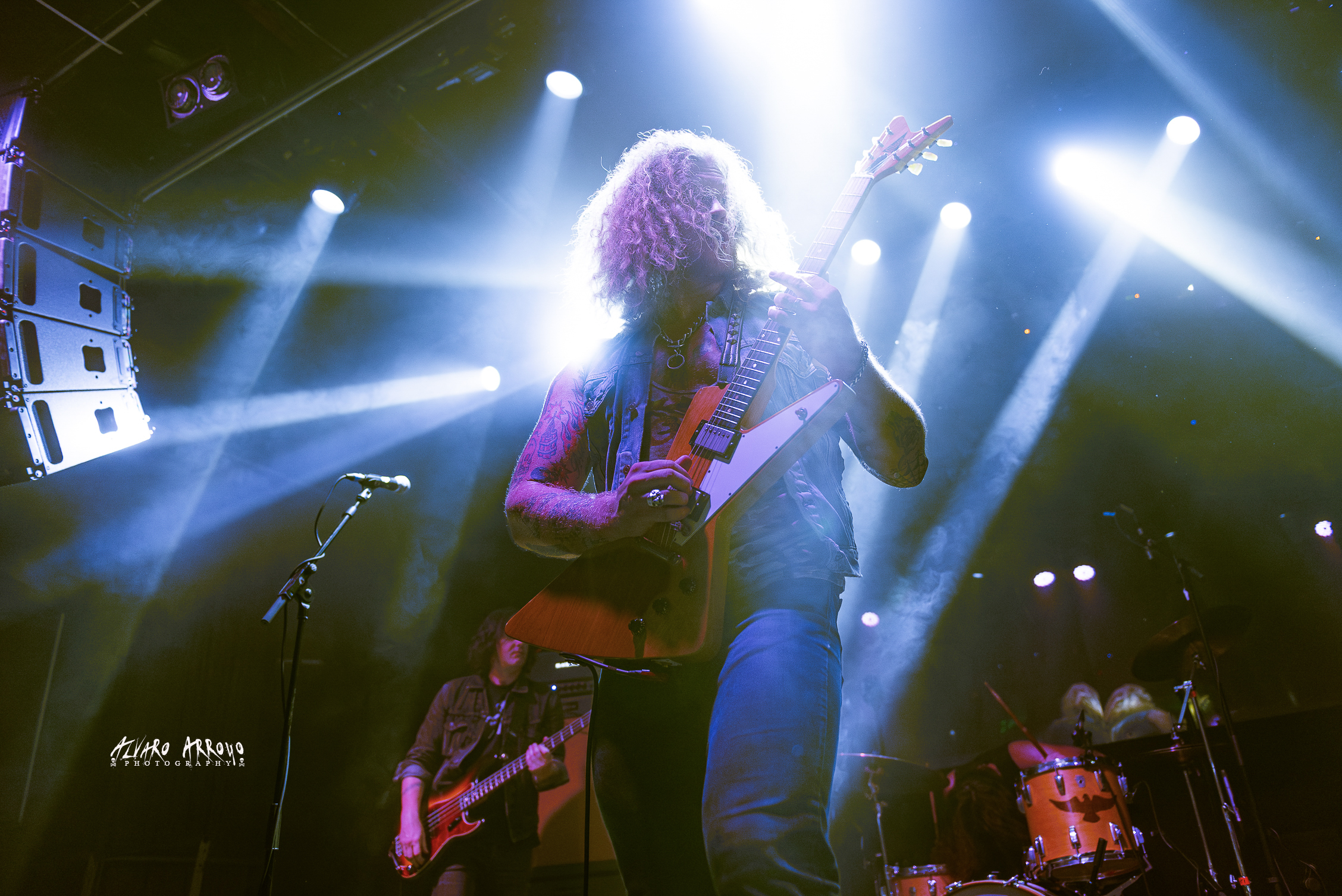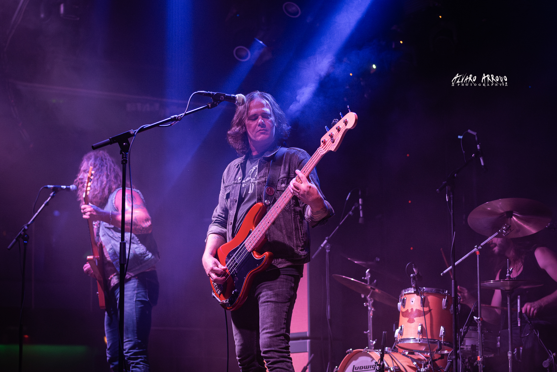 El rugido vocal y el musculo musical de Jared sigue bien entrenado, con esa peculiar forma suya de sentir con los dedos de su mano derecha las notas que salen de su guitarra —en esta ocasión, la Gibson Futura customizada por la marca de forma exclusiva para el guitarrista en este 2025 que se nos va—, manteniendo esa sensación tan orgánica que destila su música en temas como “Down the Drain”, acompañándose para completar el power-trío de la pegada a la batería de Ryan Rice y la maestría al bajo de Brian Weaver, y regalarnos entre los tres una avalancha de poderoso Rock ‘N’ Roll en la siguiente “Hard Wired” o de Blues Power (Motherfuckers) como le gusta decir al vocalista para anticiparnos “Thew Me to the Wolves”, alargada en su parte final y demostrando cada uno de los tres músicos su destreza con sus instrumentos.