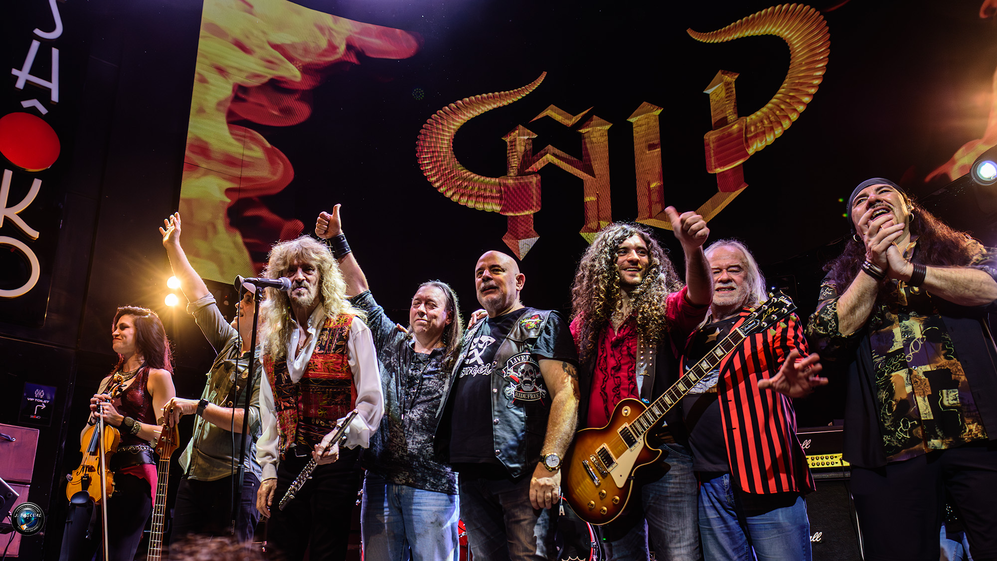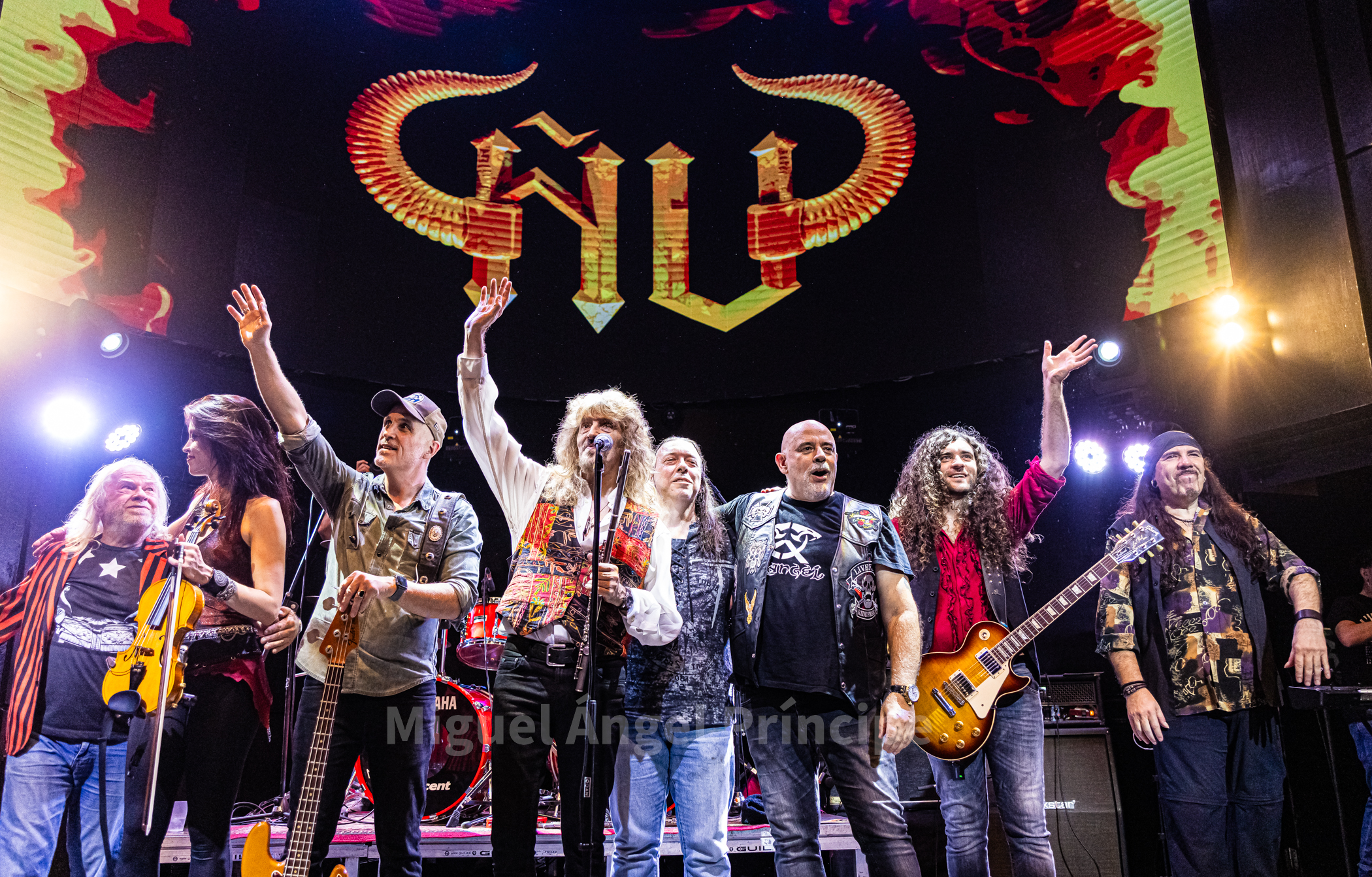 Con el fuego, ya apagado, pero sin bajar para nada la temperatura de la noche llegaba el momento de la segunda parte del concierto, ya sin Jero sobre las tablas, ocupaban su puesto los dos miembros actuales de la banda ausentes en ese primer acto, Sara Ember al violín y Dani Moreno a la guitarra, «Preparan» era el tema escogido para esta nueva andanada, donde sonarían temas tan reconocibles como «No Hay Ningún Loco» o «La Granja del Loco» daban continuidad a la gran fiesta del rock que vivida en la noche del viernes en la sala Shoko, con «Manicomio» se cumplía la hora estipulada para la finalización, ya que la sala como otras muchas de la capital luego opera como discoteca, pero afortunadamente aunque nos sabría a poco, les permitieron sumar el tiempo suficiente para que pudiéramos disfrutar de «El Tren» con esa estupenda introducción barroca que suele preceder al mismo en sus actuaciones en directo, para poner el punto y final con el imprescindible y siempre esperado «El Flautista» y dejarnos en la retina la foto final con todos los protagonistas de la noche sobre el escenario, con esa sonrisa de satisfacción que deja el trabajo bien hecho.