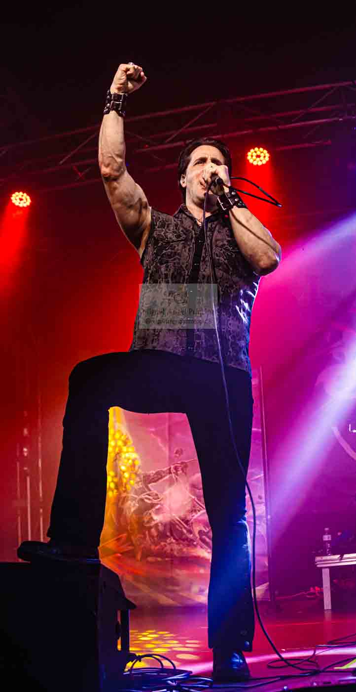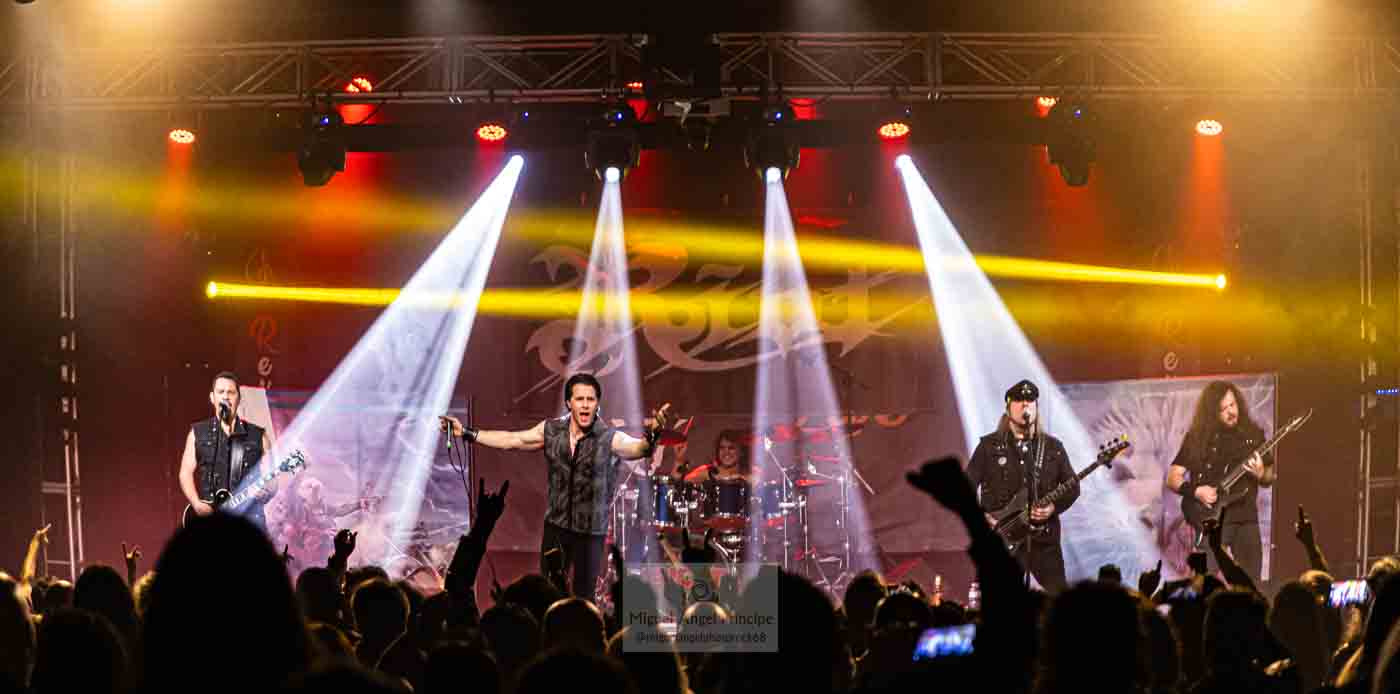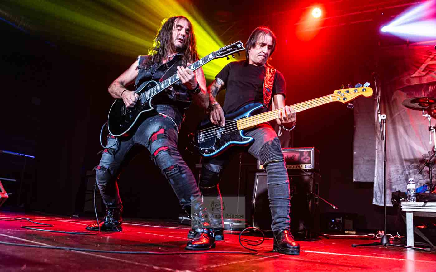 AZRAEL, fieles representantes del Heavy metal en castellano, y muy queridos por el público madrileño, fueron los encargados de ir calentando el ambiente y podemos dar fe de que así lo hicieron, ya desde las primeras notas de «Nada que Temer» la potente voz de Marc Riera, junto a la maquinaria musical perfectamente engrasada que forman sus compañeros J.M. Salas al bajo. Enrique Rosales y Óscar Espín a las guitarras, y Tino Torres en la batería, cóctel perfecto y potente para atraparnos con su propuesta cargada de buen Heavy, con temas clásicos de la banda y como no con algunos de Dimensión V, como «Vivir / Morir» puro Power Metal, con un impresionante Marc a la voz o «Renacer» dos temas que han llegado para quedarse en los directos de la banda, para acompañar a clásicos de su repertorio como «Al Amanecer» el tema que viera la luz en aquel Código Infinito del año 2014, hacía imposible sustraerse a su estribillo adictivo, mientras la banda nos seguía ofreciendo un recorrido por su historia con temas como «Incierta Realidad» incluida en Dimensión IV que nos dejaba casi sin resuello, al ritmo trepidante marcado por la pareja rítmica.