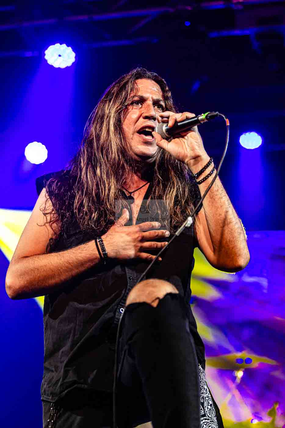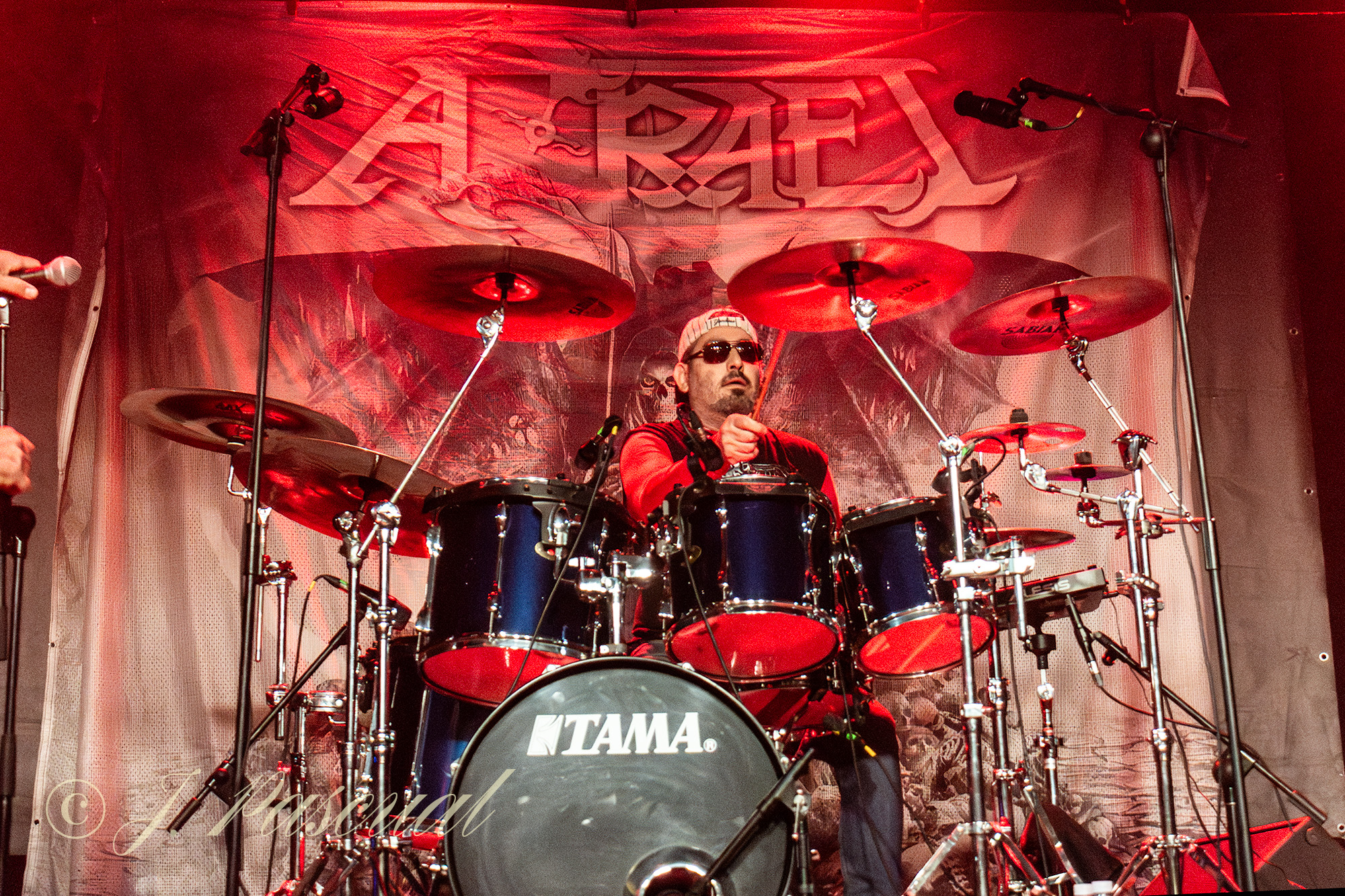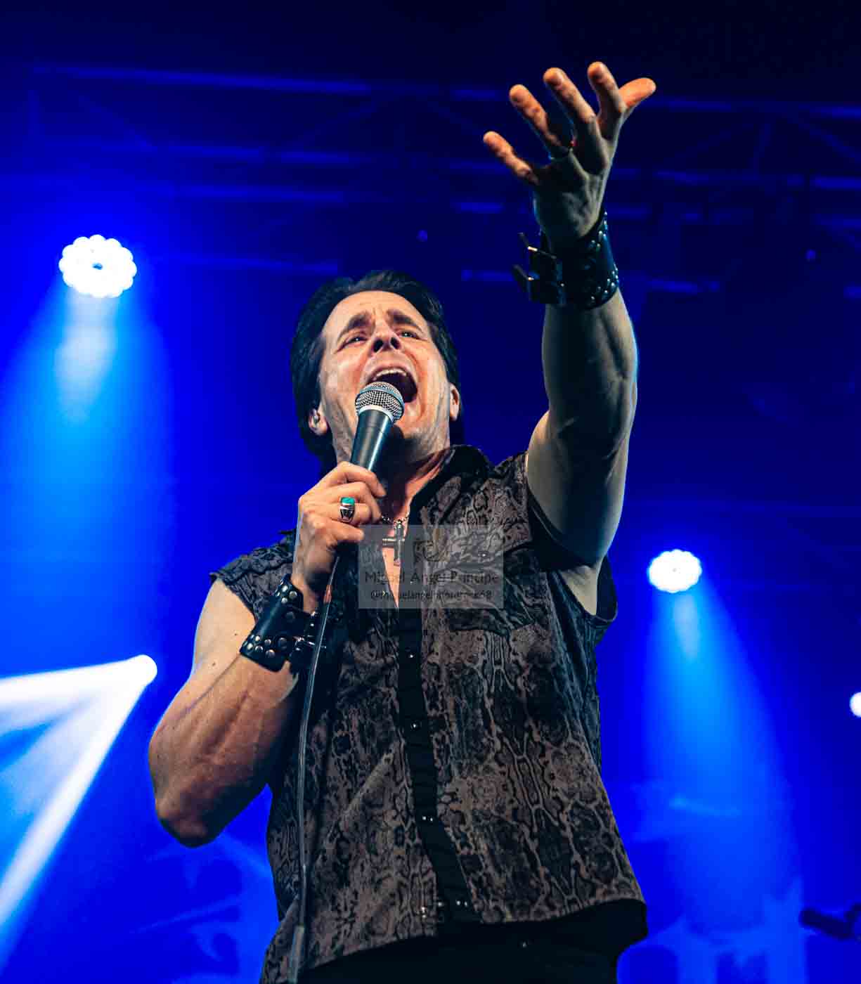 AZRAEL, fieles representantes del Heavy metal en castellano, y muy queridos por el público madrileño, fueron los encargados de ir calentando el ambiente y podemos dar fe de que así lo hicieron, ya desde las primeras notas de «Nada que Temer» la potente voz de Marc Riera, junto a la maquinaria musical perfectamente engrasada que forman sus compañeros J.M. Salas al bajo. Enrique Rosales y Óscar Espín a las guitarras, y Tino Torres en la batería, cóctel perfecto y potente para atraparnos con su propuesta cargada de buen Heavy, con temas clásicos de la banda y como no con algunos de Dimensión V, como «Vivir / Morir» puro Power Metal, con un impresionante Marc a la voz o «Renacer» dos temas que han llegado para quedarse en los directos de la banda, para acompañar a clásicos de su repertorio como «Al Amanecer» el tema que viera la luz en aquel Código Infinito del año 2014, hacía imposible sustraerse a su estribillo adictivo, mientras la banda nos seguía ofreciendo un recorrido por su historia con temas como «Incierta Realidad» incluida en Dimensión IV que nos dejaba casi sin resuello, al ritmo trepidante marcado por la pareja rítmica.