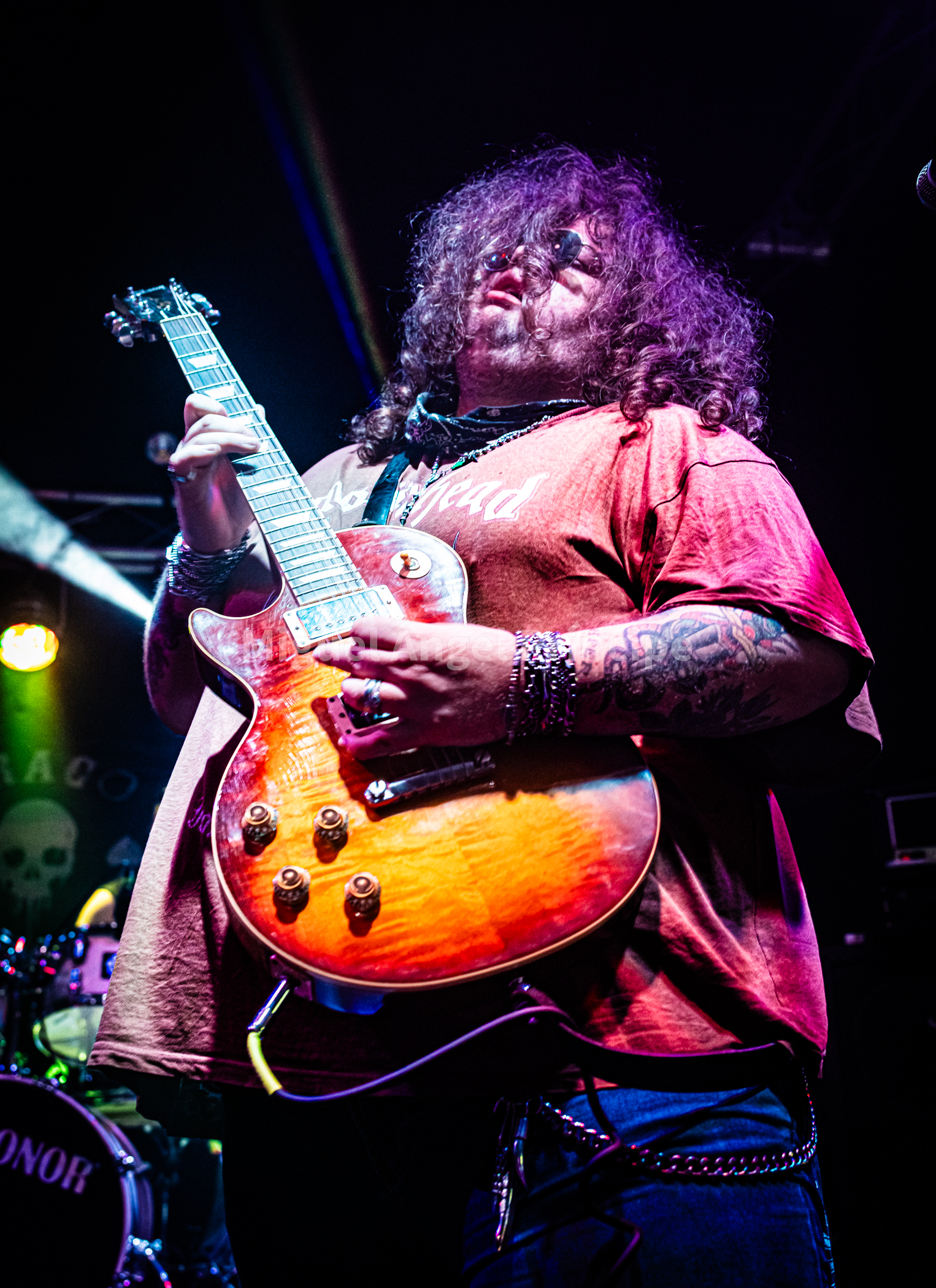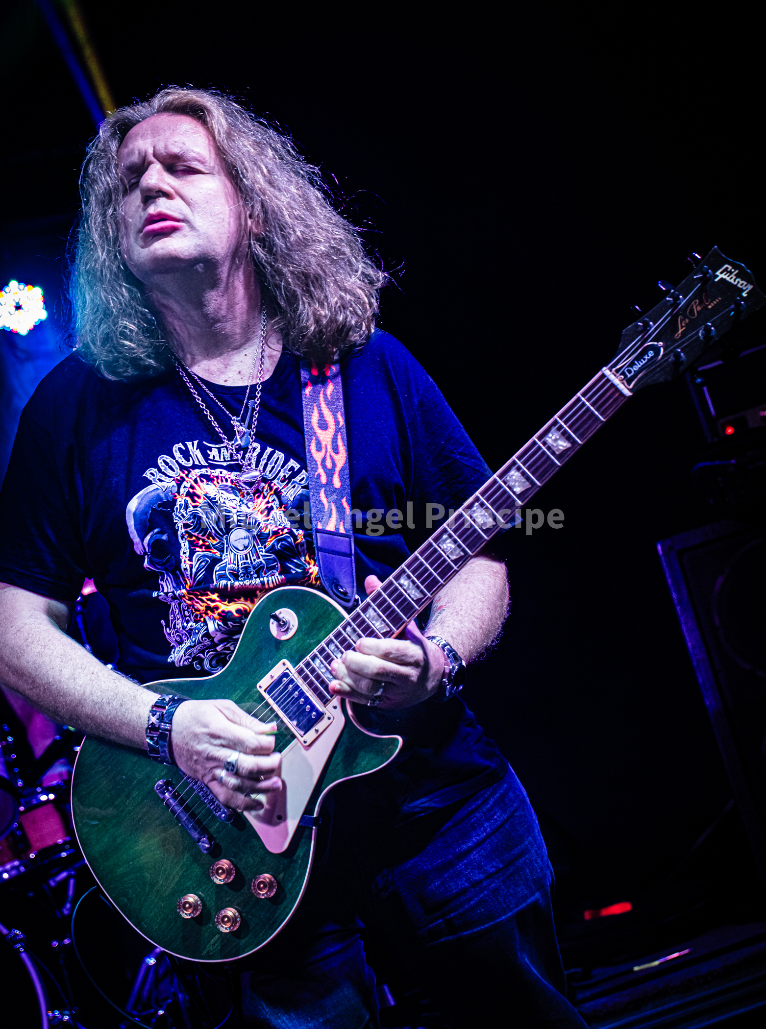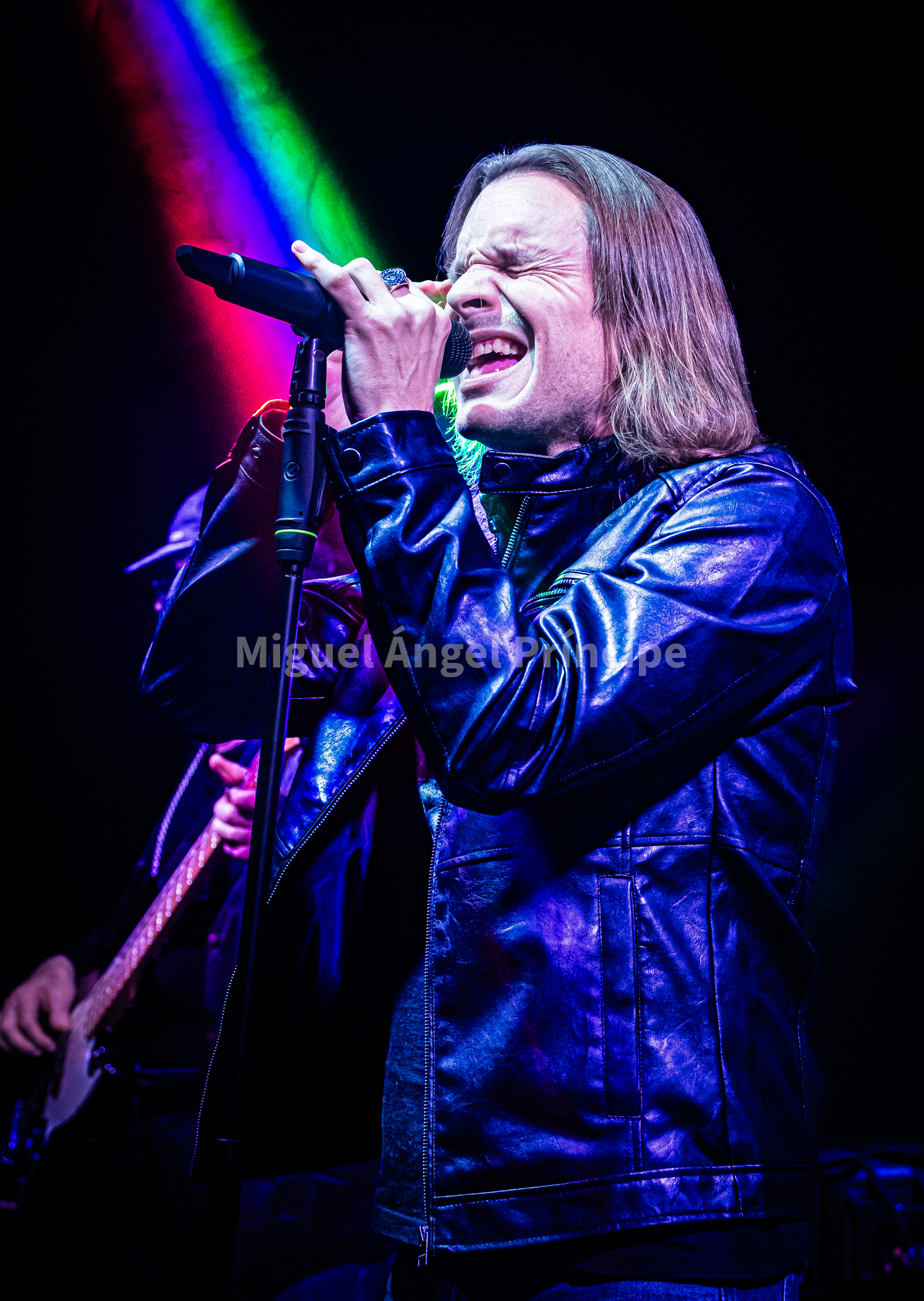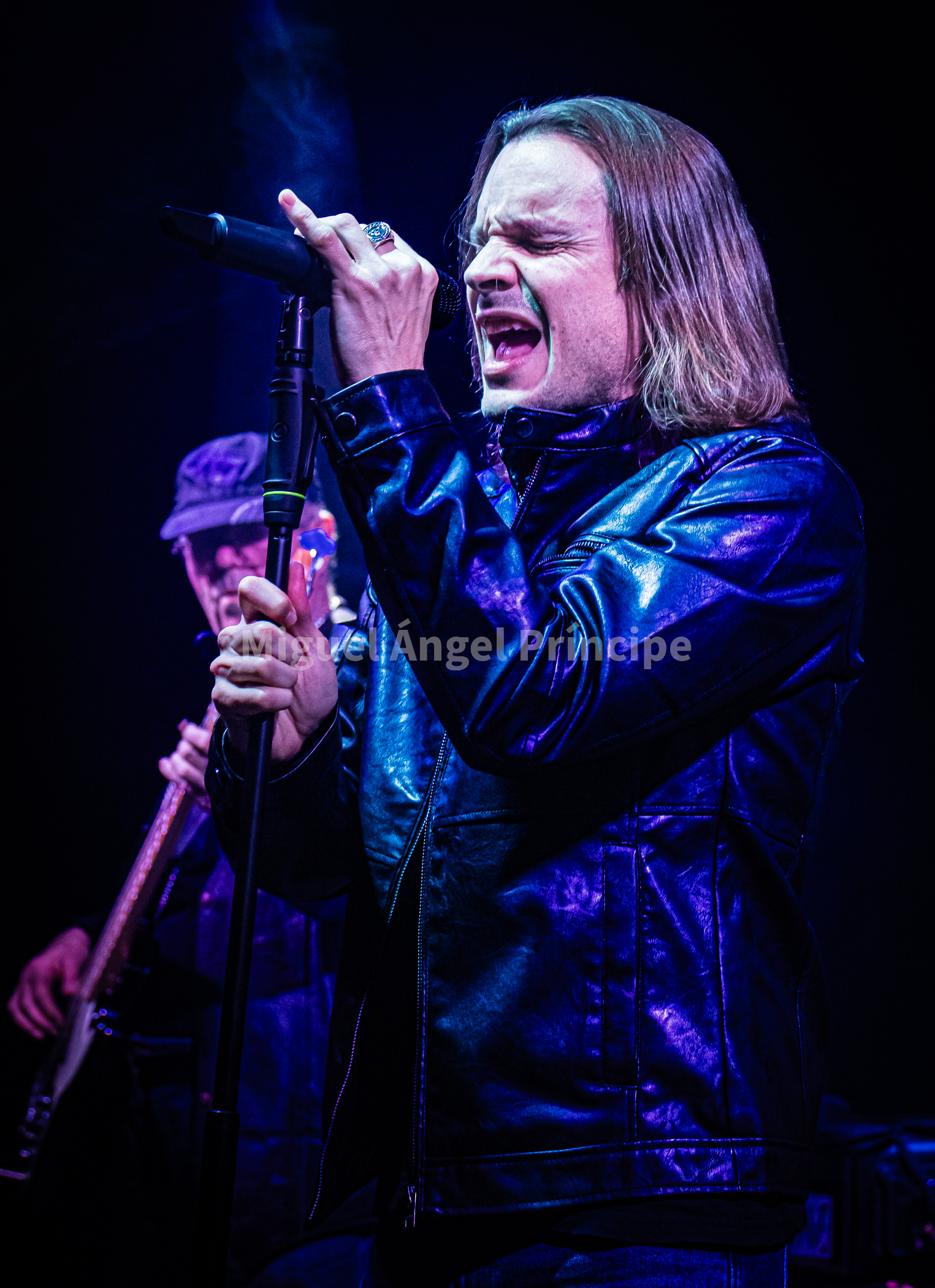 Arrancaban la noche ROJO FUEGO, la banda capitaneada por Luis Romero a la guitarra, Luis Garcés en la batería, y los prácticamente recién incorporados a finales del pasado año Mariano Juárez al bajo, y Andrés Villena a la voz. Heavy Rock al estilo más clásico, con un gran protagonismo de la guitarra de Luis, como apuesta segura fue lo que nos encontraríamos a lo largo de aproximadamente una hora que la banda estuvo sobre el escenario con temas como «Pecado Mortal» o «Mago del Tiempo» que servían para ir ajustando el sonido e ir animando en los primeros instantes a la sala, «La sombra del caballero» con un épico comienzo salido de las afiladas cuerdas de la guitarra de Luis y un tema que invitaba a tararear junto a la banda su oh oh oh oh y un magnifico solo central, era recibida entre aplausos, la noche continuaba con temas como «Aquilón» o «Esa Generación» daban continuidad a la noche, mientras que al presentar Andrés «Melodías de amor» nos daba la noticia de que en unos días Luis, daría el sí quiero a su pareja, a la que en su momento dedico esta canción.