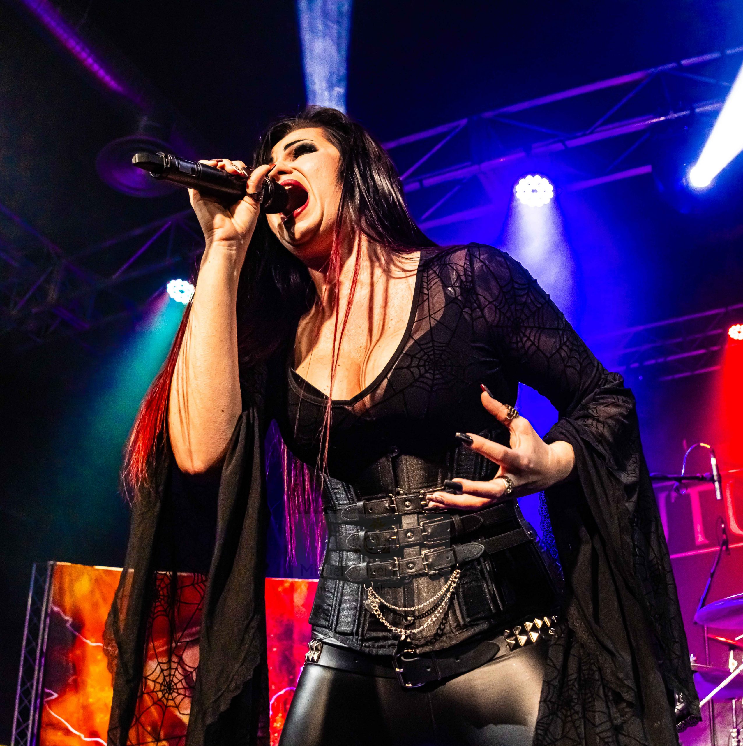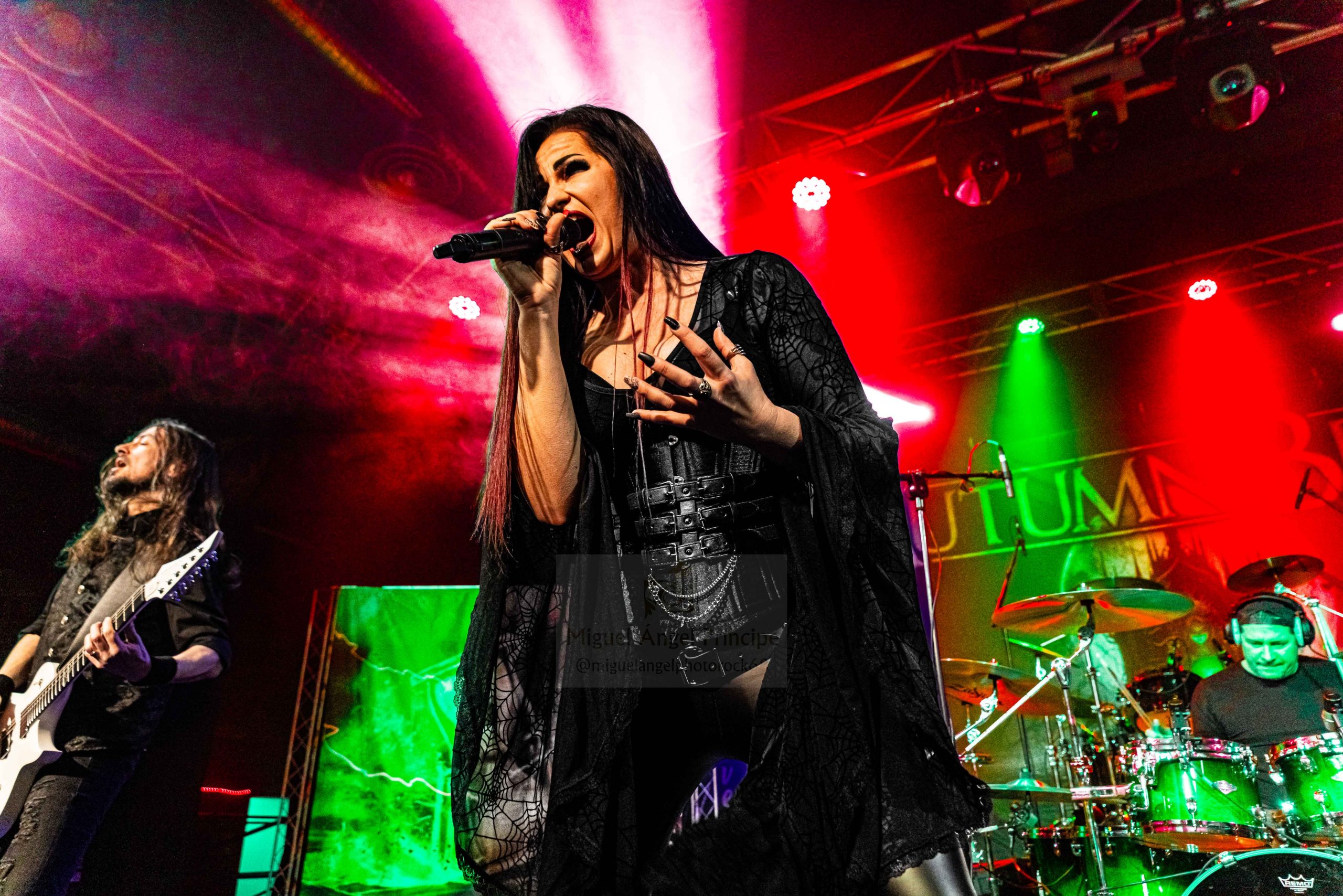 Una numerosa feligresía iba yendo en aumento y por su puntualidad mereció el premio que los vieneses regalaron ya desde el comienzo, pues la embelesadora garganta de la aguerrida frontwoman imparable sobre las tablas y generosa en speeches entre los temas se ganó por la mano a los asistentes con una voz embriagadora, dándose paso a la interesante «Underworld» en la que los slaps graves del bajista Ken buscaron un Gótico asumible y sencillo para sumergirnos de lleno no sólo en la actuación sino en una atmósfera paradójicamente intensa a la vez que ligera, encontrándose continuidad para el desarrollo natural del espectáculo en la siguiente «Foreign Flames» de nivelado lucimiento baquetero por parte de Maxi.