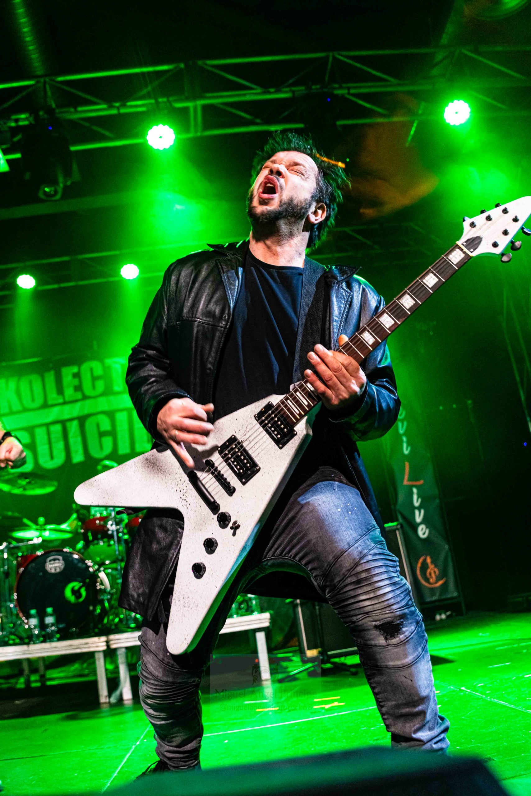 Con su nuevo y reciente disco La Sonrisa Del Perdedor prácticamente recién publicado e inaugurándolo en directo, los toledanos KOLECTIVO SUICIDA se presentaron ya desde el inicio con rabia e intensidad sobre la tarima para en su formato quinteto, adentrarnos en un trabajo apto para el show al contar como aliados entre otras virtudes con la dilatada trayectoria de casi tres décadas del grupo y con la vigorosidad musical que este trabajo contiene, pues sin dejar de lado su ya conocidísima bis Punk también pudimos disfrutar con melodías guitarreras no exentas de brillantez.