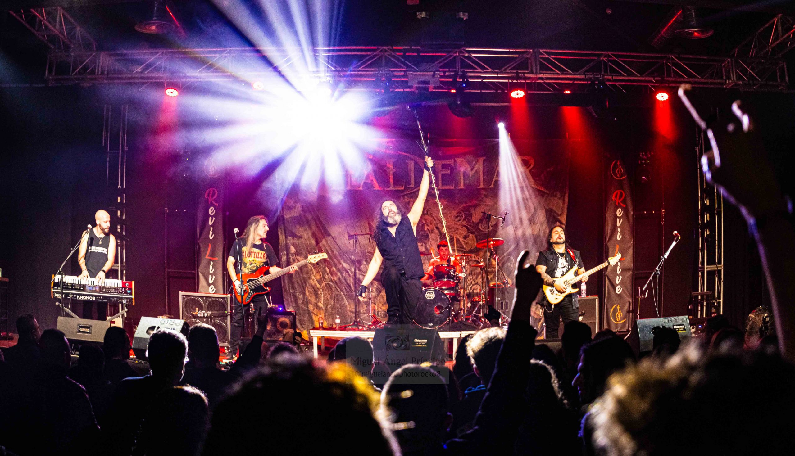 Tras el rápido e impecable cambio de backline al que la Sala Revi Live nos tiene acostumbrados, todo quedó preparado para el asalto a la tarima protagonizado por VHÄLDEMAR quienes llegados desde su Baracaldo natal, cogieron el relevo sin muchos preámbulos ante una más que preparada y abundante feligresía dispuesta a dejarse la piel con un Setlist repleto de Heavy & Power interpretado en esta ocasión con más mérito si cabe que el habitual, pues el carismático vocalista Carlos Escudero defendió la tarima con fiebre y circunstancias de salud adversas que para nada mermaron ni su voz ni su actitud.