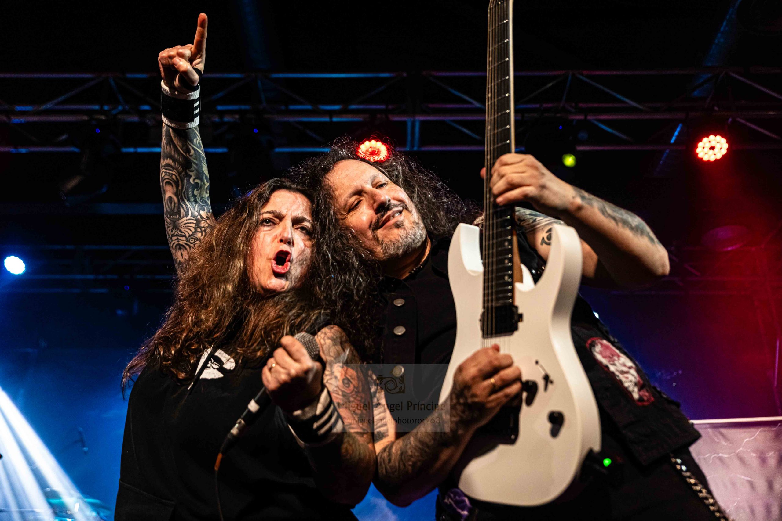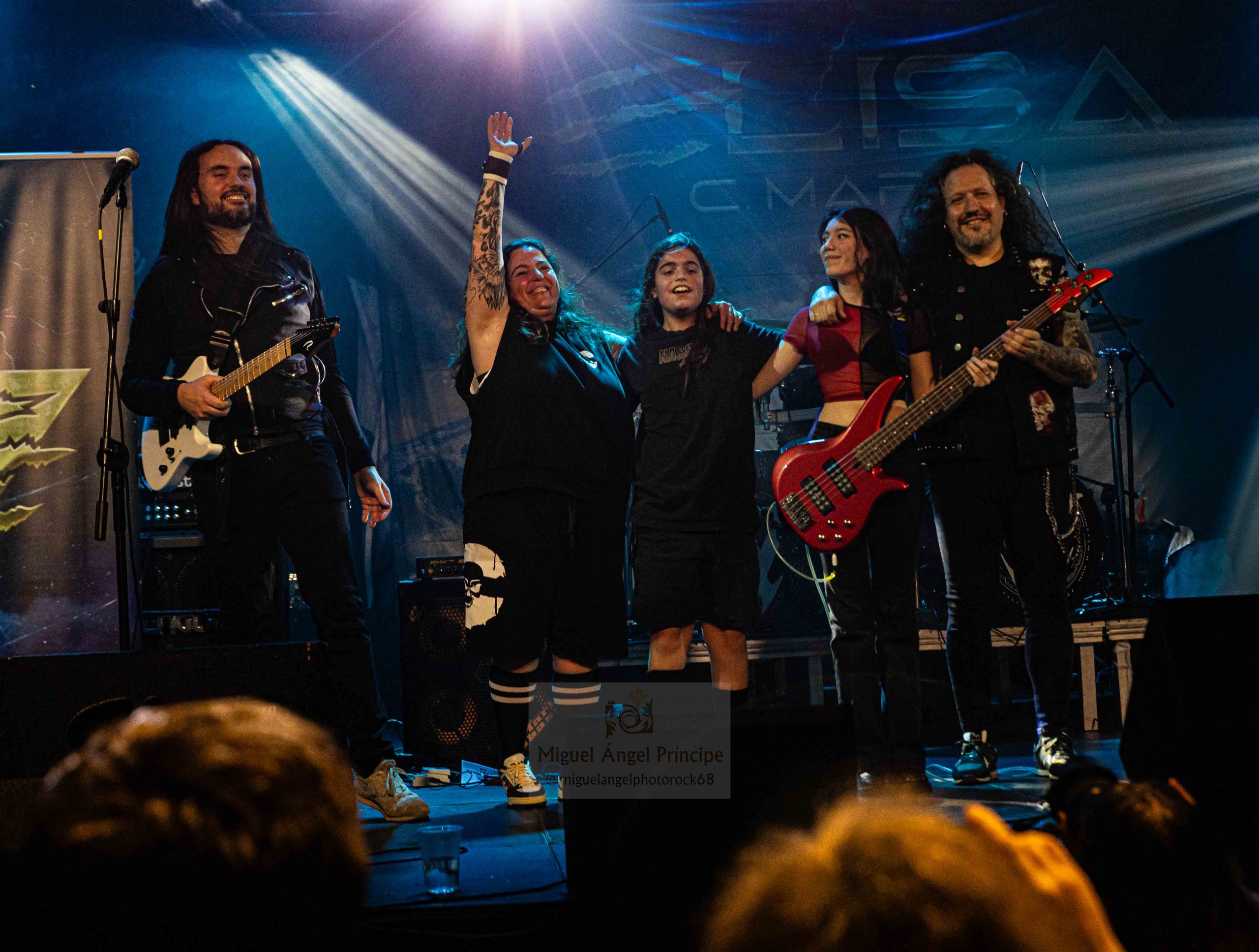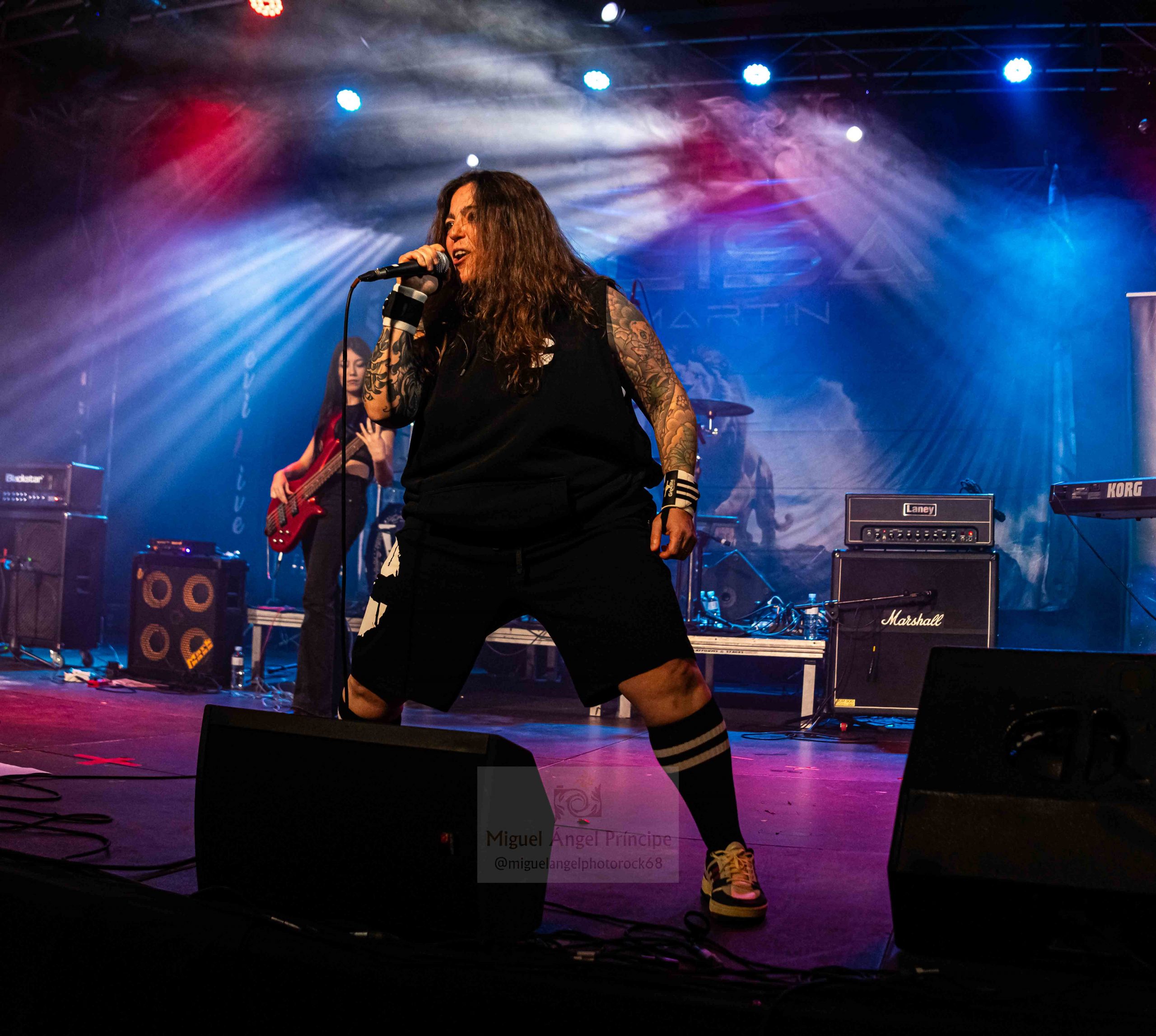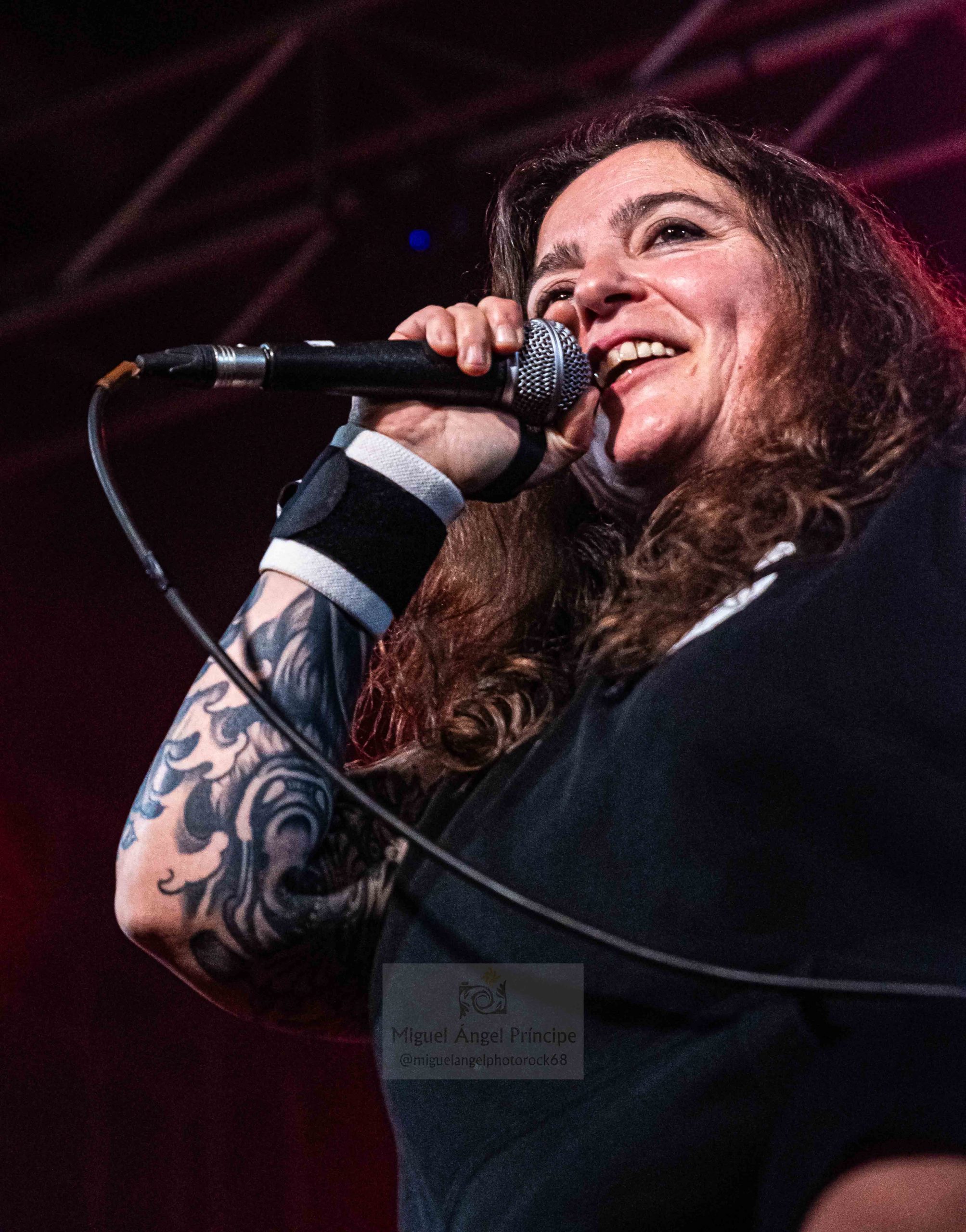 Manteniendo la velada una alta línea de calidad y creándose poco a poco una atmósfera cada vez más propicia para que el público interactuase con los músicos, llegó el momento de disfrutar con ELISA C. MARTIN cuya sola aparición sobre la tarima llenó ésta pues nuestra vocalista de raza y de Heavy Metal sabe arrastrar como un huracán a la gente que presencia sus directos, conminando siempre a la feligresía para que colabore en sus shows que van más allá de lo estrictamente musical al estar también a la altura de su indiscutible voz una actitud sobre las tablas tan vibrante como inapelable y contagiosa.