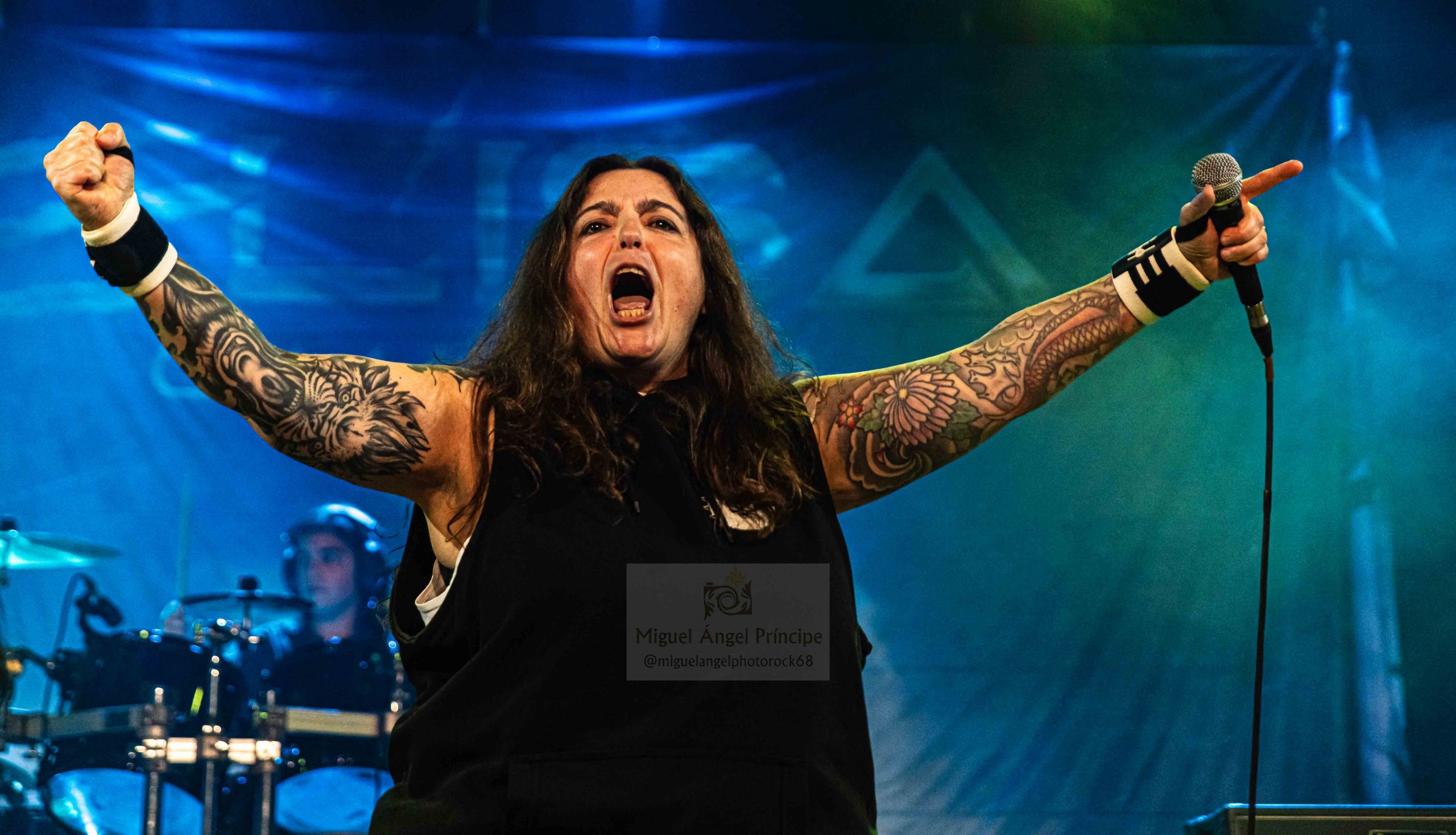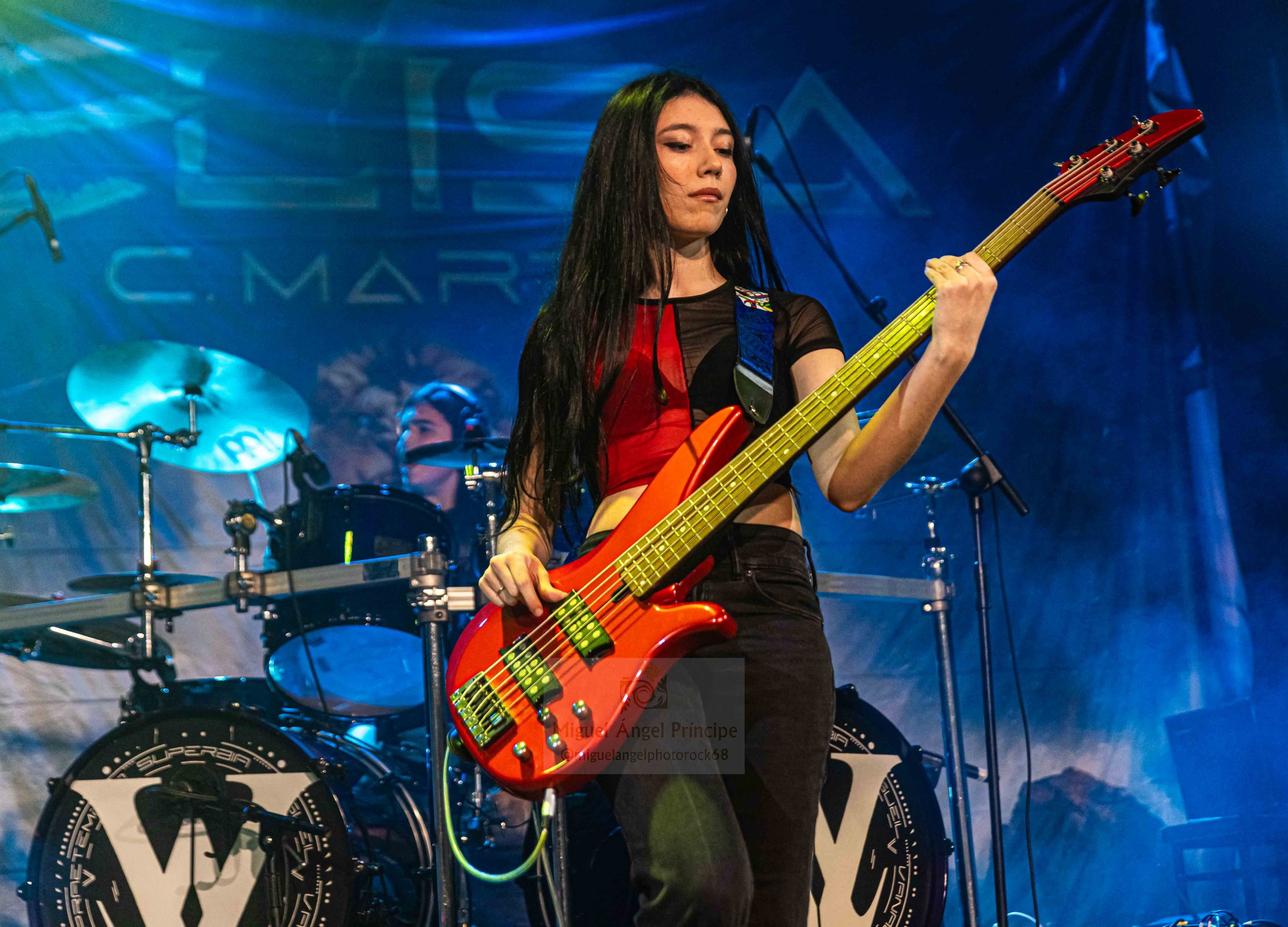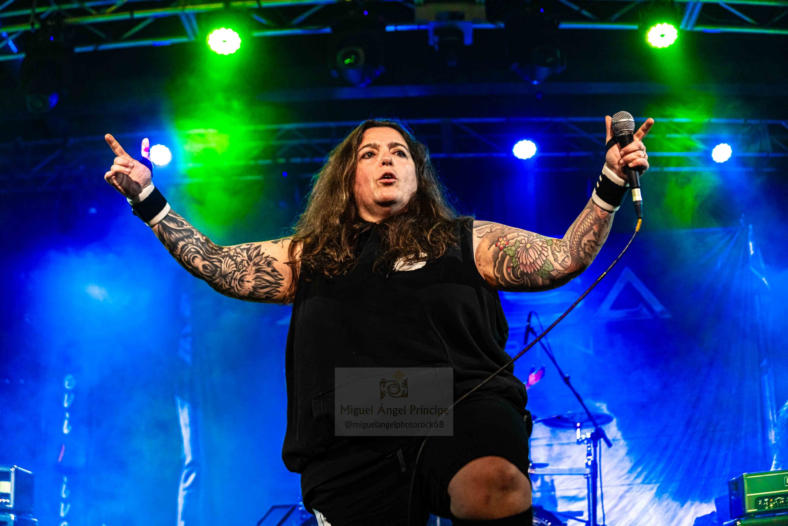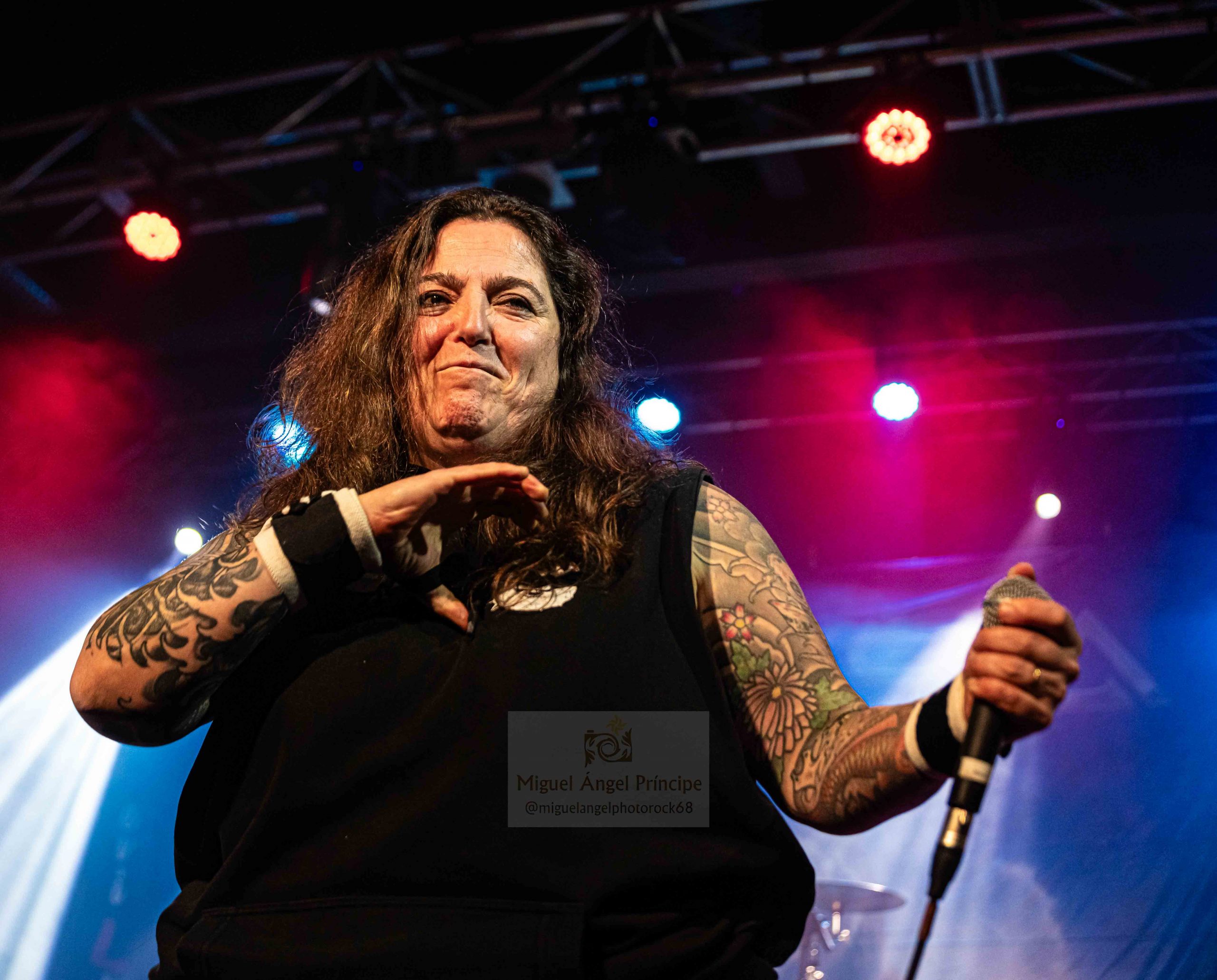 Manteniendo la velada una alta línea de calidad y creándose poco a poco una atmósfera cada vez más propicia para que el público interactuase con los músicos, llegó el momento de disfrutar con ELISA C. MARTIN cuya sola aparición sobre la tarima llenó ésta pues nuestra vocalista de raza y de Heavy Metal sabe arrastrar como un huracán a la gente que presencia sus directos, conminando siempre a la feligresía para que colabore en sus shows que van más allá de lo estrictamente musical al estar también a la altura de su indiscutible voz una actitud sobre las tablas tan vibrante como inapelable y contagiosa.