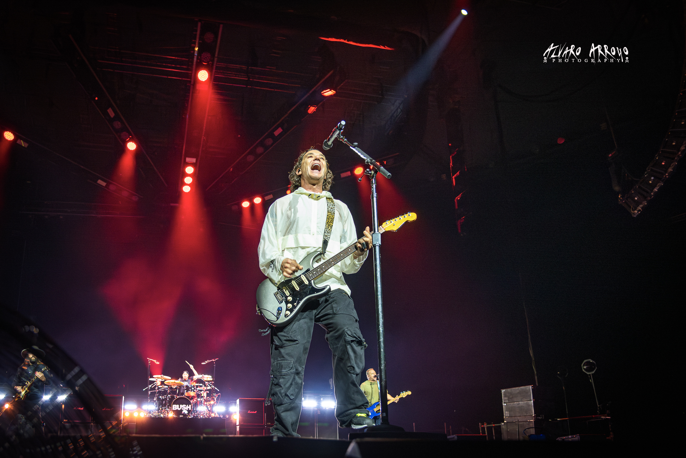 Gavin Rossdale tomaría el micro para en un meritorio castellano declarar lo mucho que le gusta venir a nuestro país antes de pasar a elevar ya hasta el final el ritmo de la actuación con una poderosísima «Identity», con guitarra y vocalista tomando la parte más cercana al público de la pasarela central para contonearse al ritmo de la oscura tonada. Ahora nos pide el vocalista «mucho amor para BUSH» y que presentemos las linternas de nuestros teléfonos móviles para acompañarle en solitario con su voz y guitarra en la coreada balada de su recordado debut Sixteen Stone del 1994 «Glycerine», dejando una de las mejores imágenes de la noche con el vocalista iluminado solo por dos focos rompiéndose sobre el micro de forma muy notable.