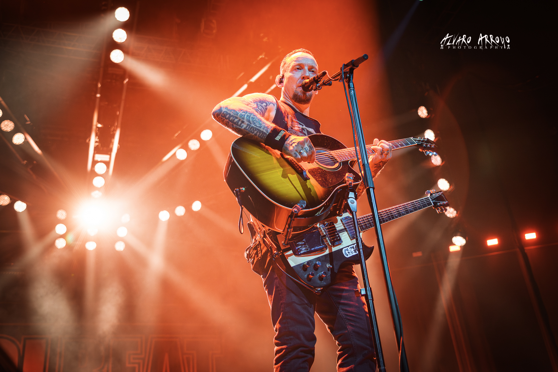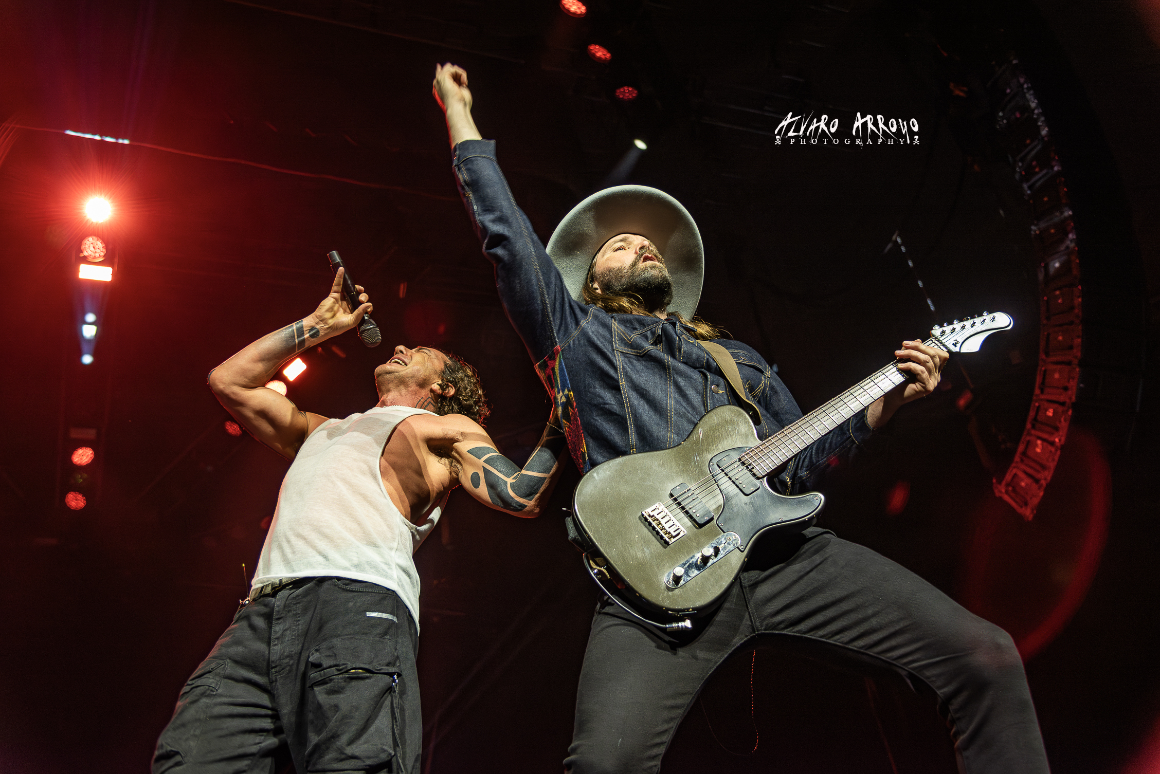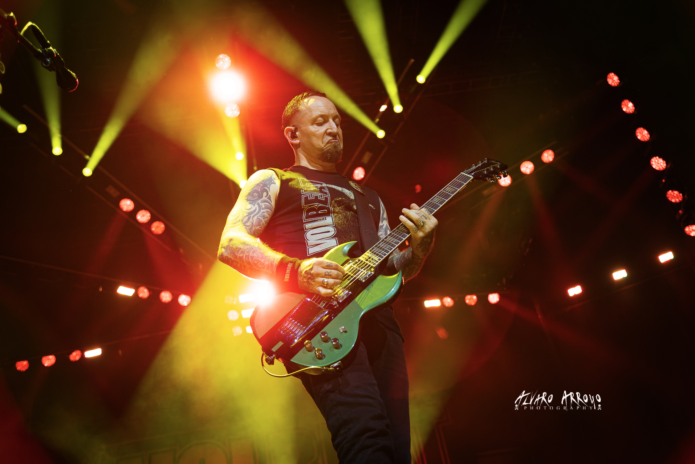 El sonido en pista era nítido con una puesta en escena sobria —tampoco VOLBEAT se excederían posteriormente en este sentido—, destacando sobre el juego de luces unos frontales rojos situados a media altura sobre la estructura de altavoces del escenario que elevarían la experiencia de la hipnótica y de tintes progresivos «Heavy Is The Ocean», antes de que otra de las pertenecientes al álbum The Art Of Survival del 2022 como «More Than Machines» nos trajera por fin a primer plano la labor a las seis cuerdas de Chris Traynor con un riff sincopado conduciendo el tema, rematado con una excelente labor sobre el pedal de wah-wah.