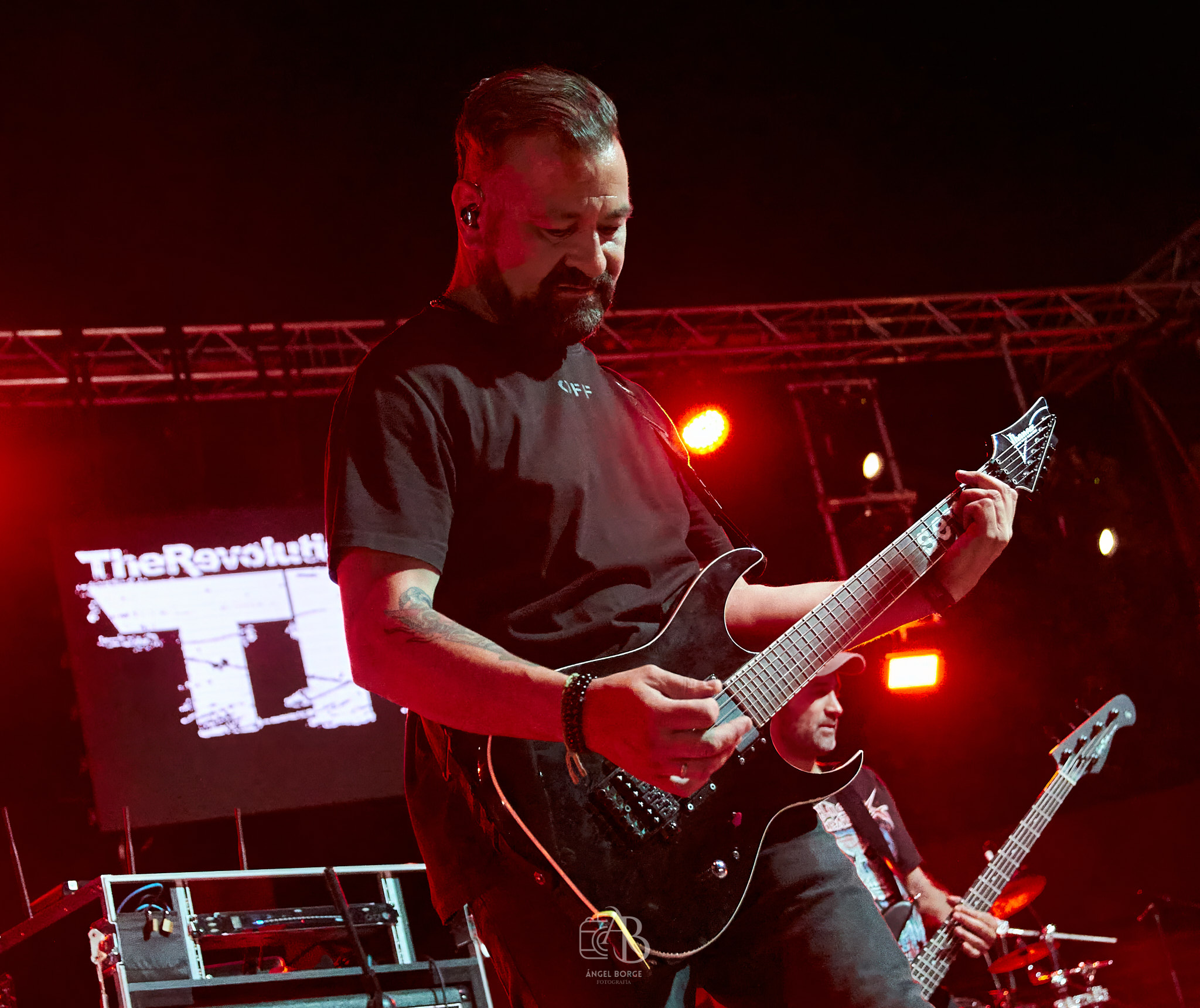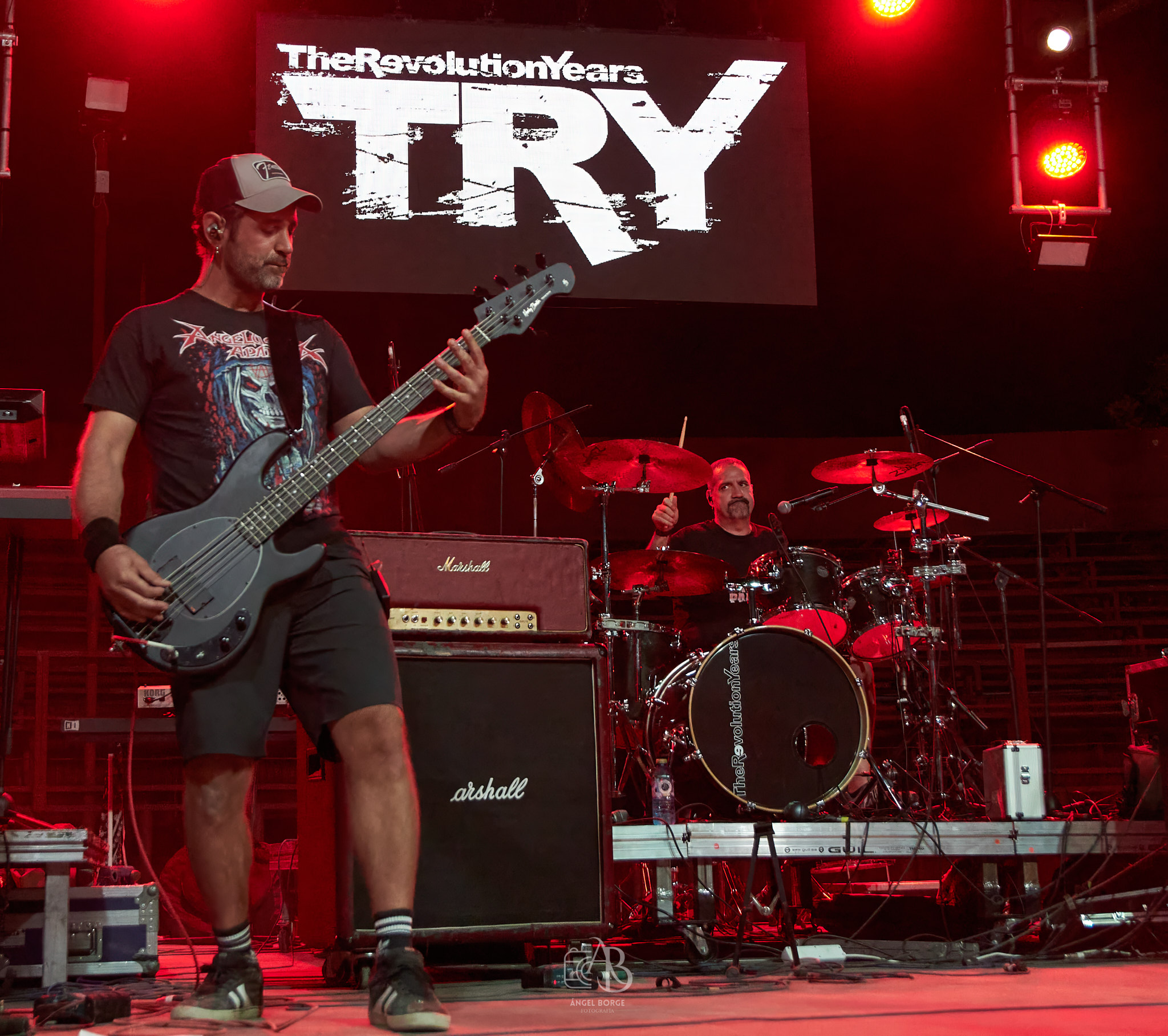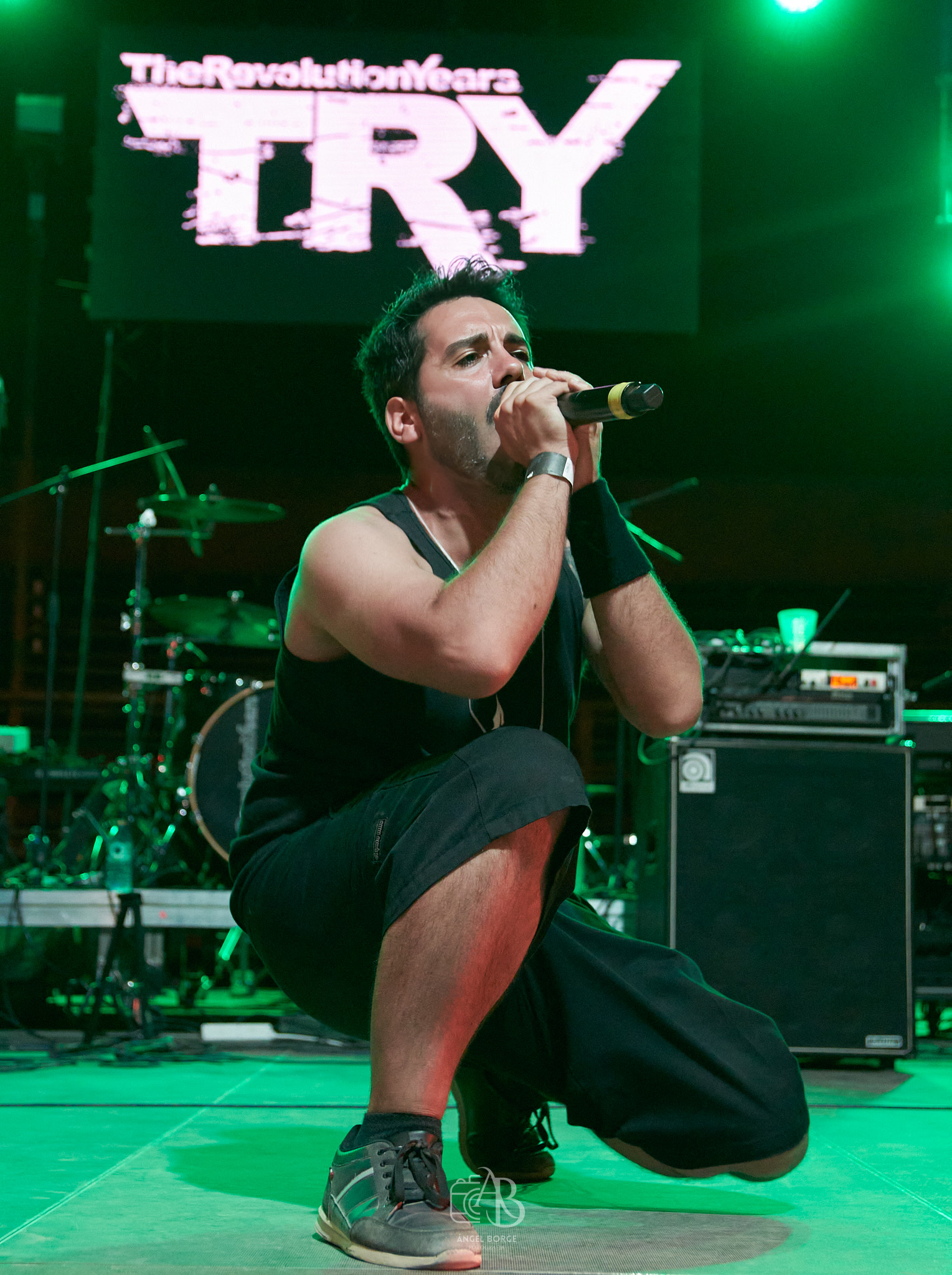 Tras algo más de dos horas de retraso, el coso taurino recibió en su arena a una feligresía que se fue acomodando para disfrutar de la primera descarga de la velada gracias a TRY-THE REVOLUTION YEARS, quienes a las 22:45 ya bien entrada la noche se subieron al escenario haciendo gala de sus característicos riffs y entregada actitud empezando con «Victim No More» con su frontman Jorge incitando desde el inicio a la gente para ir entrando en calor, estando acompañado el vocalista por Javier al bajo y la explosión tanto de David como de Francisco a las guitarras con Antonio al frente de la batería para seguir este combo de Nu Metal desgranando temas de su álbum The Art Of Words, un trabajo que vio la luz en el 2012 sonando entre otras canciones como «Run With Me», «Folowing The Flock», «Life» o «The President Is Dead» debiendo recortar el quinteto su Setlist al igual que le ocurrió al resto de formaciones debido al retraso en el inicio del Festival.
