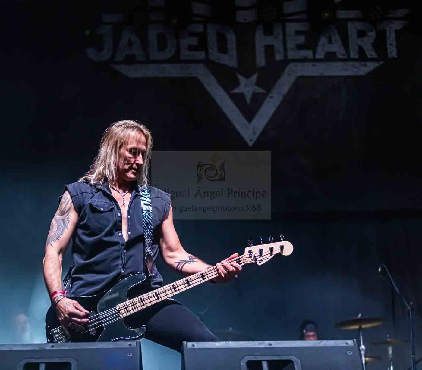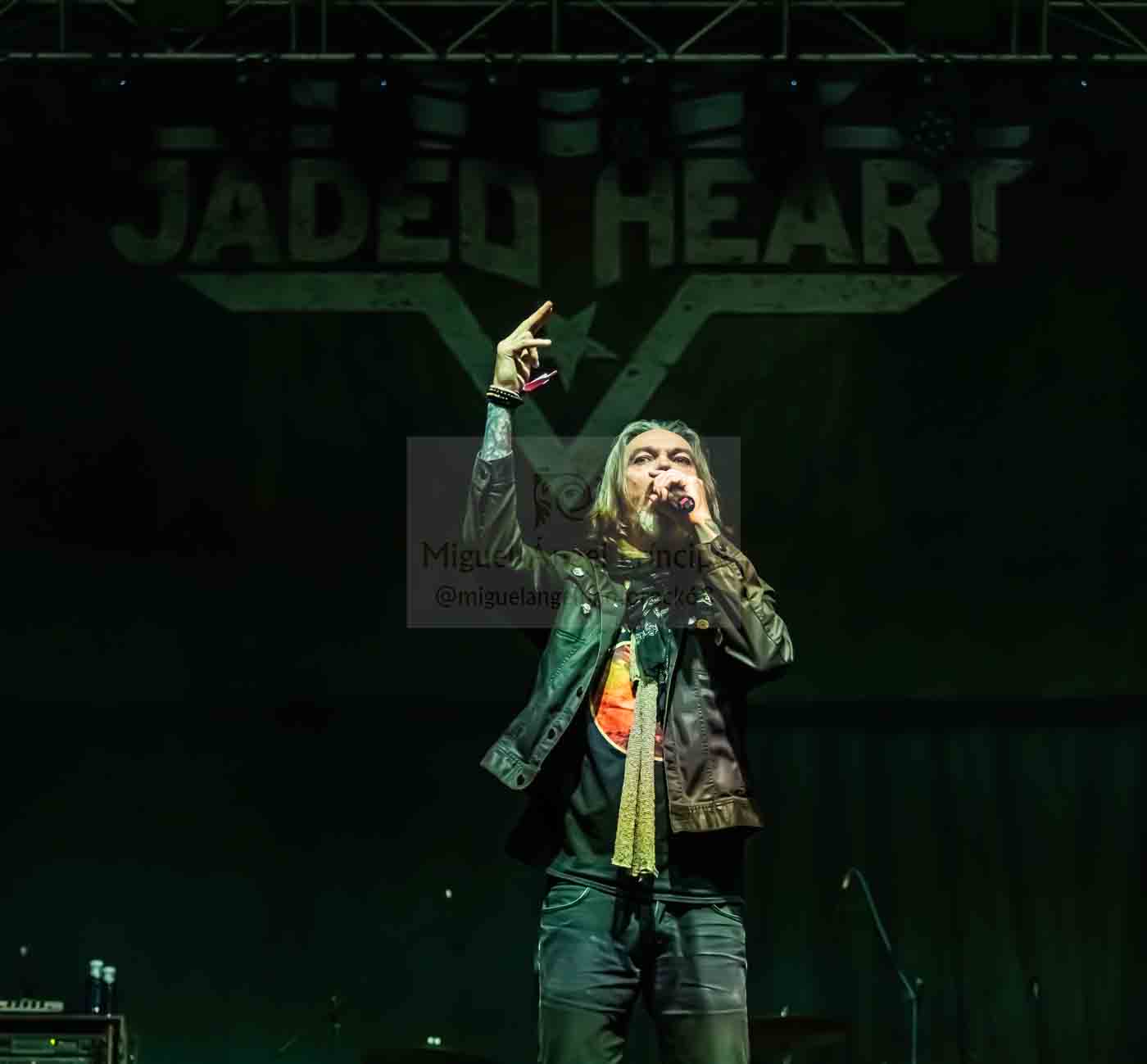 JADED HEART desde Alemania cogió rápidamente el relevo sin dar tiempo al enfriamiento de la feligresía que cambió de tarima en tiempo récord para acercarse a disfrutar de acordes más endurecidos y de un ritmo más marcado a cargo del bajista Michael Müller como único miembro original de la banda, un cuatro cuerdas curtido que supo imponer melodía acaparando con los slaps protagonismo y gestionando una pauta muy bien seguida por sus compañeros que defendieron con garra un repertorio repasando trayectoria.