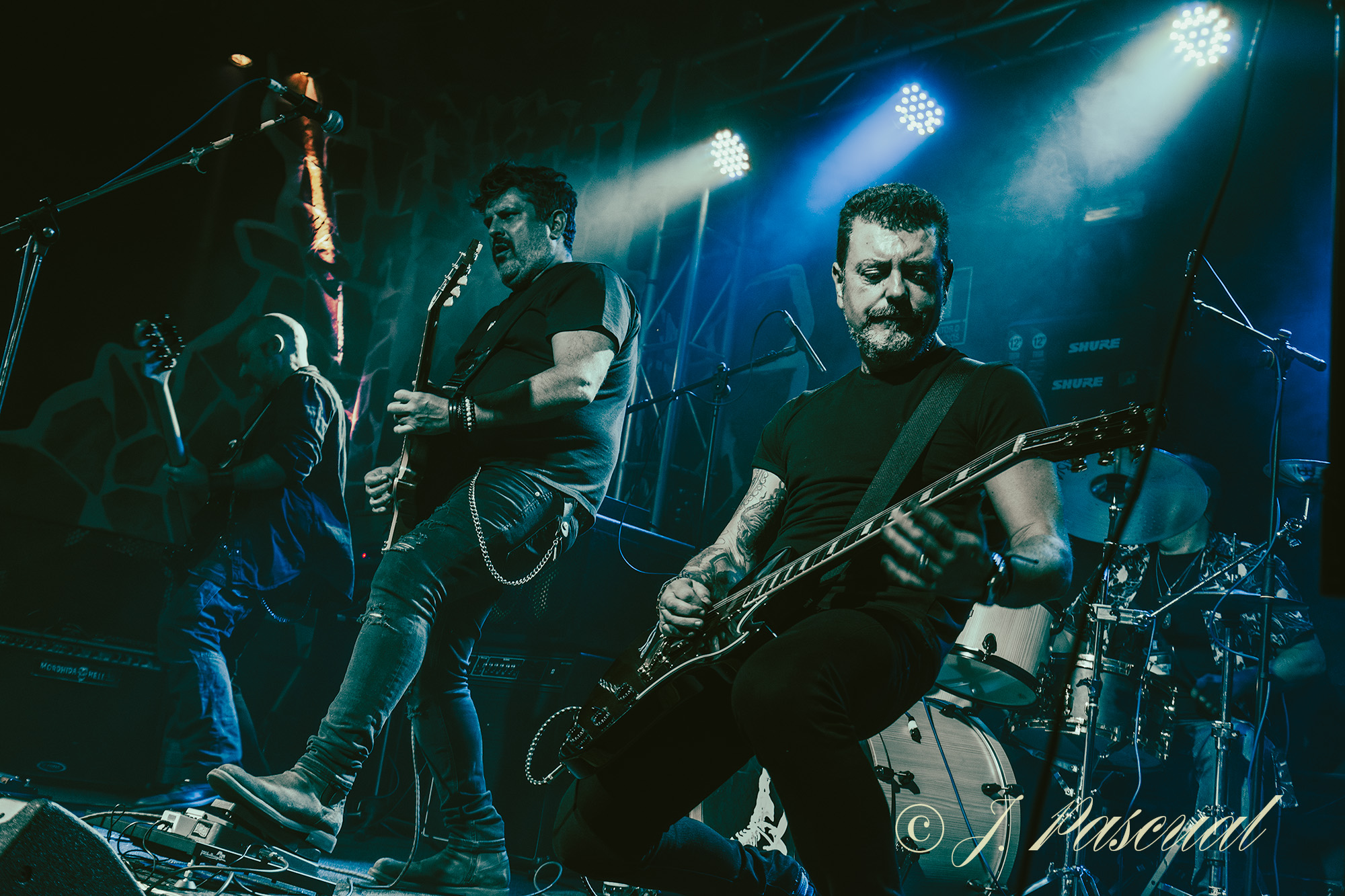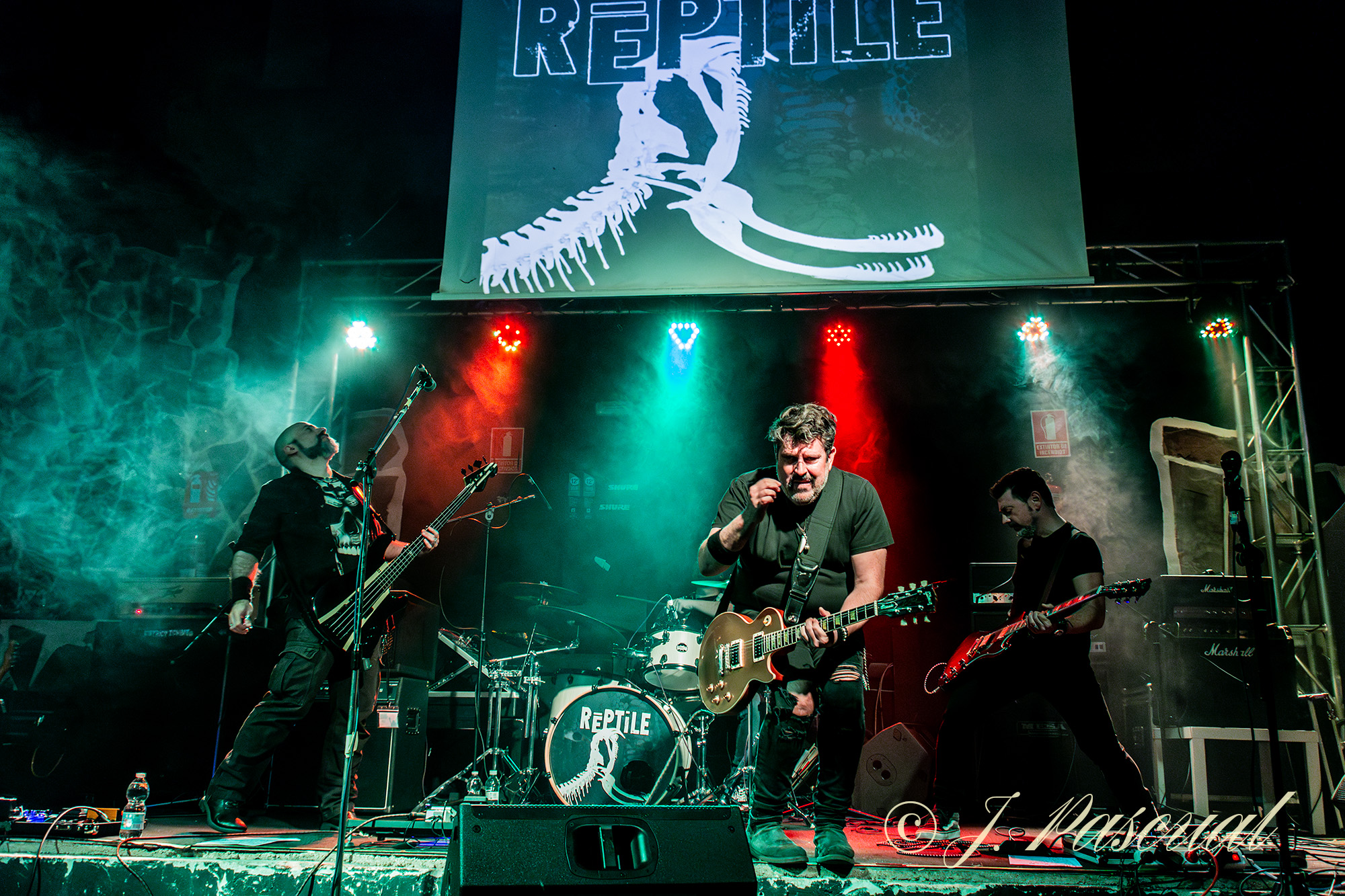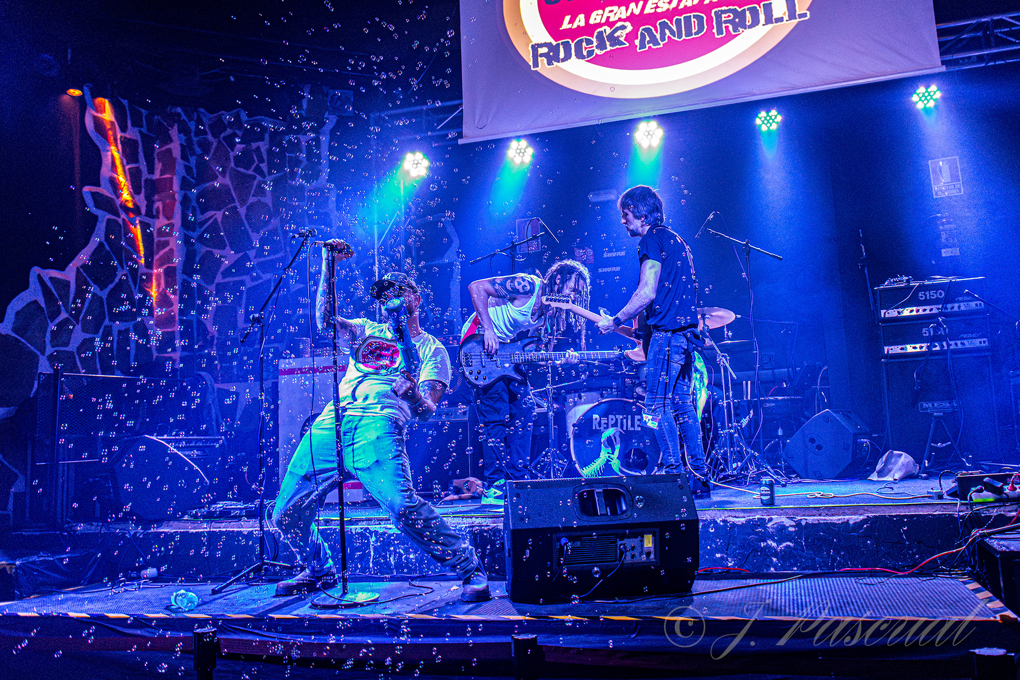 Un breve receso para los perceptivos cambios en el equipo y ya teníamos sobre el escenario a RĒPTILE, ejerciendo en esta ocasión Nuria de presentadora, con la banda ya sobre el escenario que arrancarían con «Religión y Ley» guitarreo al más puro estilo AOR, incluido en su último trabajo Animales Salvajes con el que Dani Sánchez a la voz y guitarra, Alberto dB Caballero a la guitarra, Javier P. Vera en la batería y Sergio G. Mislata al Bajo, atraparían ya a una sala cada vez más animada, encabezada por los organizadores del festival a los que pudimos ver en primera línea disfrutando de la descarga. Mientras la banda sin apenas descanso continuaba con su descarga ofreciéndonos ahora dos temas «Subir a Respirar» y «Tus Fantasmas», incluidos en su anterior trabajo Ruido Orgánico. De regreso a su último trabajo «Enloquecer» nos mostraba de nuevo a unos RĒPTILE, más Hardrockeros y contundentes, para llevarnos tras un pequeño alegato contra el maltrato, en cualquiera de sus variantes por parte de Dani, a las atmosferas más psicodélicas de «Adriana Desesperación» entre los aplausos del público.