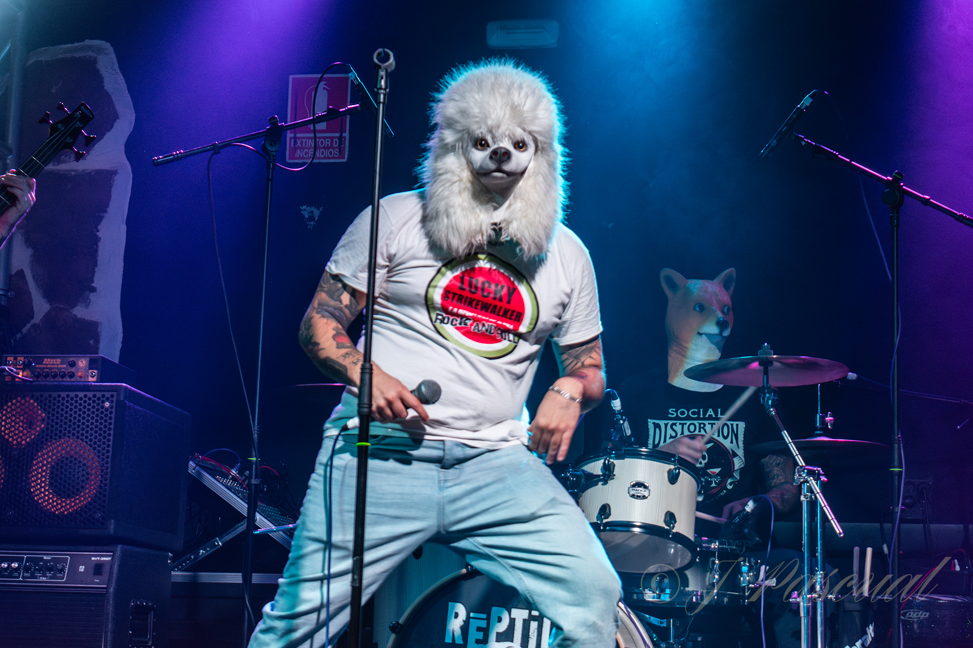 La parte más gamberra, del concierto basada principalmente en el primer trabajo de la banda arrancaría con «Chica Krytonita» puro Rock&Roll que acababa enlazado con su particular versión del «Johnny B. God» de Chuck Berry, convenientemente tuneada para convertirse en Johnny Rotten. Si es blanco y en botella en el caso de Los Lucky no puede ser otro tema que «Malibu» con el que el buen rollo seguiría garantizado, para seguir con aire festivo pero cierto mensaje de fondo, algo común en todas sus letras con «Polvo de Hadas» aderezando ese aire festivo un poco más las burbujas de jabón disparadas por Dani, durante el tema. «Marciano» y «Mendigo sin Tregua» se adentraban en la recta final, en la que sus ya características máscaras de perro, no dejaban lugar a dudas de que «Que Vida Más Perra» era la escogida. Resumiendo un buen concierto de una banda a la que hacía ya unos años que no veía en directo y personalmente creo que ha ganado enteros y madurez sobre el escenario en este tiempo, con un sonido mucho más compacto donde tanto Juanfran, enchufado a las seis cuerdas, como la magnífica base rítmica, en la que destacaría sobre todo el gran trabajo de Gabriel con el bajo, unidos a la voz y el carisma de Dani, supieron conectar con el público de la Vizzio.