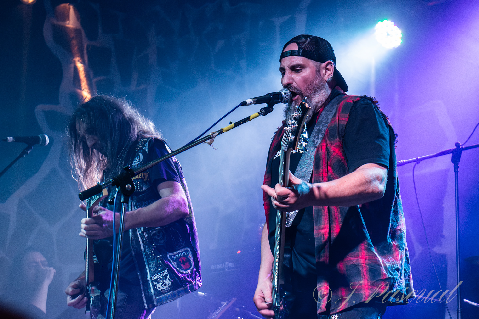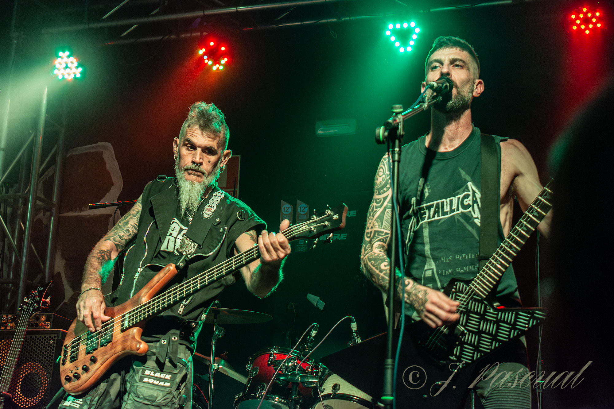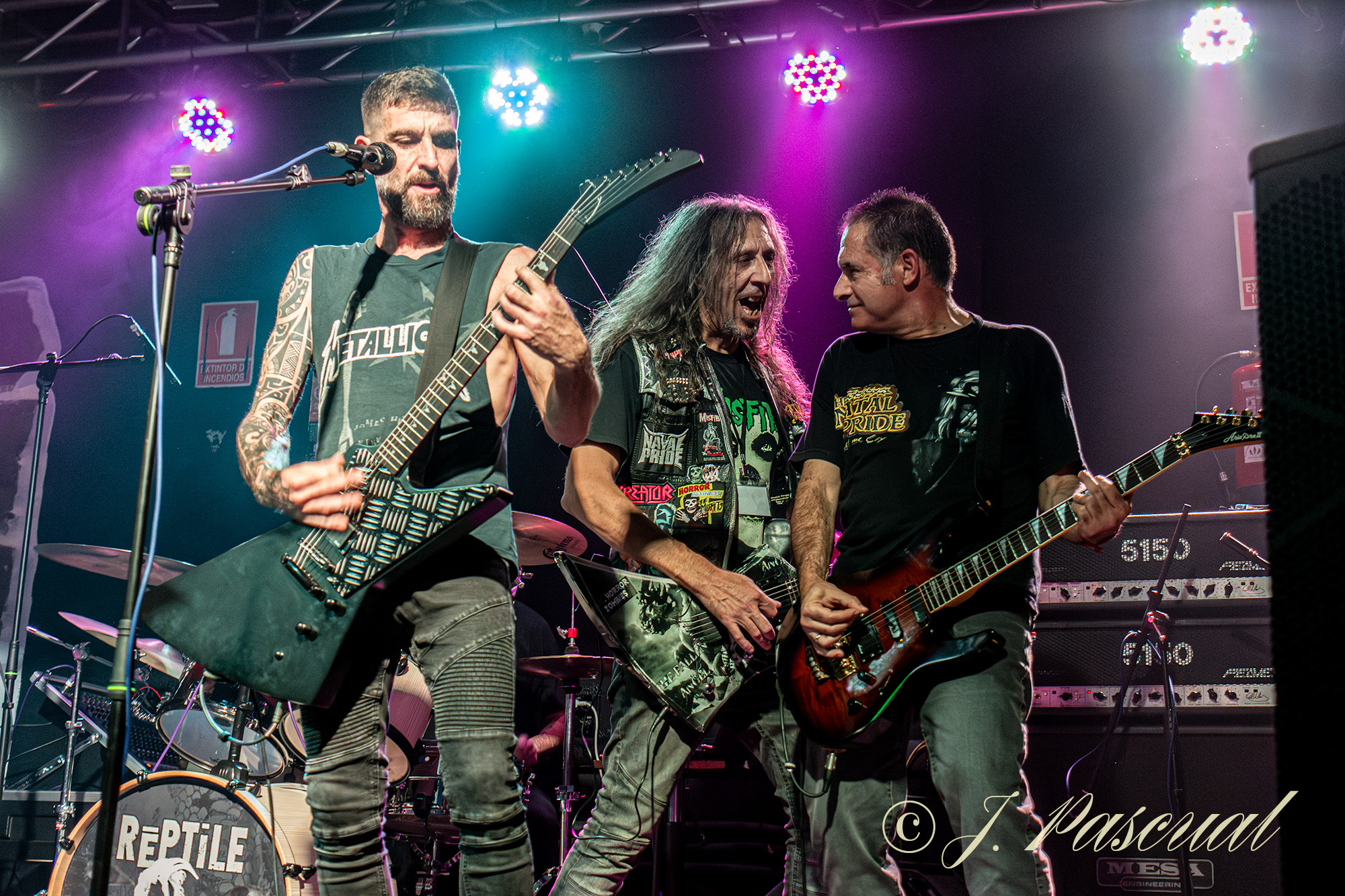 El plato fuerte de la noche, llegaba con la vuelta a los escenarios tras su último parón de una banda mítica y pionera del Thrash Metal patrio, NATAL PRIDE que en esta ocasión se presentaba con la baja de Sebastián Arroyo a cargo de las cuatro cuerdas, que unos días antes sufrió un ictus, pese a lo cual, acabaría subiendo en uno de los temas, motivo por el cual Carlos Llamosas, no solo se ejercería como vocalista, sino que también se haría cargo de ocupar el lugar de Sebas a las cuatro cuerdas, acompañado por Jorge Castro guitarra y coros, Flavio Orozco e Iván Moreno completando el triunvirato guitarrero y Oscar Chamorro a la bateria. Tras la correspondiente presentación esta vez a cargo de Miguel Ángel «Supersopa» y unos pequeños problemas técnicos, con la Intro rápidamente solucionados, a cuyo termino llegaba la tralla sin contemplaciones de «Death, Love, Pain & Hate», tralla que no cesaría, ya hasta el final de la noche mientras ya los primeros y tímidos pogos, se hacían sentir entre las primeras filas, «In Free» y «Chaos in Your Brain» continuaban con el ritmo rompe cuellos, para relajarlo brevemente con un tema un poco más rockero «I’m Not Alone» e ir subiendo revoluciones de nuevo con «Prode & Feeling» que pese a su inicio más calmado poco a poco va in crescendo retomando el subidón de metal, que provocan NATAL PRIDE en cada una de sus actuaciones.