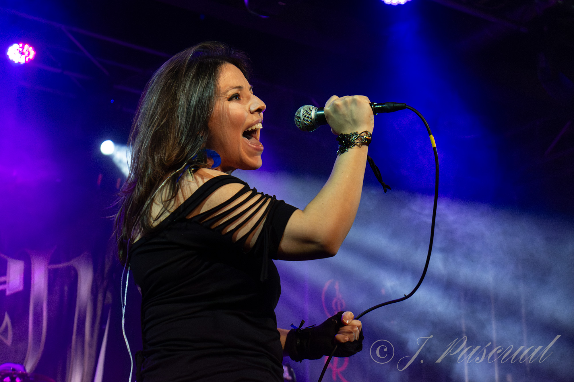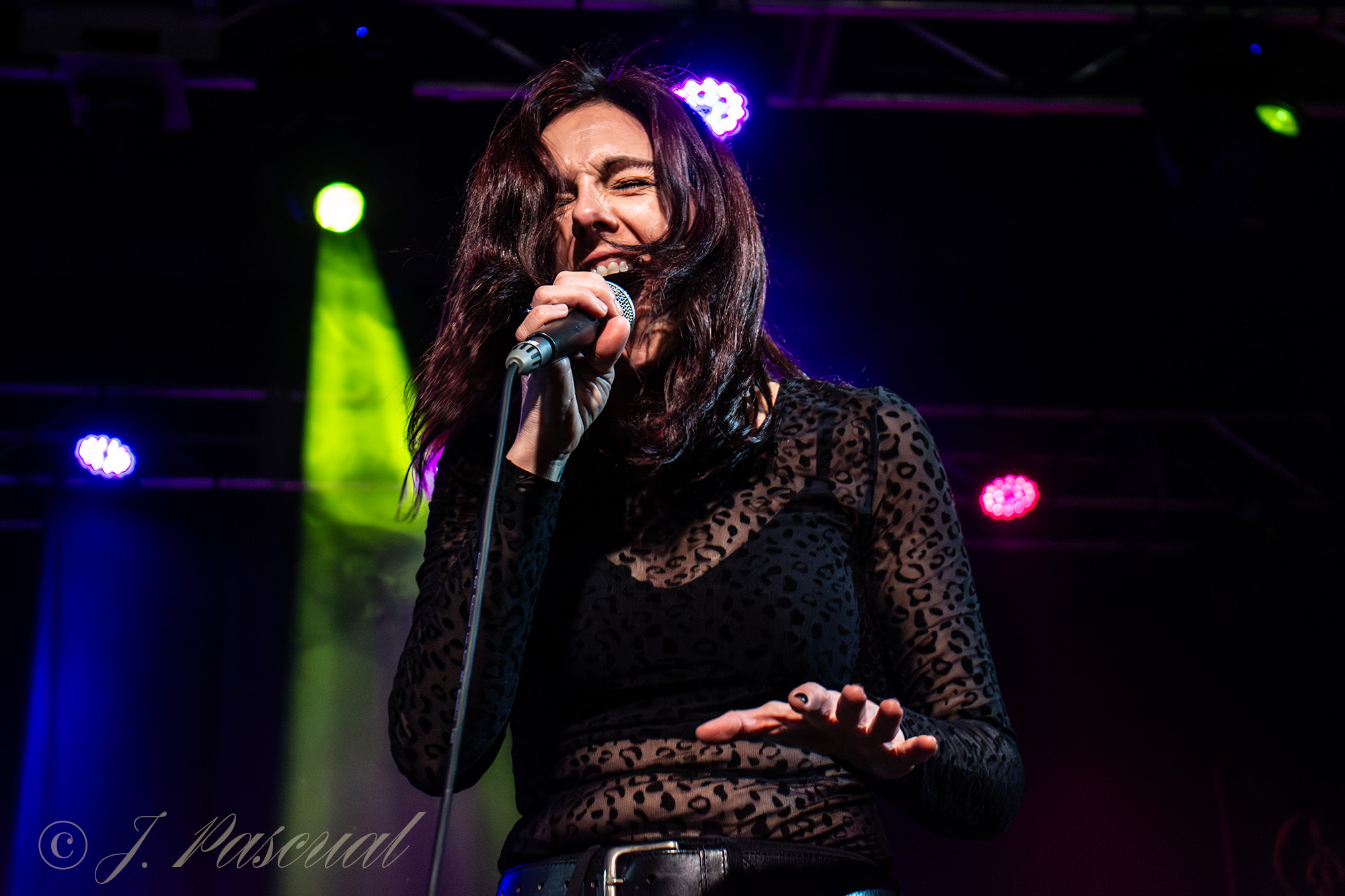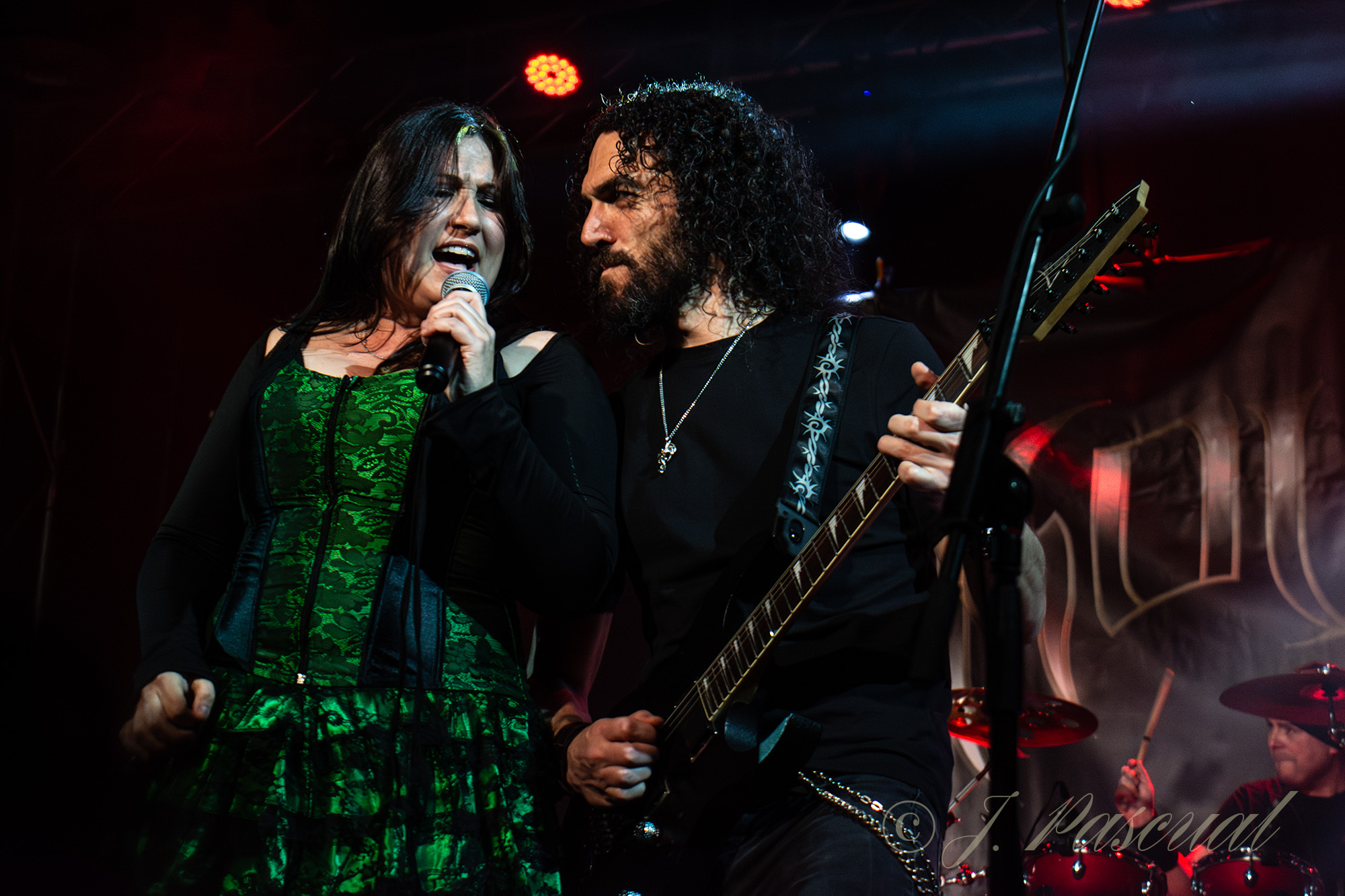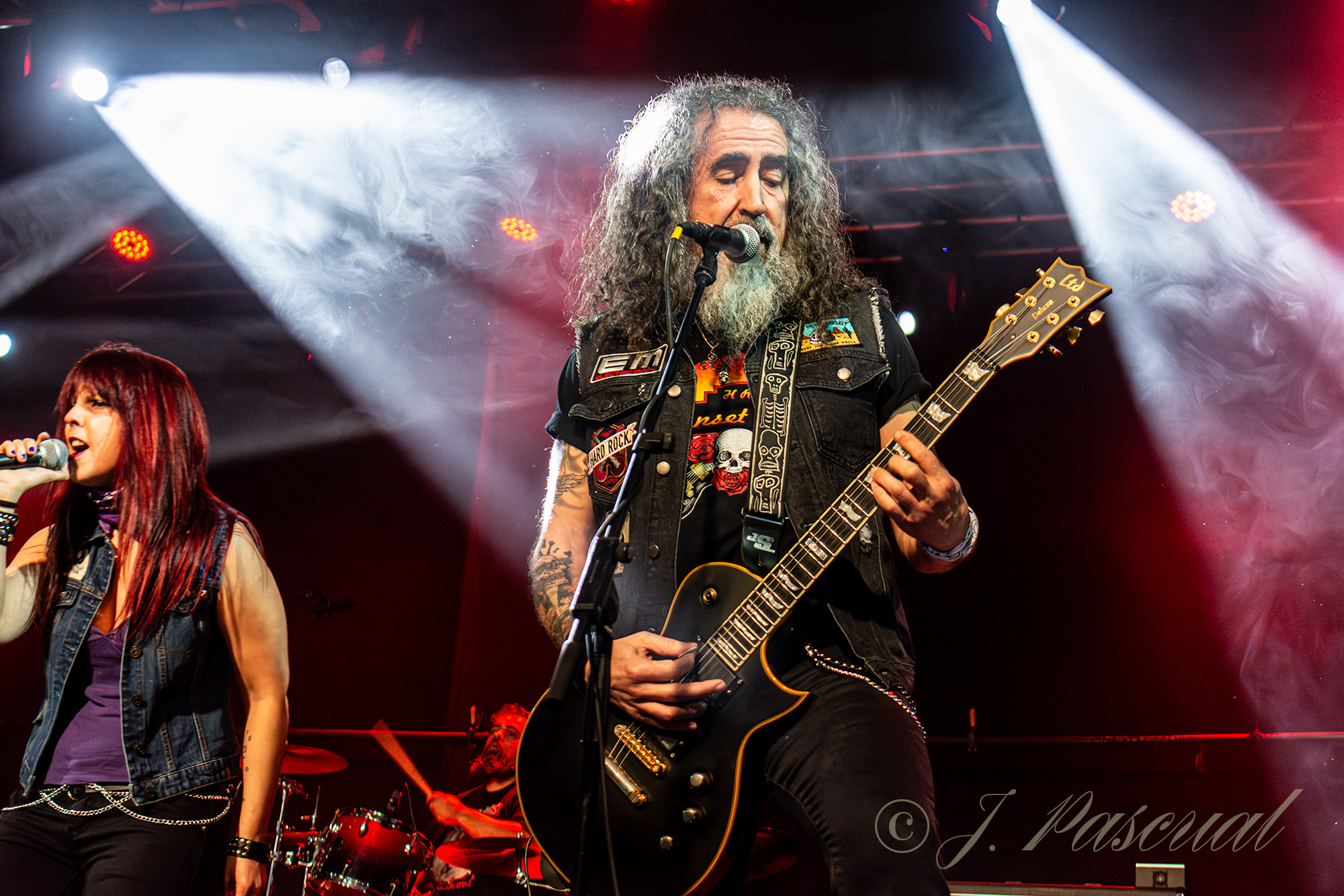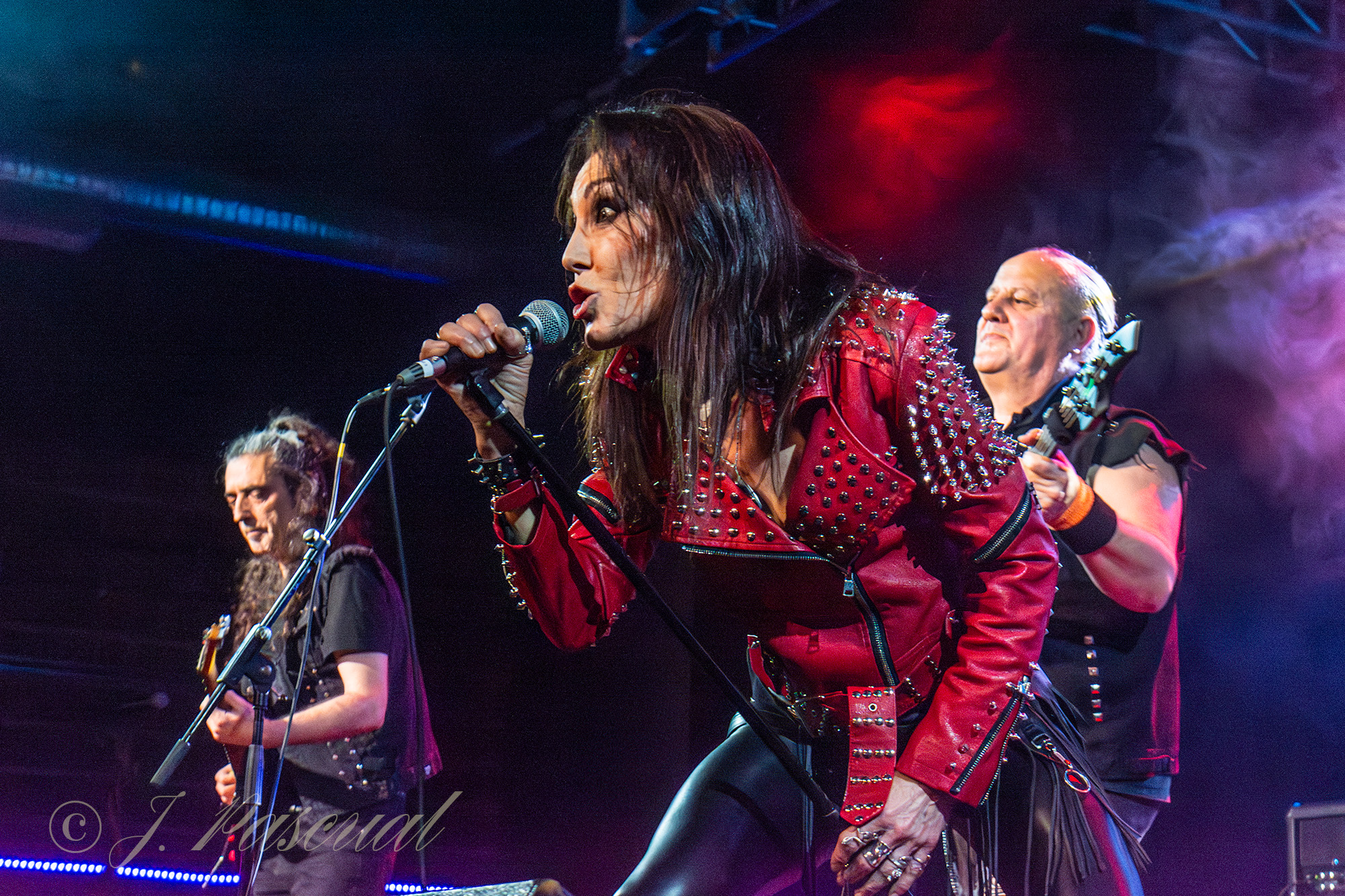 Joana abandonaba brevemente el escenario mientras el resto de la banda con Carlos a la voz, se marcaban una versión del «Metal Gods» de Judas Priest, que sonaría brutal como lo podía ser menos con ese cuarteto de músicos de auténtico lujo. Con Amaro nuevamente sobré el escenario llegaba el momento de revisitar sus anteriores trabajos, precisamente «Carmen de fuego» el tema que dio titulo a su disco de retorno al panorama musical en 2013 era el tema escogido para este nuevo bloque, enlazando con «Libertad» para ir in crescendo en intensidad con temas como «Sexo» o «Sueño» donde la La garganta de Joana brillaba en todo su esplendor, mientras las guitarras de Karlos y Félix entrelazaban sus melodías. «Fuego» y «Muerde» dos temas que destilan puro Hard rock directo y potente nos acercaban a la recta final a punto de cumplirse la hora de su descarga.