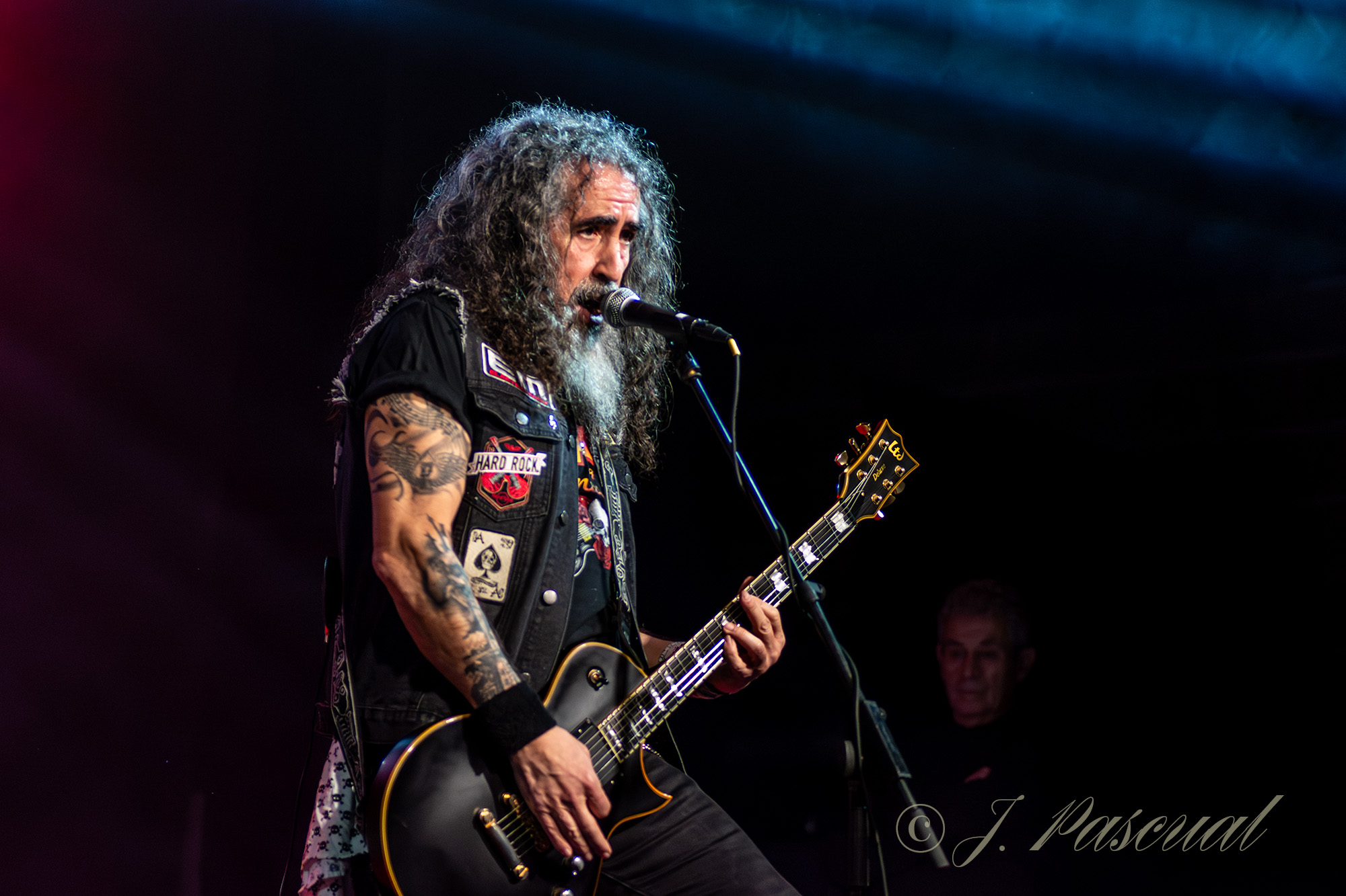Si la noche ya estaba resultando intensa y la potencia y entrega de toda la banda, mantenía a toda la sala rendida ante ellos, la recta final no podía defraudar arrancando con la veloz y enérgica «Rabia» puro Heavy ochentero, para trasladarnos a tiempos mucho más lejanos con «Señores de la guerra» y adentrase en los terrenos del Rock sureño con «Veneno y miel» y una nueva vuelta a los orígenes para los más nostálgicos con «Bajo presión» que era aprovechado para presentar a la banda, y despedirse brevemente antes del bis final, en el que nos pedía ayuda para bajar al foso y cantar desde el mismo con ayuda del público «Amo el Rock & Roll» versión castellanizada del clásico de Joan Jett & the Blackhearts «I Love Rock’n’ Roll» para disfrute de todos los presentes y despedirse ahora si definitivamente entre una gran ovación