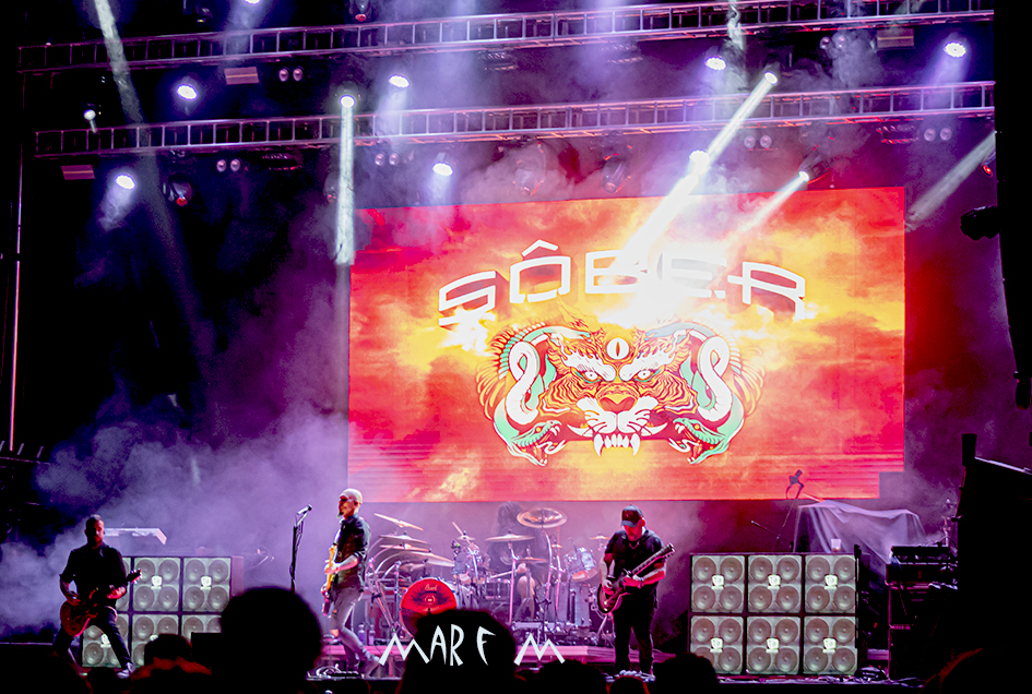De nuevo SÔBER comenzaba su actuación con bastante puntualidad, pero con ellos eso se acabó y comenzaron los retrasos. Aparte de comentar que debían ir rápido por la falta de tiempo, también se alegraron del buen tiempo que habían tenido durante el día, y era verdad, aunque se ve que nadie les contó que hicieron bien en venir abrigados, ya que las noches leonesas suelen ser frías, y de hecho esta noche el aire era fresco dentro de la plaza de toros. Había que mover el cuerpo para entrar en calor, y el público lo hizo con ganas, al ritmo de las canciones de los madrileños. Se hizo cortísima la descarga. Alardeando de talento, Carlos iba presentando sus temas más populares asociándolos a frases inteligentes: “La Araña«, «Sombras«, «Blancanieve”, “Tic Tac”, “Paradysso”, “Arrepentido”, etc. Entre los numerosos agradecimientos, hubo otra cariñosa nota para la ciudad de León. Y entonces, sin querer, cuando ya se habían despedido, SÓBER cometió un pequeño gran error. El público, lógicamente, pedía más. Y los dos Escobedo, más Reyes en la batería y Juan Sánchez en la guitarra no dudaron en tocar “Loco”, que, como todas sus canciones, venía acompañada de un atractivo audiovisual en la pantalla del fondo del escenario. Por este motivo, SÔBER dejó muy contenta a la audiencia, pero provocó un retraso que acabarían pagando quienes menos lo merecían, justo al final.
