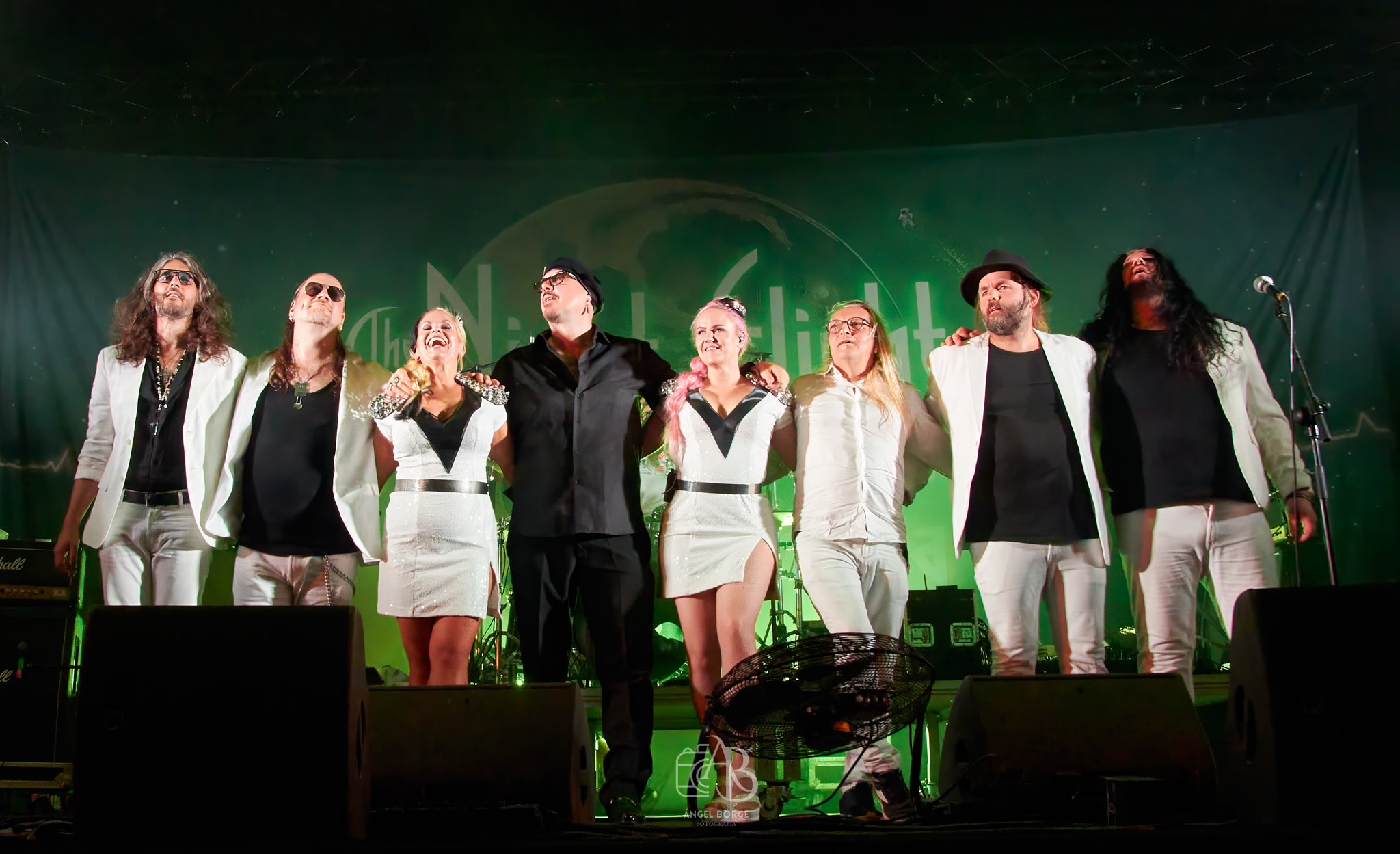 Una vez entrada la noche pasamos el control de equipaje, el control de billetes y nos acomodamos en nuestros asientos para disfrutar del vuelo nocturno de THE NIGHT FLIGHT ORCHESTRA que sale a pista a la hora fijada. El octeto de procedente de Helsinborg (Suecia) lleva desde 2007 surcando los cielos con su Hard Rock melódico y el recuerdo en su música y estilo a la década de los 80.