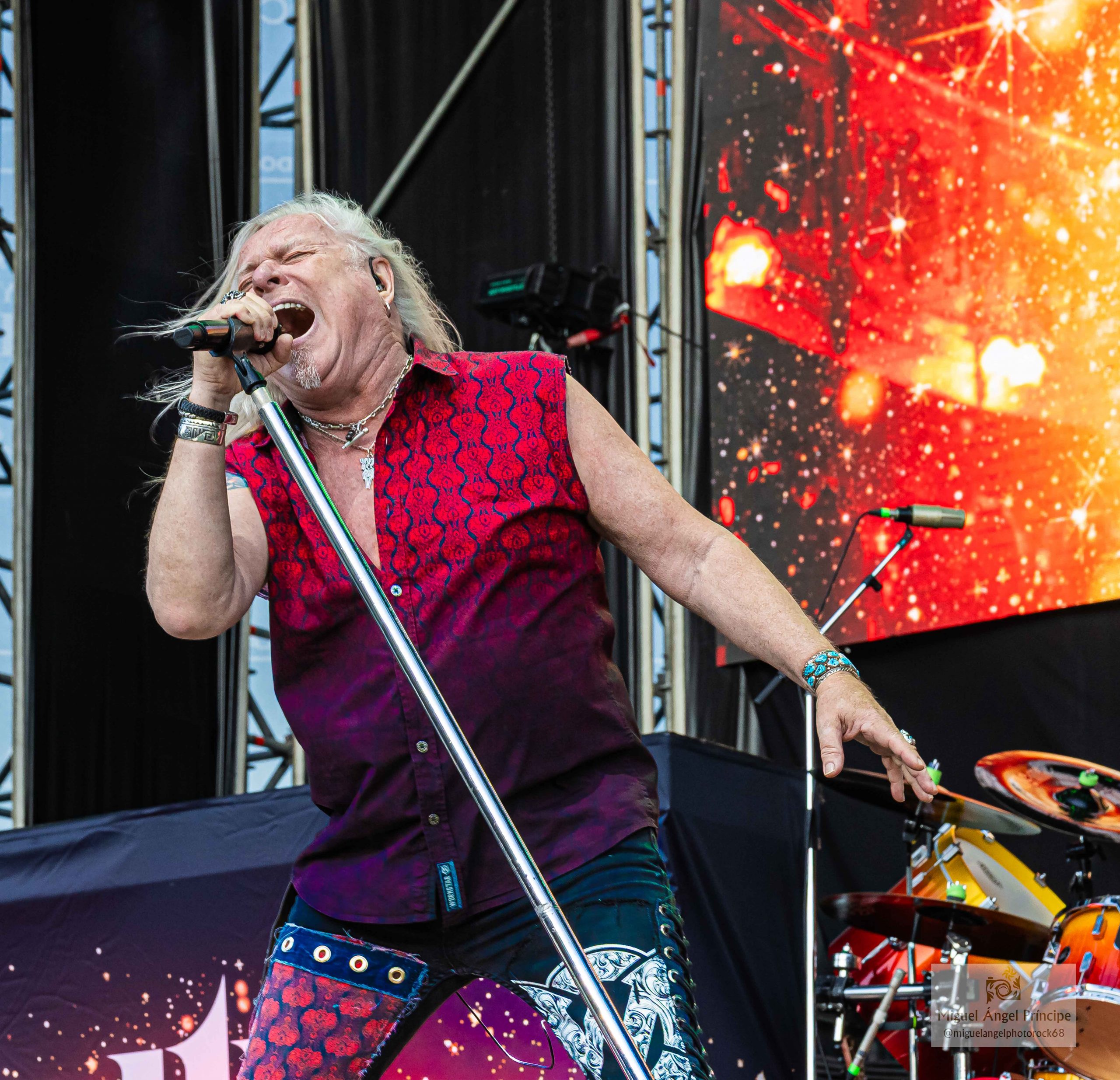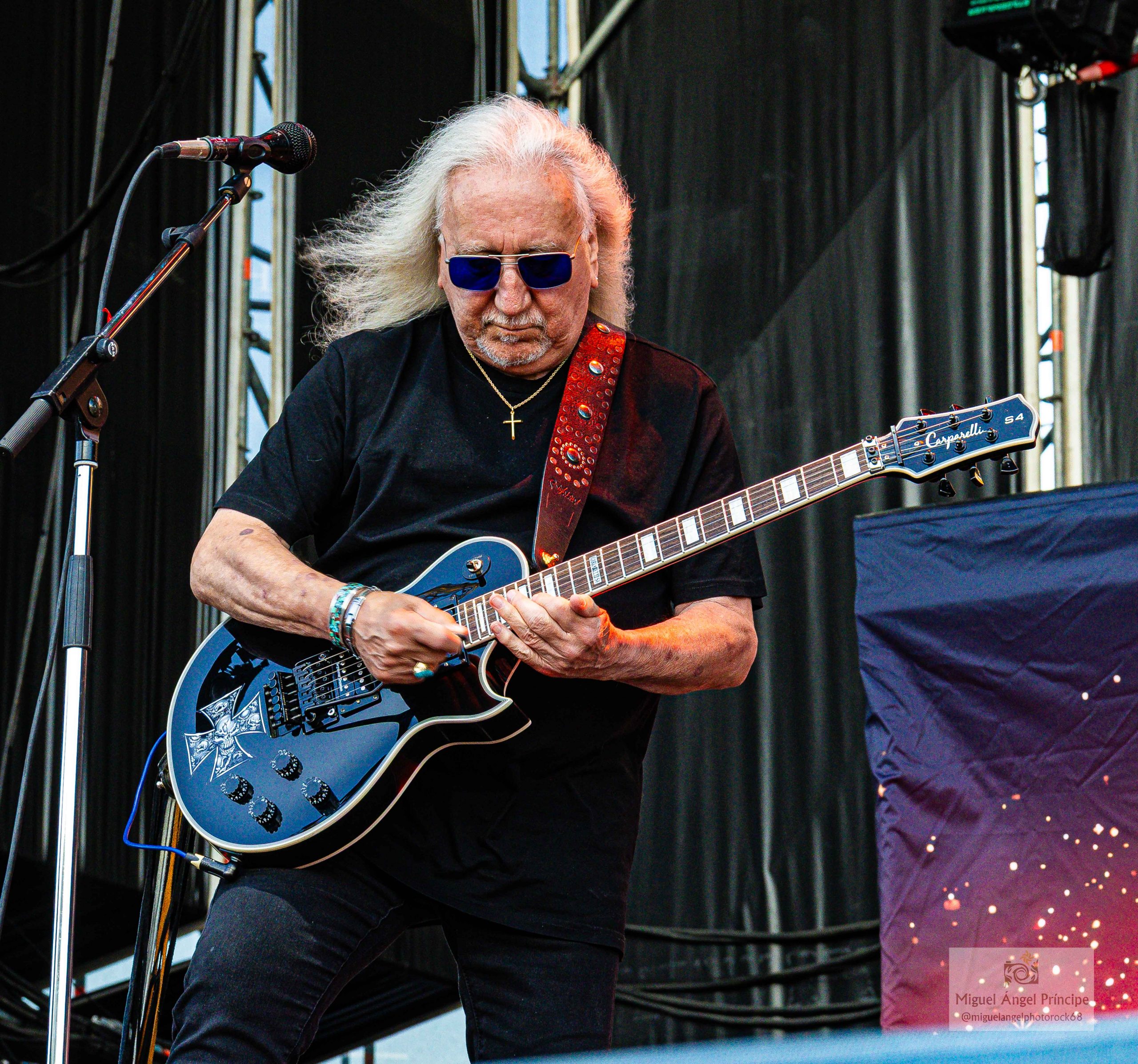 URIAH HEEP, los muy esperados y queridos dinosaurios británicos que desde el año 1969 llevan repartiendo felicidad cuando mucha de la gente que los esperaba en el Sun Stage aún no había nacido o estaba en preescolar, se enfrentaron a las 21:00 horas a todos esos rostros de admiración y respeto mezclado todo ello con una emoción potenciada al poder disfrutar de sus legendarias canciones con el Mar Mediterráneo de fondo y un atardecer inspirador que pareció agradecer al grupo su visita a nuestro país, siendo estelar por lo sencilla la aparición de Mick Box como el único miembro original de aquella formación primigenia quien no escatimó en humor, empatía, complicidad y sobre todo en riffs.