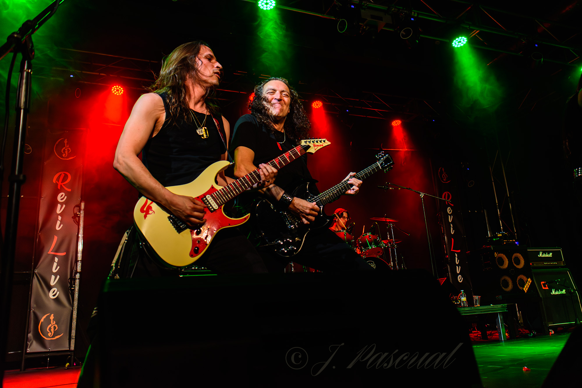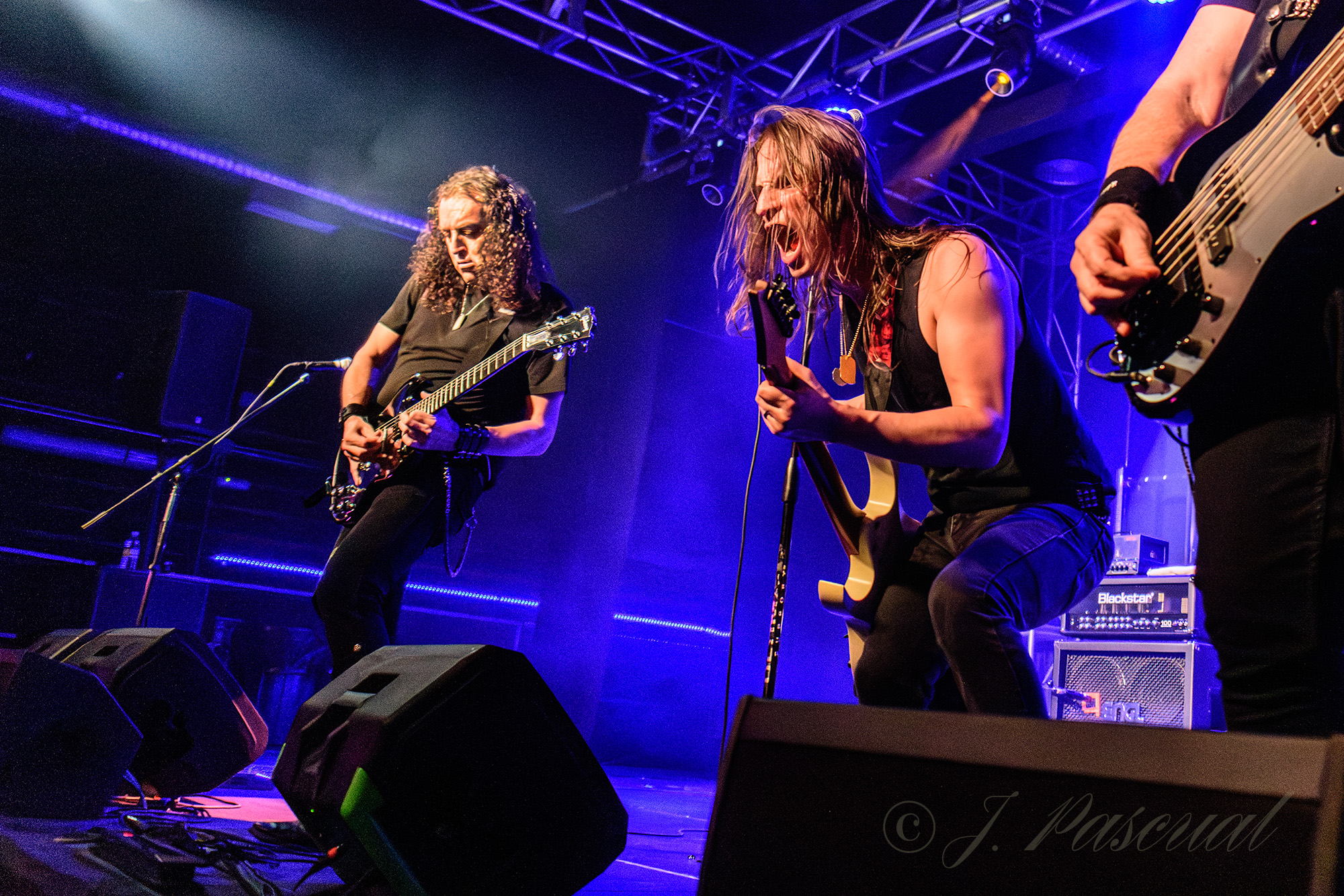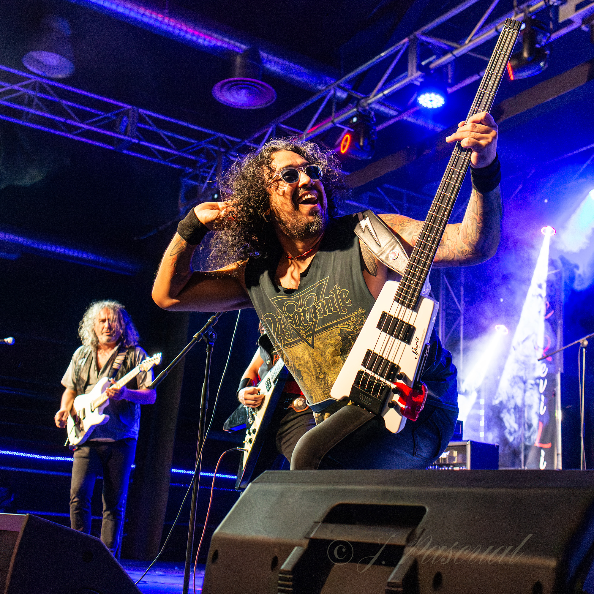 Los temas se iban sucediendo prácticamente sin tregua con una sala disfrutando de la noche, y las guitarras de Kike y Pablo totalmente enchufadas, mientras que la base rítmica de la formación se mostraba tan contundente como activa, con un Javi que al igual que Pablo, creo poder asegurar que no debieron de dejar ni un solo metro de escenario sin recorrer mientras sonaban trallazos como «Kamikaze» o «Manos Siniestras» recibidos con los puños en alto, para adentrarse ya en la recta final con «Magia» con dedicatoria especial para un familiar cercano a la pareja de Kike fallecido el día antes, para ahora ya si poner la guinda final con dos clásicos de la banda «Caballeros del Rock» y «Matar por Matar» con una nueva aparición de su particular criatura.