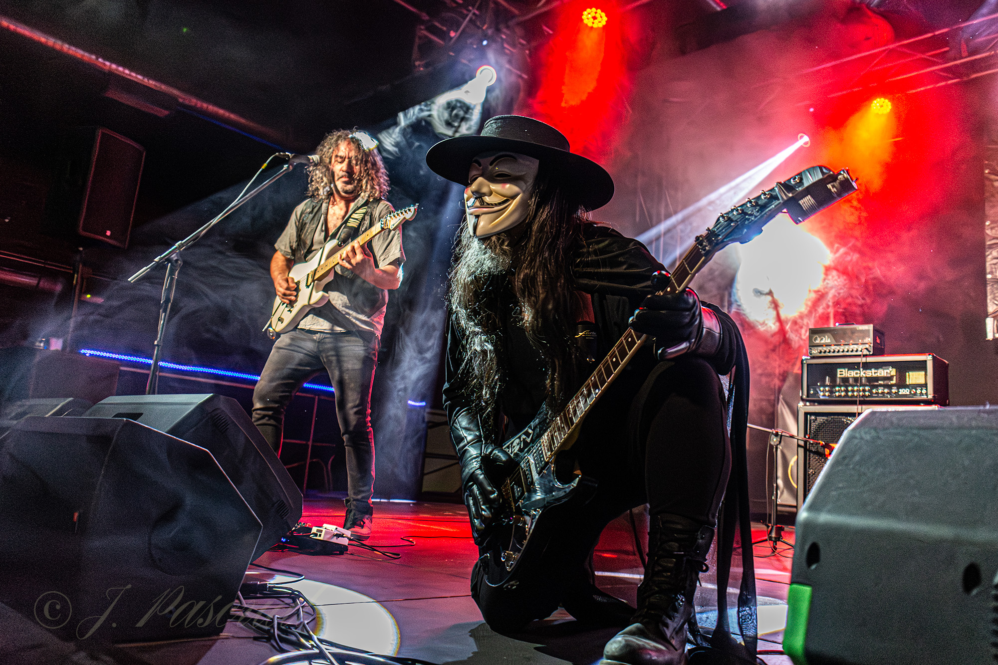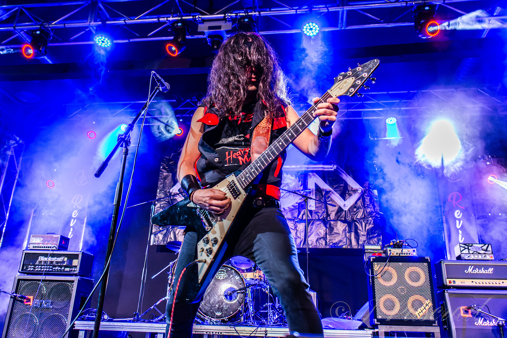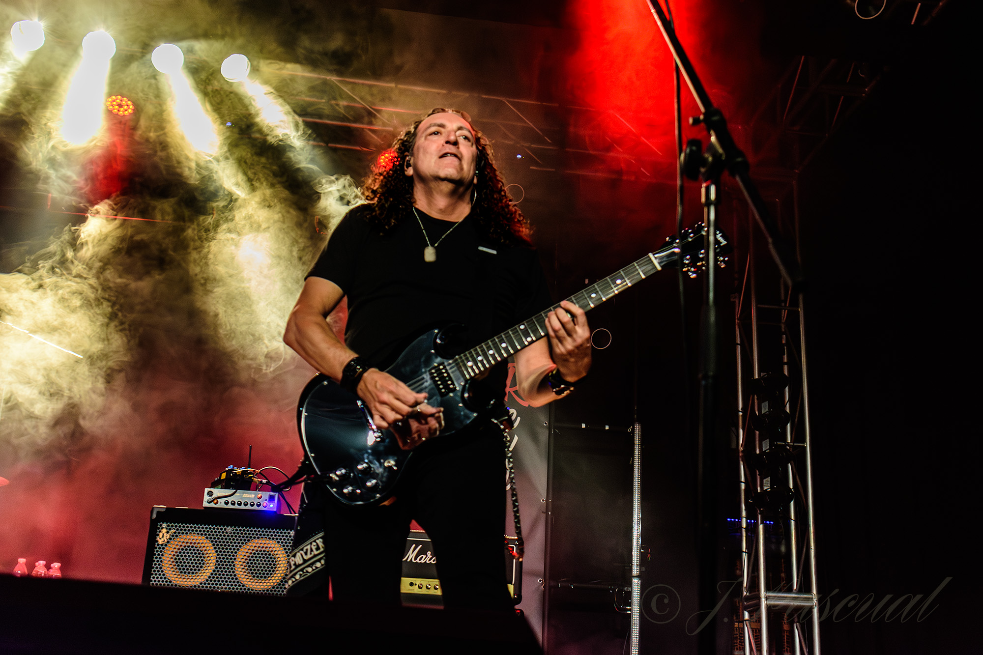 Los temas se iban sucediendo prácticamente sin tregua con una sala disfrutando de la noche, y las guitarras de Kike y Pablo totalmente enchufadas, mientras que la base rítmica de la formación se mostraba tan contundente como activa, con un Javi que al igual que Pablo, creo poder asegurar que no debieron de dejar ni un solo metro de escenario sin recorrer mientras sonaban trallazos como «Kamikaze» o «Manos Siniestras» recibidos con los puños en alto, para adentrarse ya en la recta final con «Magia» con dedicatoria especial para un familiar cercano a la pareja de Kike fallecido el día antes, para ahora ya si poner la guinda final con dos clásicos de la banda «Caballeros del Rock» y «Matar por Matar» con una nueva aparición de su particular criatura.