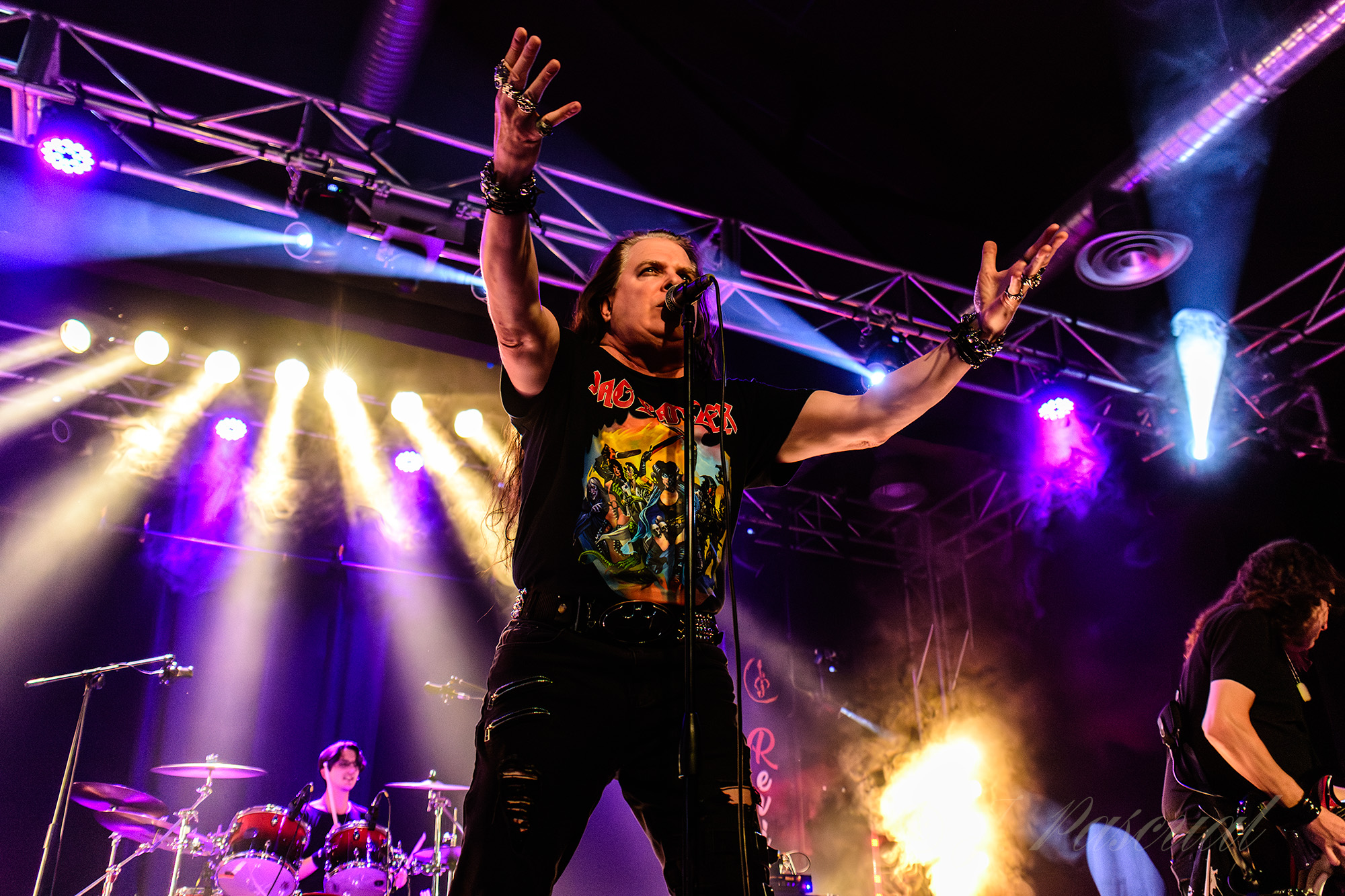 CICLÓN eran la antesala perfecta para dar comienzo a la noche, con su apuesta por los sonidos más ochenteros y clásicos de Heavy Metal, para puntuales a su cita salir haciendo honor a su nombre dispuestos a darlo todo sobre el escenario, con la garantía que da el buen sonido que suele caracterizar habitualmente a la sala, y sus veinte años sobre los escenarios. Abrían los madrileños su descarga con «Ave de Fuego» primer corte de su último trabajo Magia. «Ese es el Juego» potente y metálico tema, cuyo estribillo era repetido por una buena parte del público asistente y momento escogido para la aparición del quinto Ciclón con una de sus habituales performances, que aportan ese punto extra de teatralidad al show siempre de agradecer.