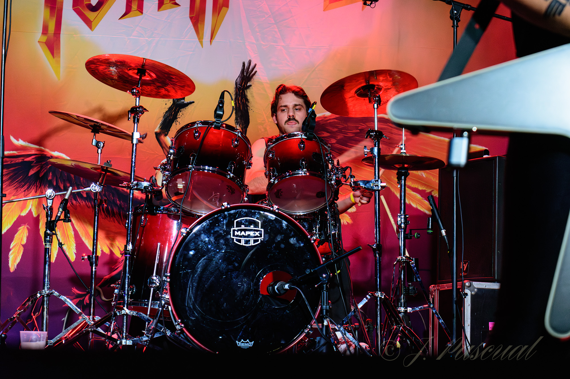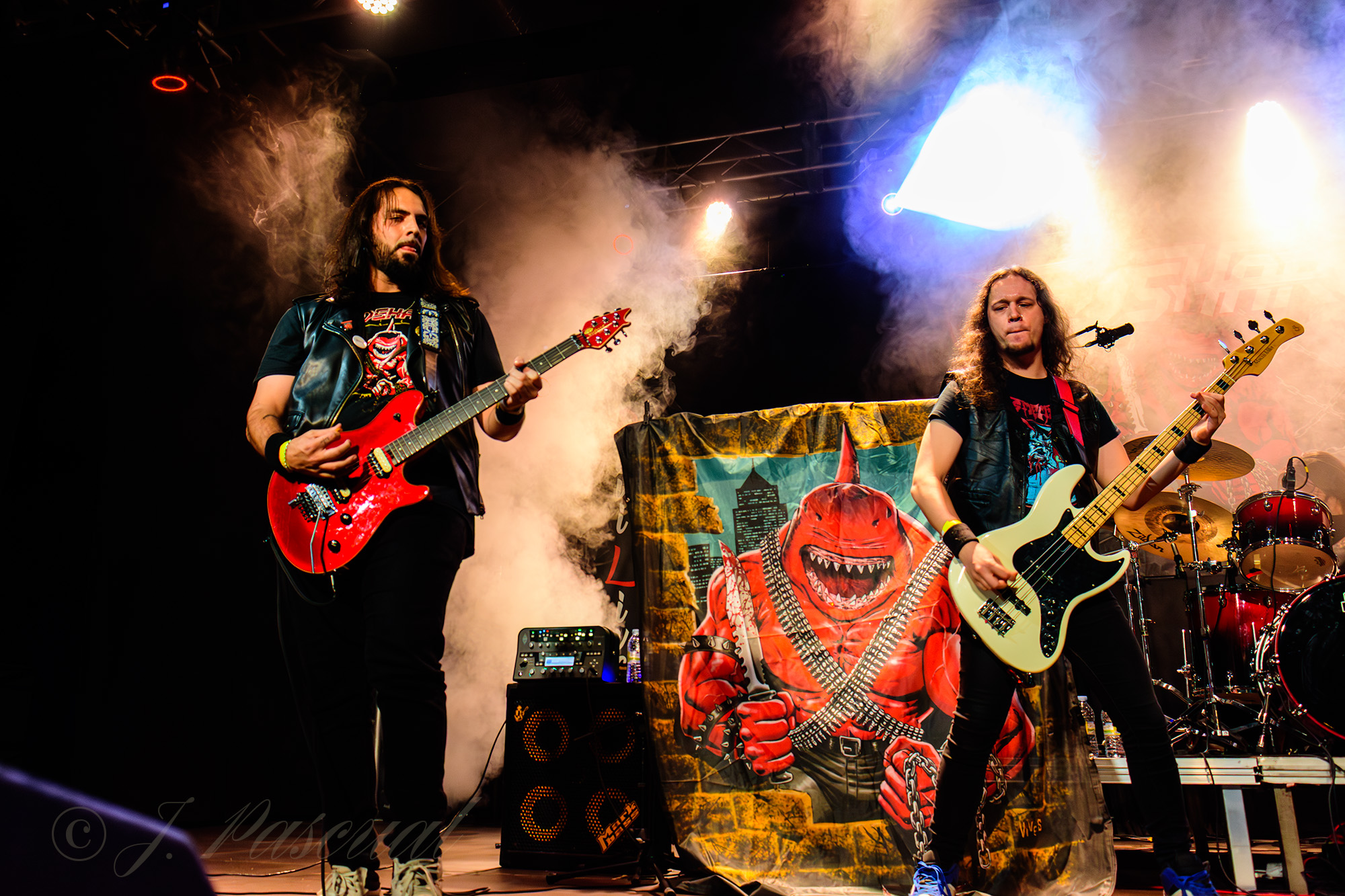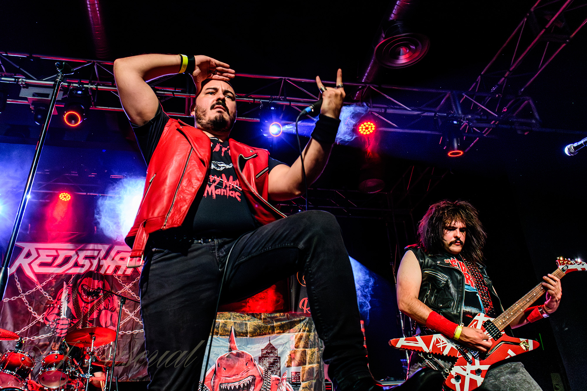 De nuevo un veloz cambio de equipo y ya teníamos sobre el escenario a los chicos de REDSHARK llegados desde tierras catalanas, la banda conformada por Pau a la voz, Philips y Javier Bono a las guitarras, Chris al bajo y Alan a la batería, llegaba pletórica y dispuesta a convencer con su apuesta por el Heavy/Speed Metal, no solo a los incondicionales de la banda, sino también al numeroso público que había acudido a la cita, con temas como «Kill Your Idoll» o «Digital Race» objetivo más que cumplido a tenor de los movimientos de cabeza y la respuesta del público, permitiéndonos también ver los derroteros en los que camina la banda, hacia un sonido aún más duro, con un pequeño adelanto de lo que será su próximo trabajo Sudden Impact «Beware The Shark», para dar por finalizada su descarga con «Stronger Than Ever».