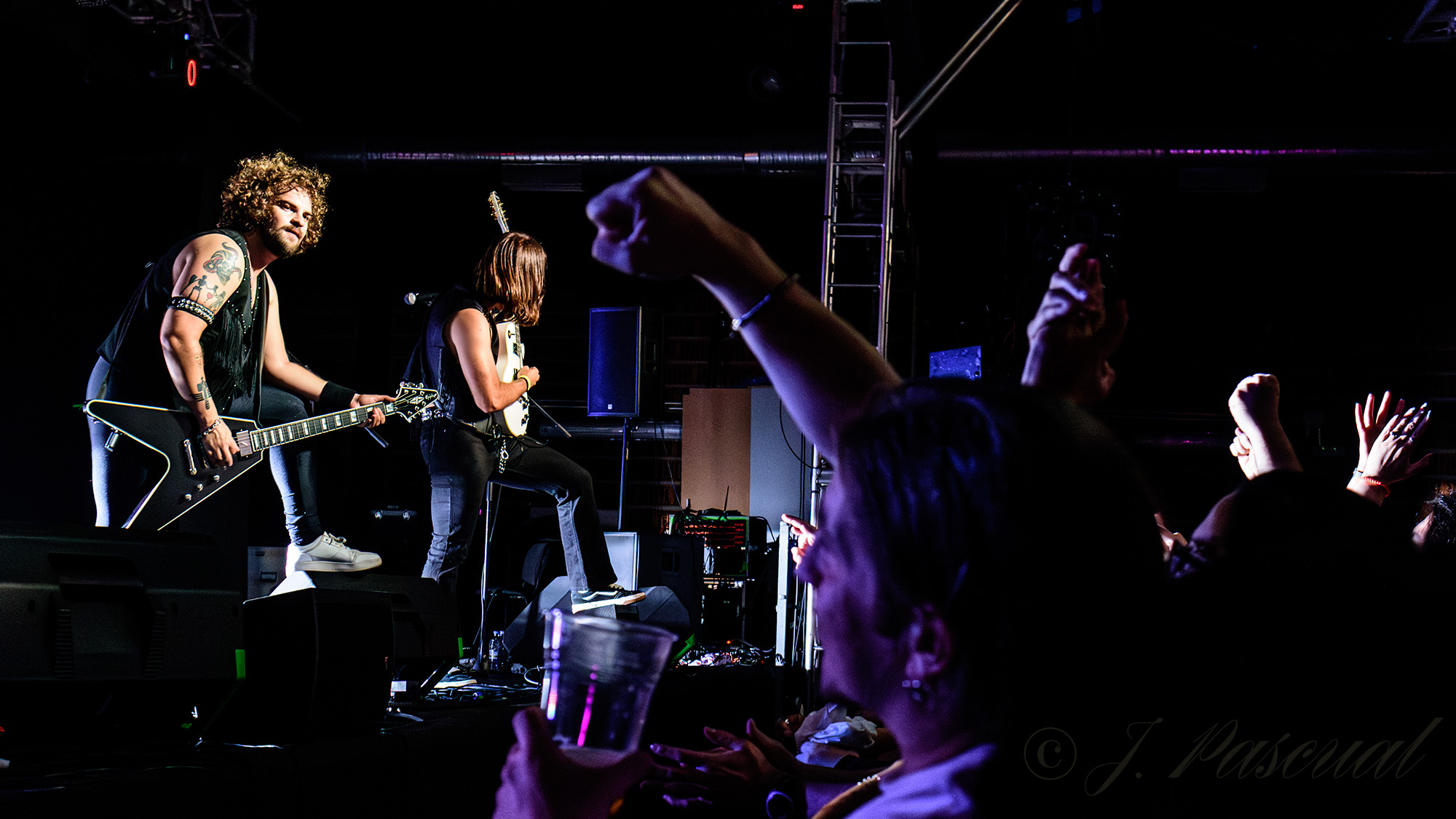 Tras un veloz cambio de equipo que casi no nos dio tiempo para apurar la bebida que disfrutábamos en la terraza de la sala, aprovechando que el día invitaba a ello, llegaba el turno de una de las bandas con un mayor número de seguidores presentes en el concierto, no en vano aparte de ser una magnífica banda, que ya a hace tiempo ha dejado de ser una promesa de futuro para convertirse en una realidad, hablamos de WILDHÄRD, que en estos días además anda con un recién estrenado trabajo bajo el brazo Love n’ lies, el primero tras el cambio de nombre y que sonaría prácticamente en su totalidad a lo largo de la noche, empezando por «Rider Of The Cold Night» para darnos un auténtico recital de Hard Rock y AOR de primer nivel, con una banda perfectamente acoplada formada por Icy Blaze a las voces, Adrian Viper y Rikk Flame a las guitarras y coros, Sergio Hunter al bajo, Edgar Venturela a la batería y la reciente incorporación de Tommy Guns a los teclados, para complementar un sexteto que derrocha juventud, pero que demuestra unas tablas y maneras sobre el escenario, con una cuidada puesta en escena y un buen bagaje musical que no dejo indiferente a nadie en la sala con temas como «Reafy for the Night» o «Endlessly» y acabar ovacionados por el público con «Midnight Lover»