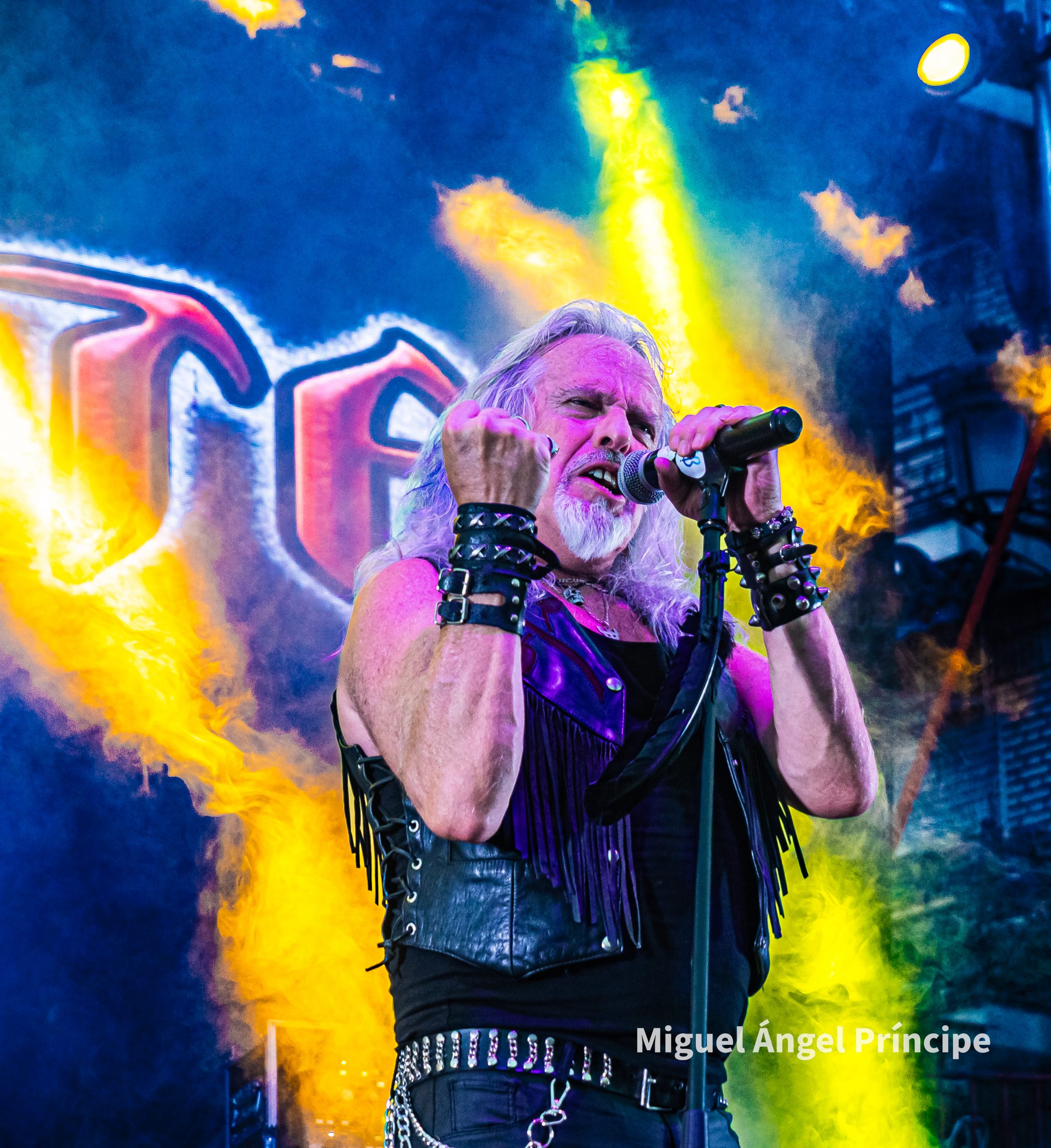 Tras ese triste y emotivo momento, llegaba el momento de un veterano músico de nuestra escena que ya ha pisado en más de una ocasión el escenario de Tajuña, hablamos de SILVER, legendaria voz de MURO, que arrancaría con «Telón de Acero» y cuya descarga nos dejaría una buena dosis de temas míticos de MURO como «Traidor» o «Corazón de Metal» y un par de emotivos momentos como la dedicatoria de «La Voz’ a tres de los grandes y tristemente desaparecidos Dio, Lemmy y Ozzy, y otro con una gran carga de sentimental personal para el propio Silver al cumplir un sueño el poder tocar junto a su hijo Ian que se hacía cargo de la batería para interpretar junto al resto de la banda «En Llamas» penúltimo tema de la noche antes de acabar la noche con un imprescindible «Mirada Asesina»